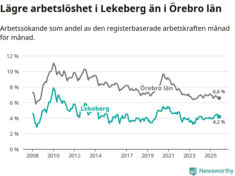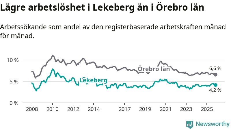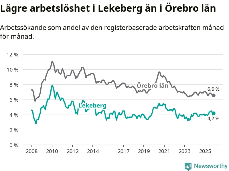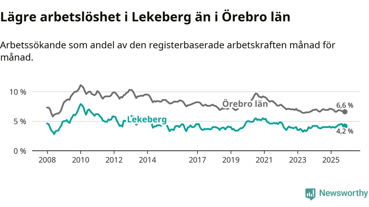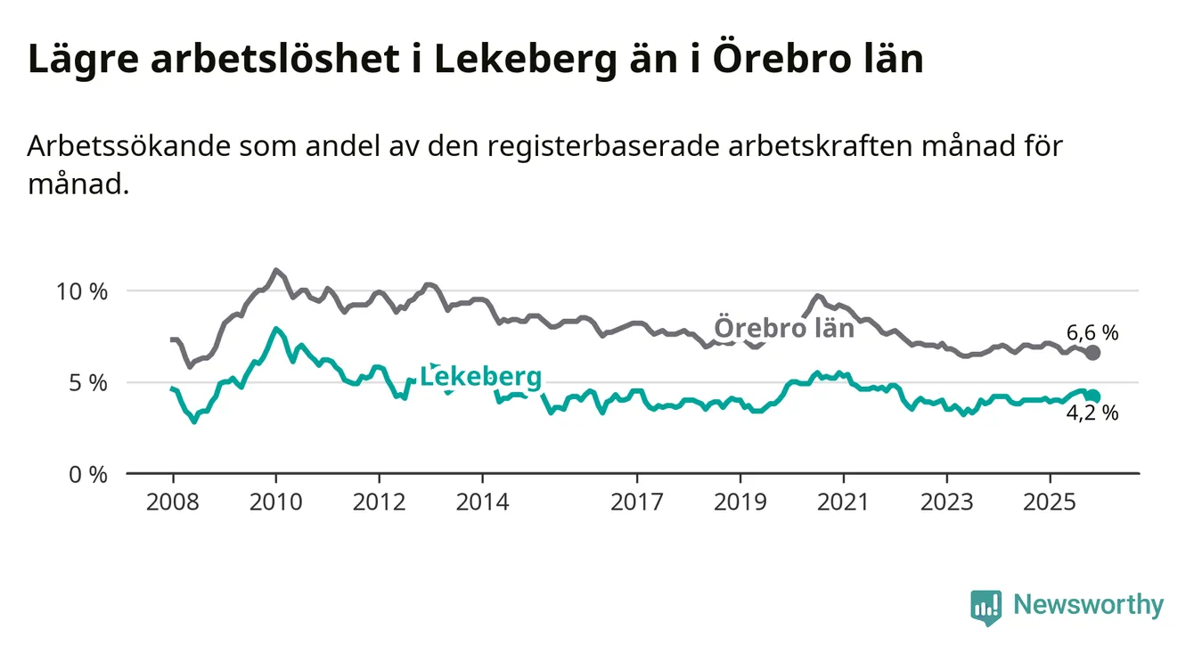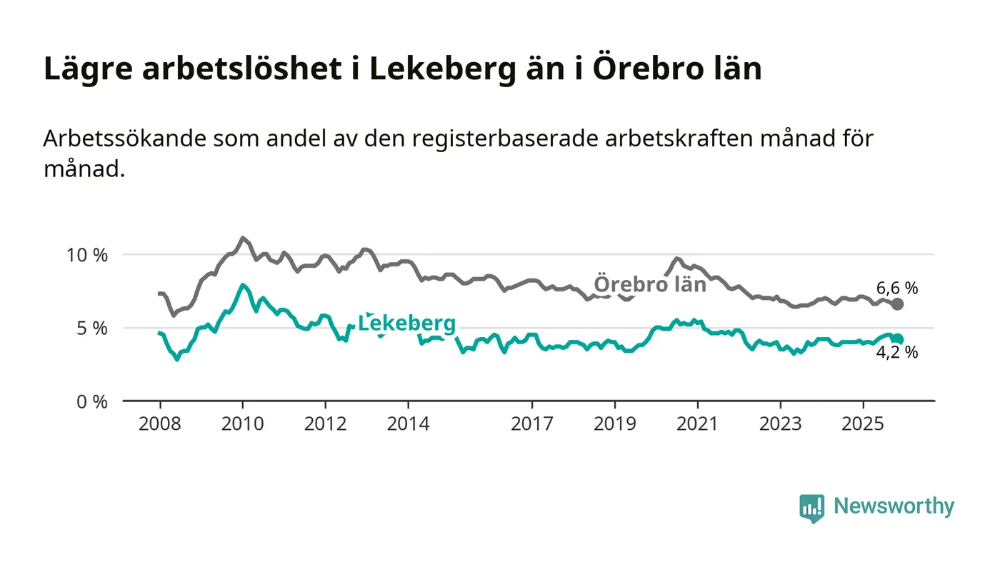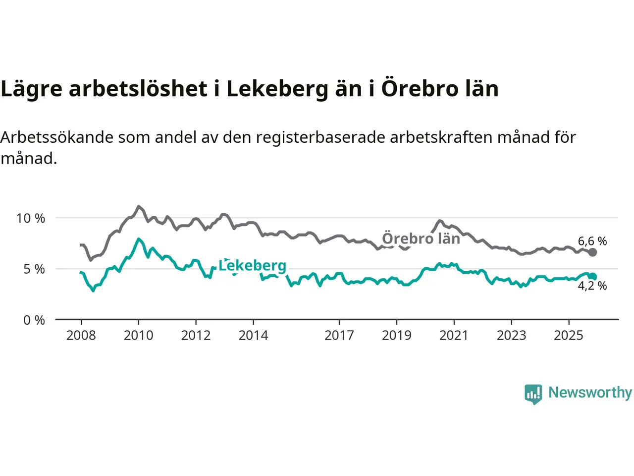 Under november månad rapporterade Lekebergs kommun en total arbetslöshet på 4,2 procent. Det är en ökning jämfört med samma tidpunkt i fjol (+0,2 procentenheter). I Örebro län däremot sjunker arbetslösheten .