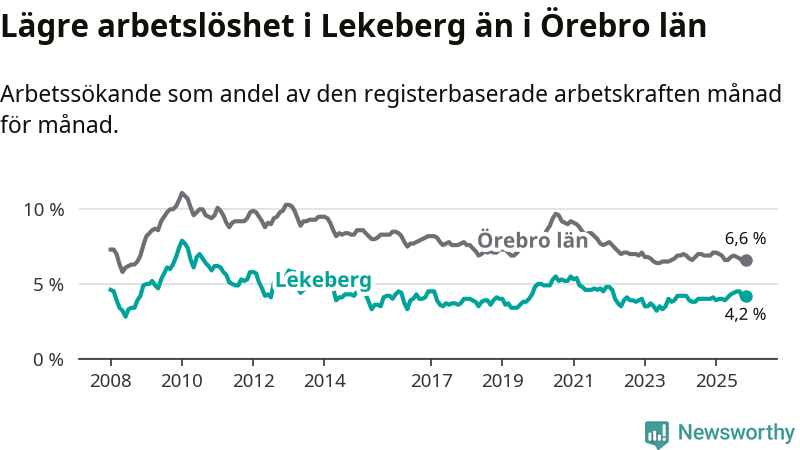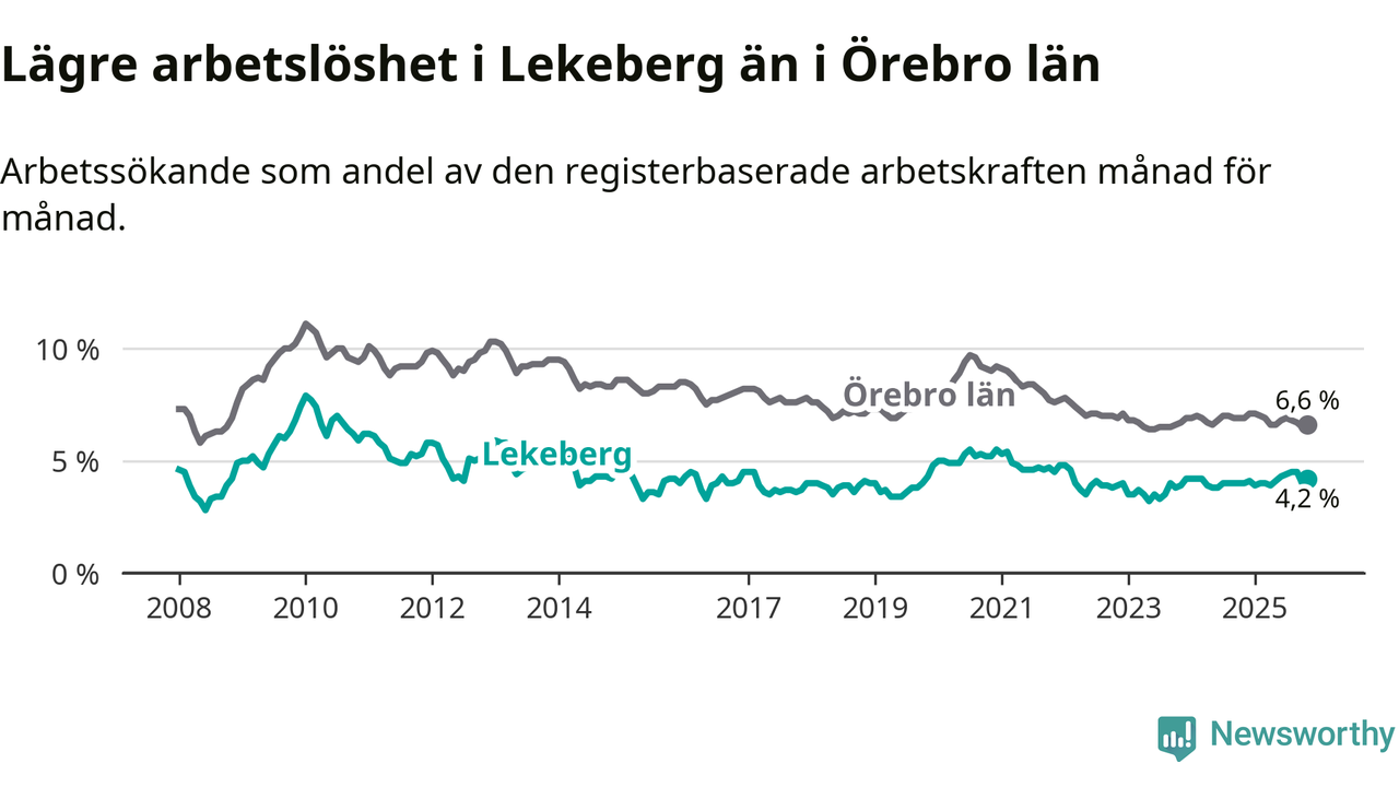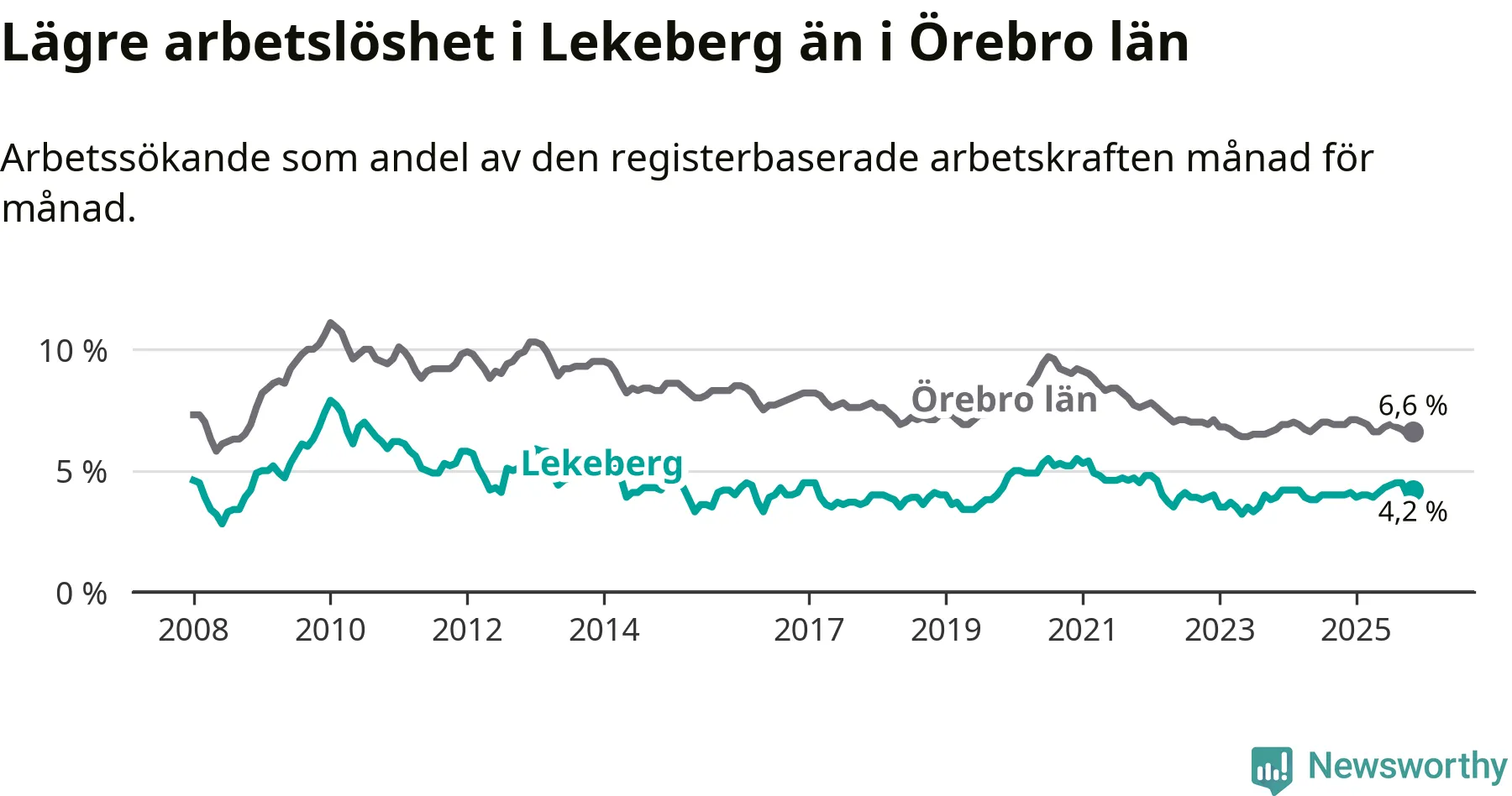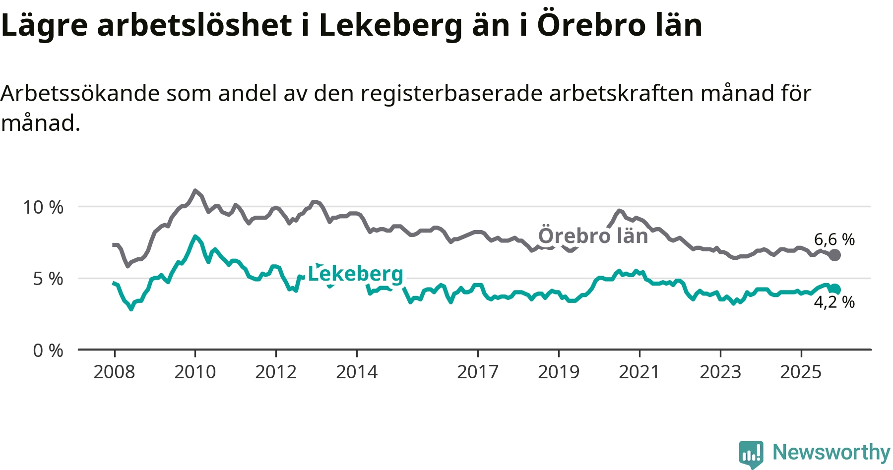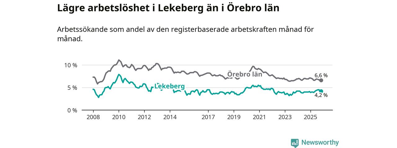 Även om arbetslösheten i Lekeberg alltså ökar, så ligger den fortfarande under snittet i hela Örebro län (4,2 procent i kommunen, jämfört med 6,6 procent i hela länet). Askersund har den lägsta arbetslösheten i länet (4,1 procent), medan Örebro har den högsta (7,4 procent).