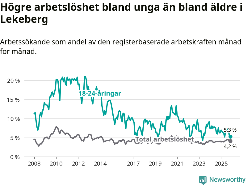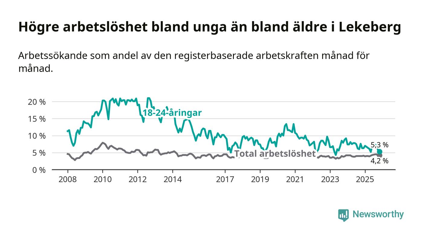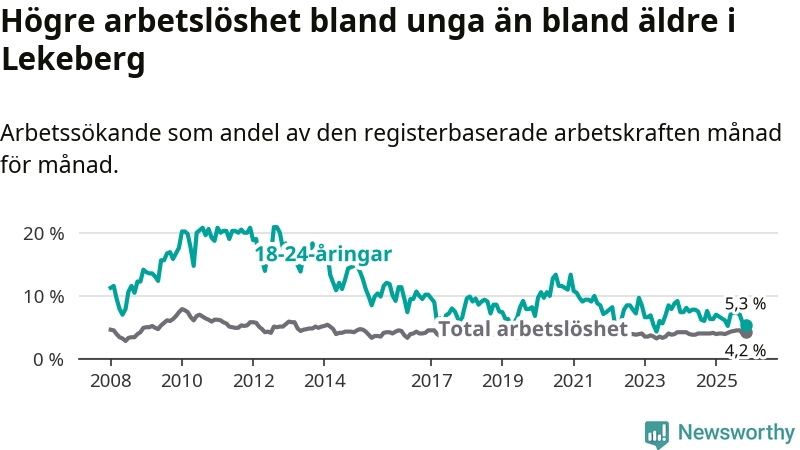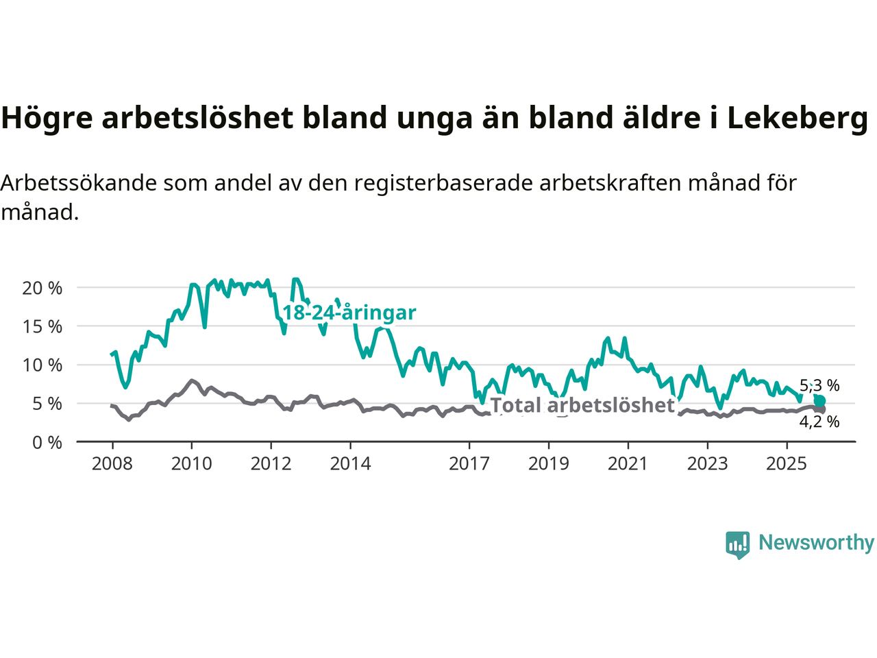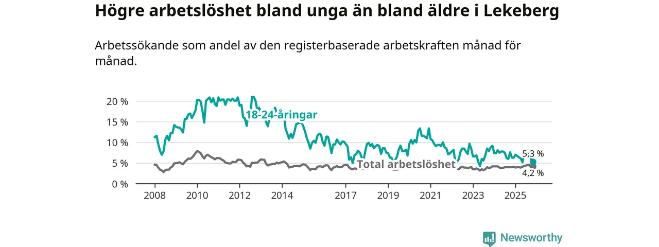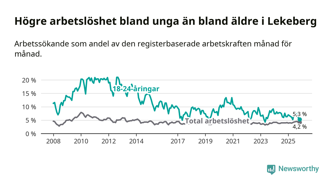 Till skillnad från den totala arbetslösheten sjunker arbetslösheten bland unga (−1 procentenheter). I november var 5,3 procent av 18–24-åringarna inskrivna som arbetssökande (motsvarande 16 personer). Mäter vi antalet inskrivna ser vi en minskning med fyra personer på ett års sikt.