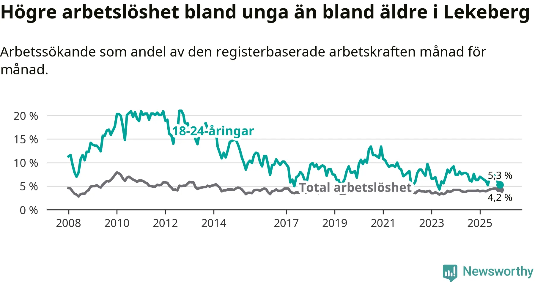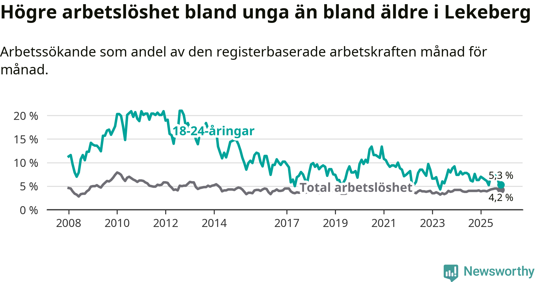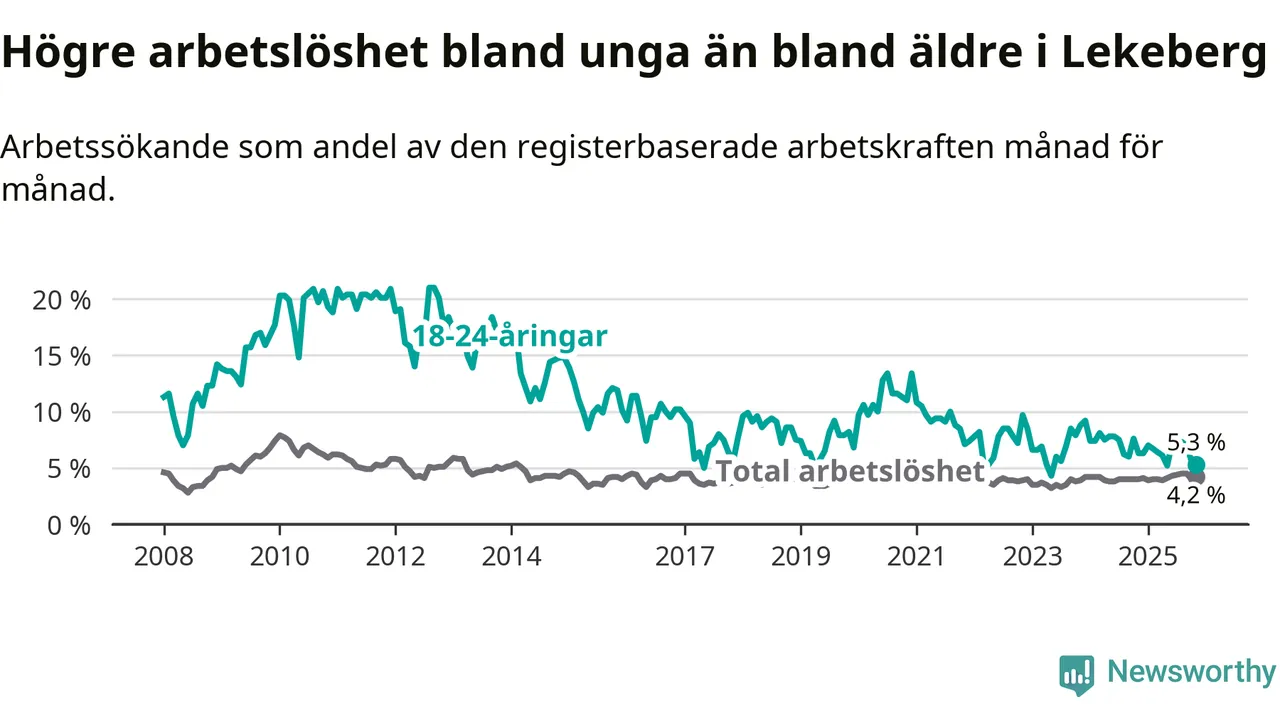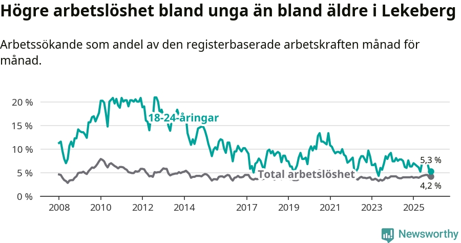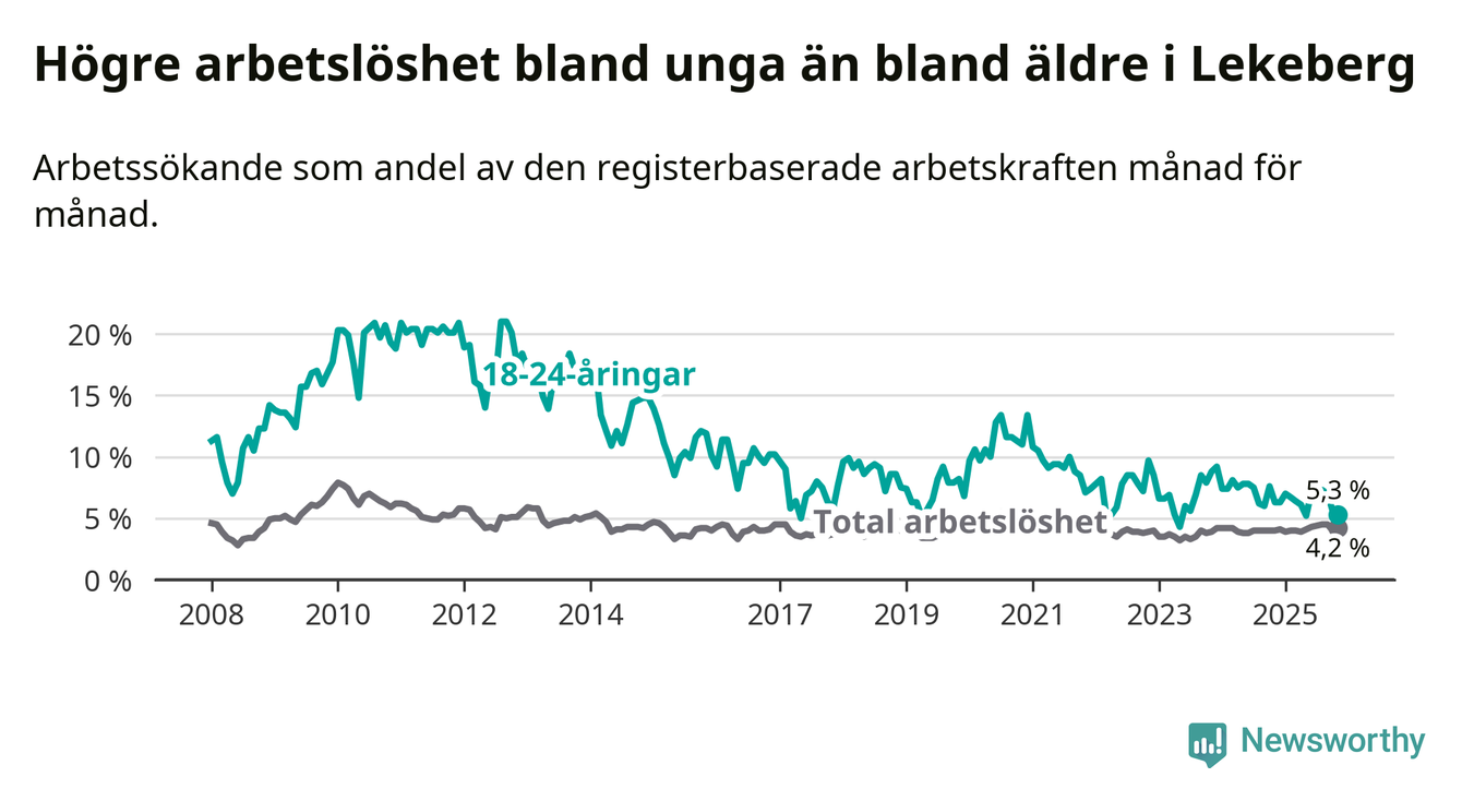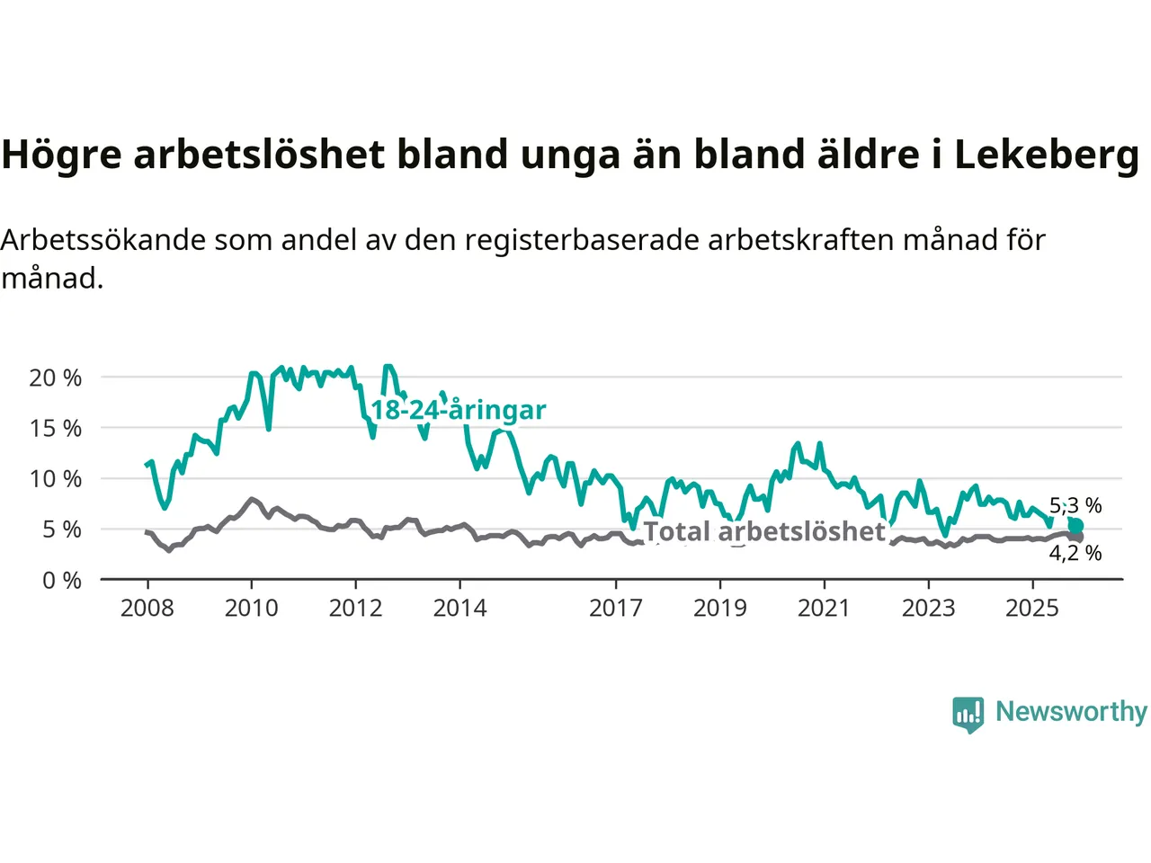 Till skillnad från den totala arbetslösheten sjunker arbetslösheten bland unga (−1 procentenheter). I november var 5,3 procent av 18–24-åringarna inskrivna som arbetssökande (motsvarande 16 personer). Mäter vi antalet inskrivna ser vi en minskning med fyra personer på ett års sikt.