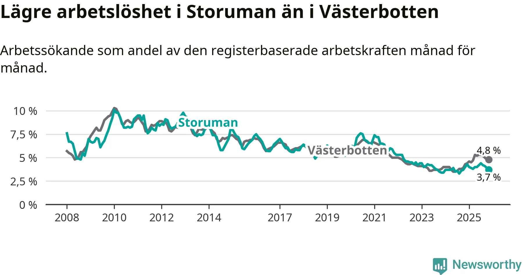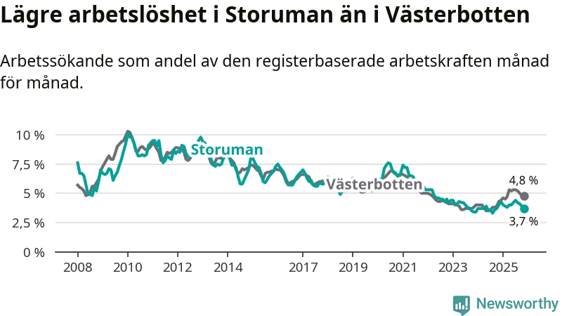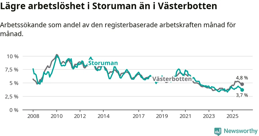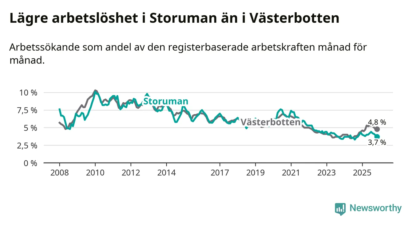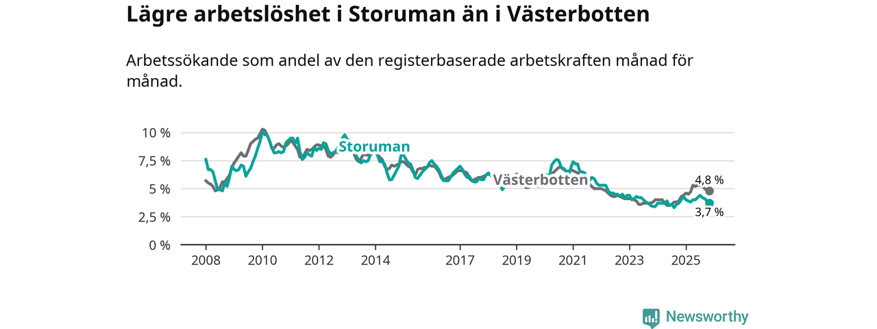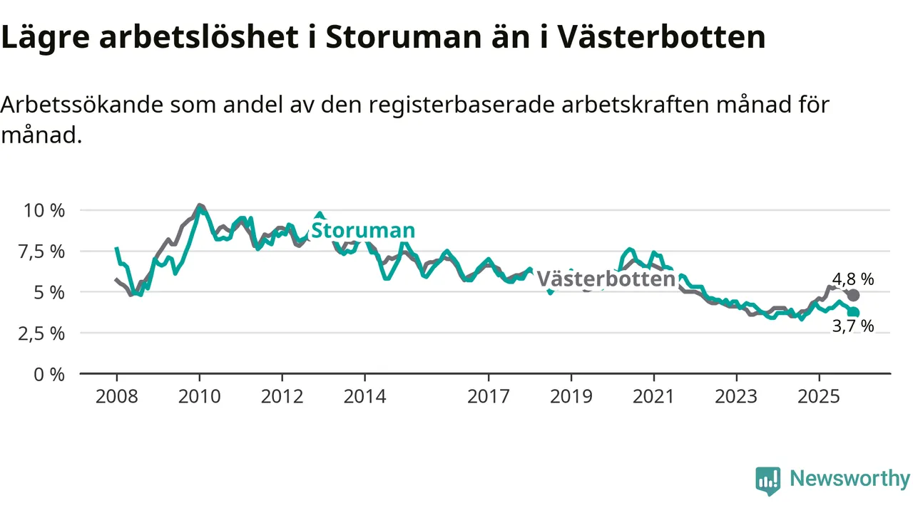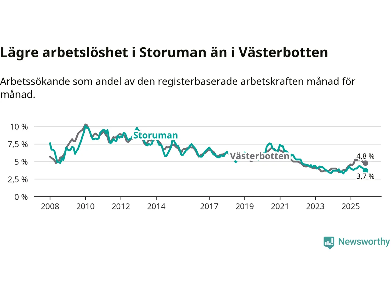 Under november månad rapporterade Storumans kommun en total arbetslöshet på 3,7 procent. Det är en minskning jämfört med samma tidpunkt i fjol (−0,3 procentenheter). I Västerbottens län däremot stiger arbetslösheten .