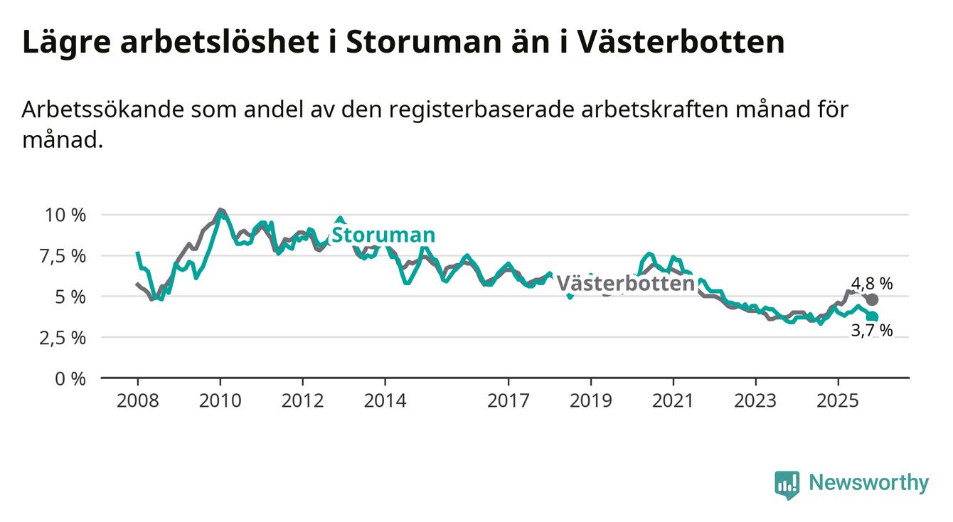 Storuman hade redan tidigare lägre arbetslöshet än snittet i hela Västerbottens län och nu växer klyftan (3,7 procent i kommunen, jämfört med 4,8 procent i hela länet). Sorsele har den lägsta arbetslösheten i länet (2,4 procent), medan Skellefteå har den högsta (6,3 procent). För att Storuman skulle komma ner i samma arbetslöshetsnivå som Sorsele skulle 33 personer behöva sysselsättas.