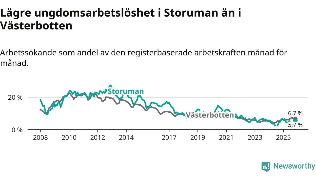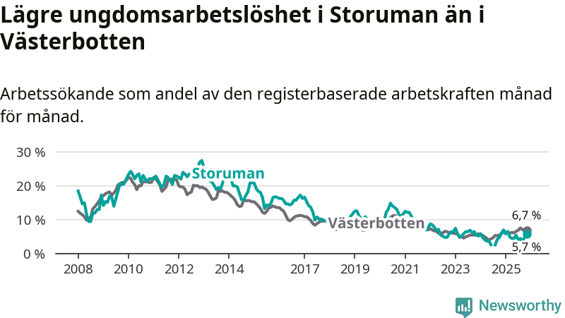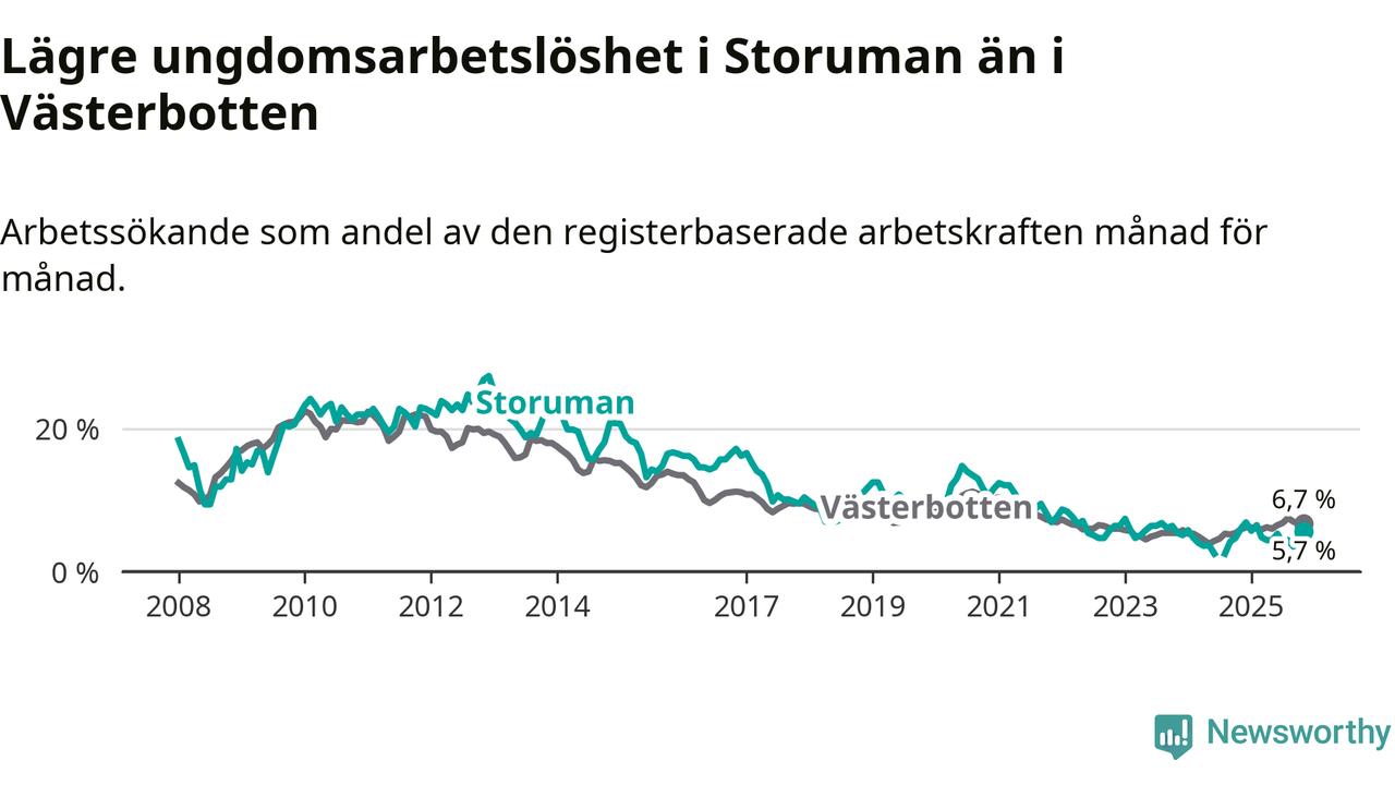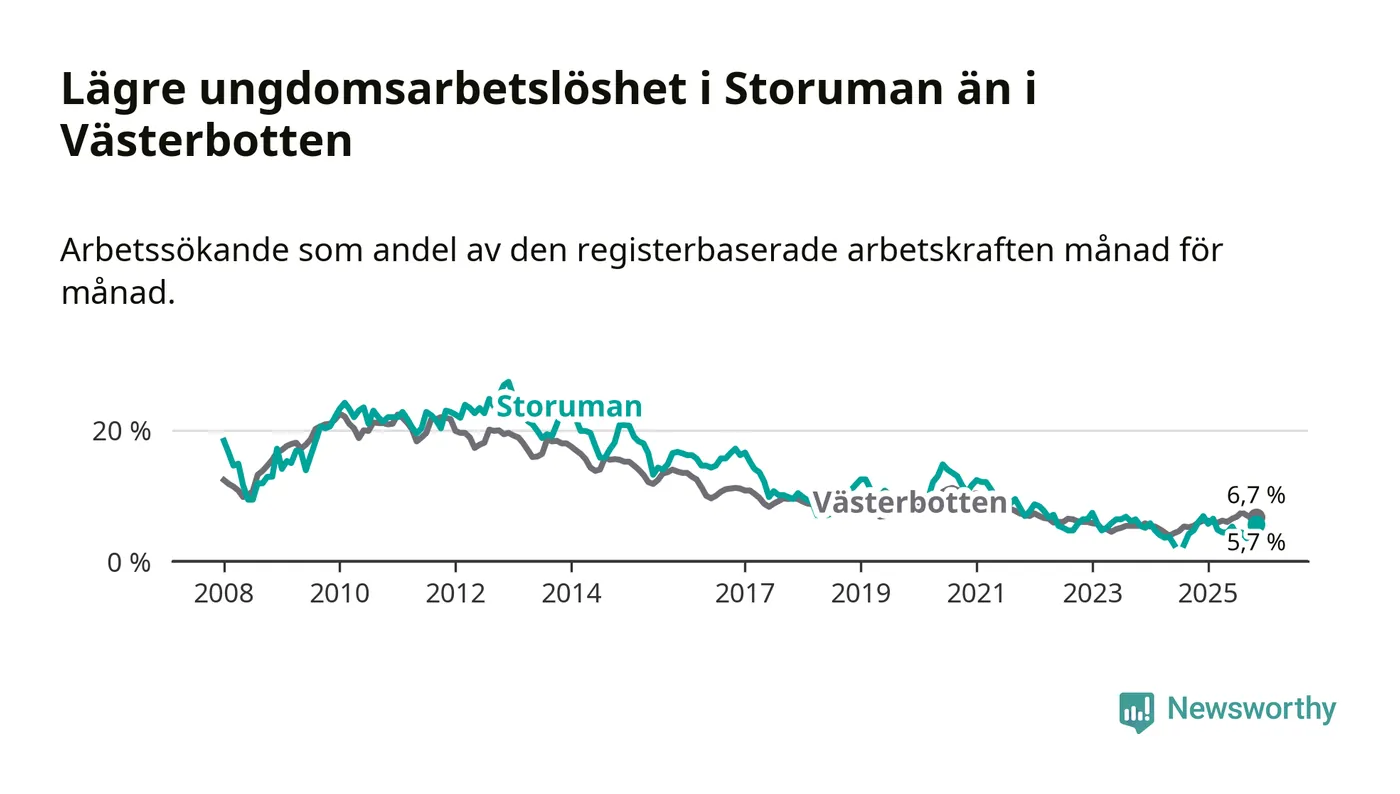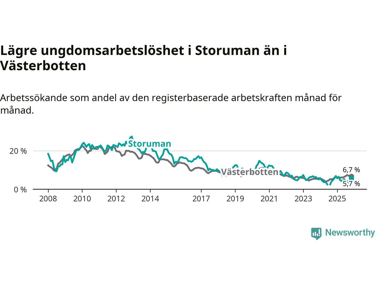 Precis som den totala arbetslösheten ligger ungdomsarbetslösheten i Storuman lägre än i Västerbotten som helhet. Skillnaden mellan kommunen och länet är 1,0 procentenheter.
