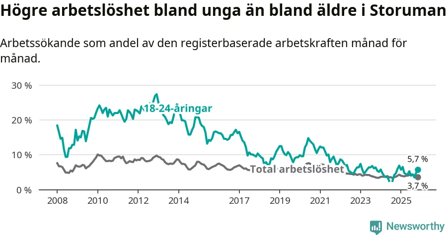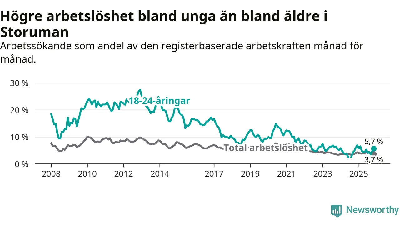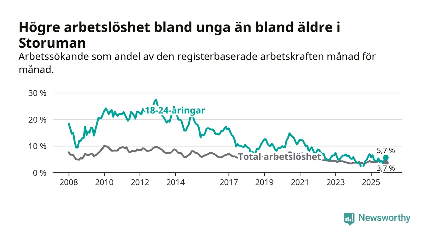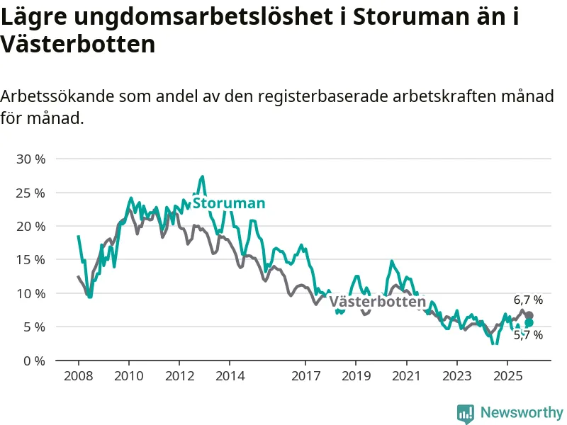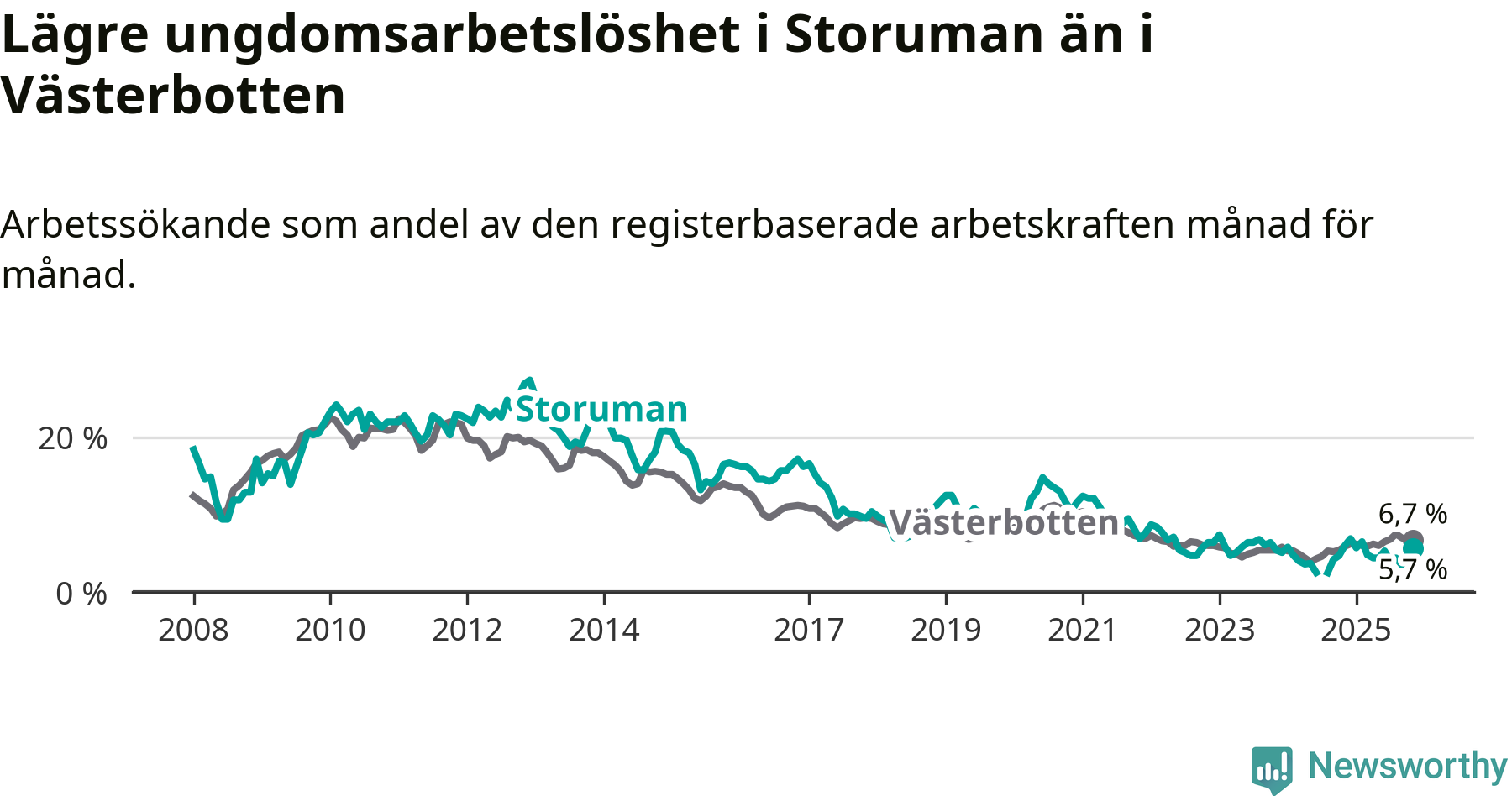 Precis som den totala arbetslösheten ligger ungdomsarbetslösheten i Storuman lägre än i Västerbotten som helhet. Skillnaden mellan kommunen och länet är 1,0 procentenheter.