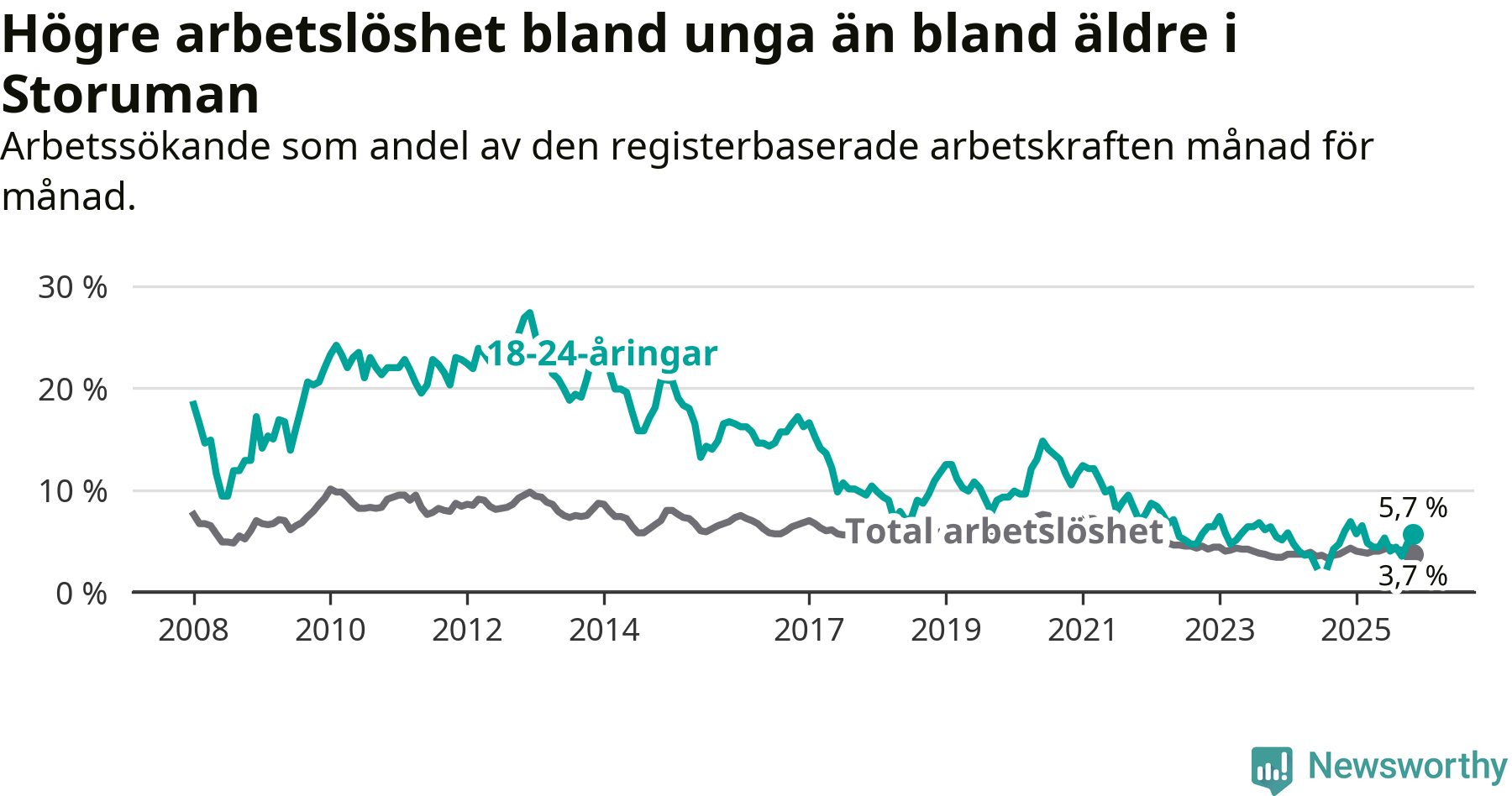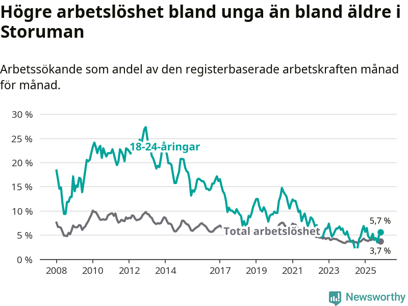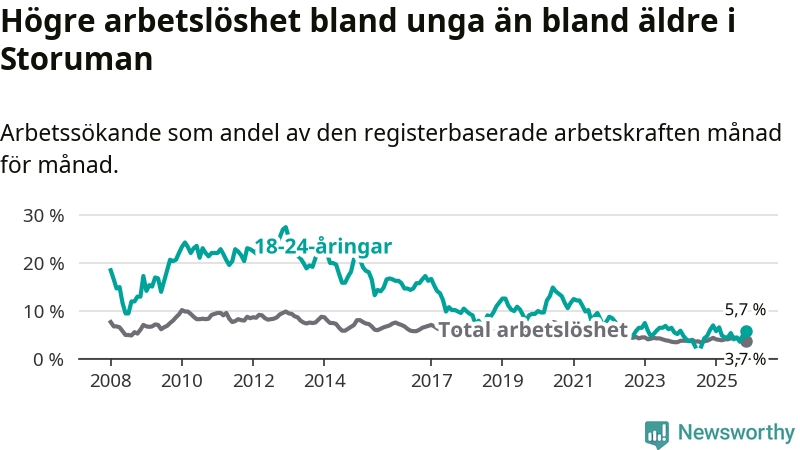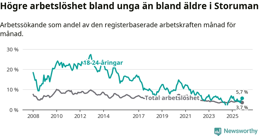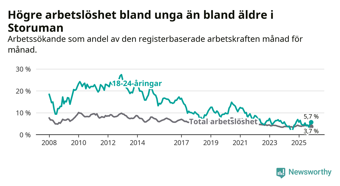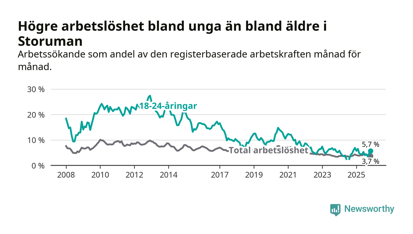 Precis som den totala arbetslösheten ligger ungdomsarbetslösheten i Storuman lägre än i Västerbotten som helhet. Skillnaden mellan kommunen och länet är 1,0 procentenheter.
