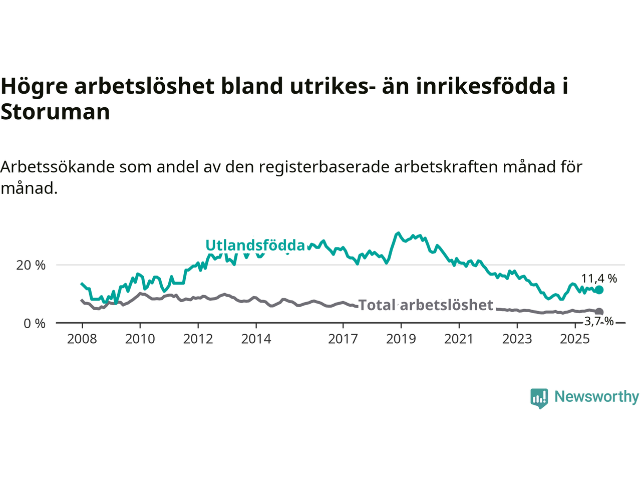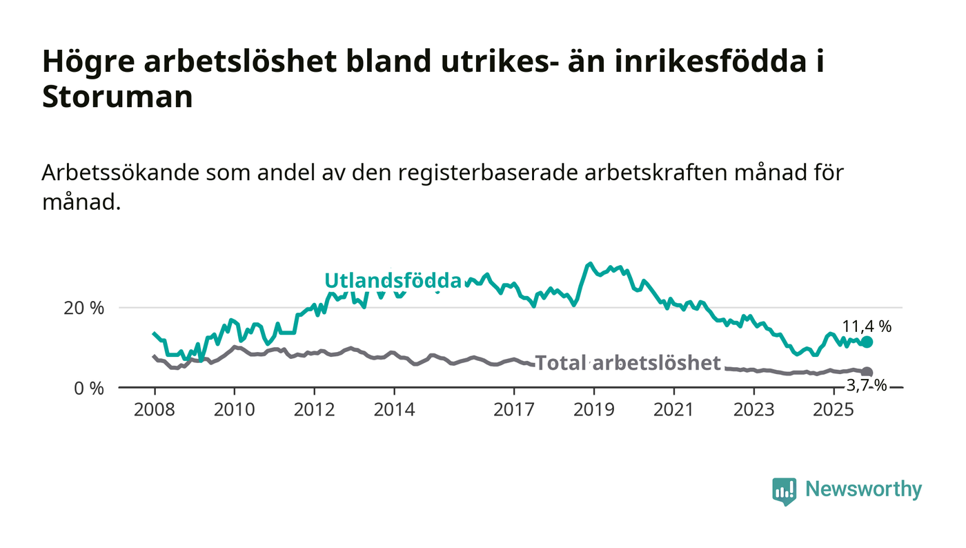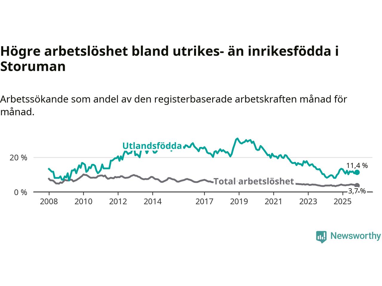Arbetslösheten bland utlandsfödda var 11,4 procent i Storuman under november månad, motsvarande 34 av 298 personer. Det är 1,3 procentenheter färre än vid samma tidpunkt i fjol (−3 om man räknar personer). Den senaste månadens nedgång innebär ett trendbrott. Under de tolv föregående månaderna hade arbetslösheten bland utlandsfödda varit högre än motsvarande tidpunkt året innan.