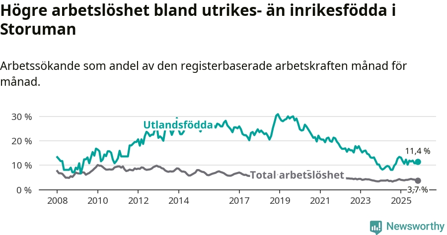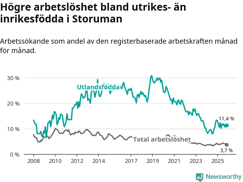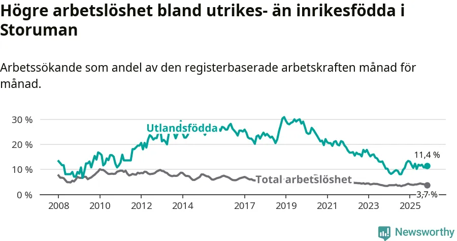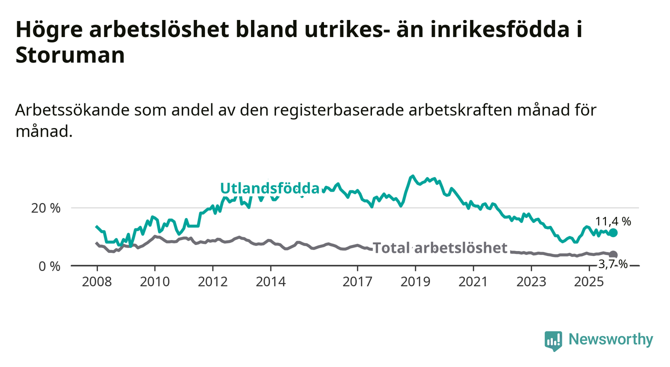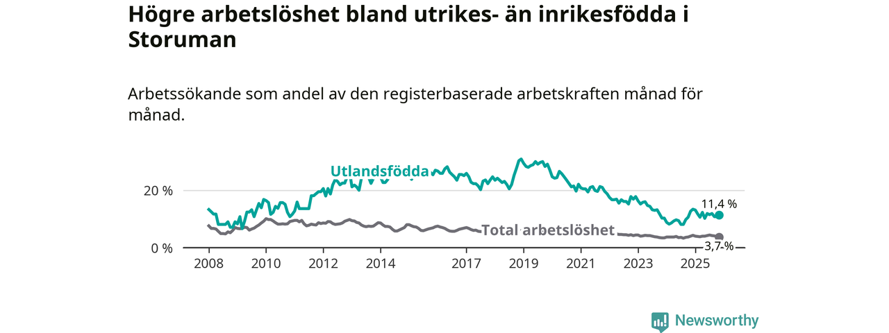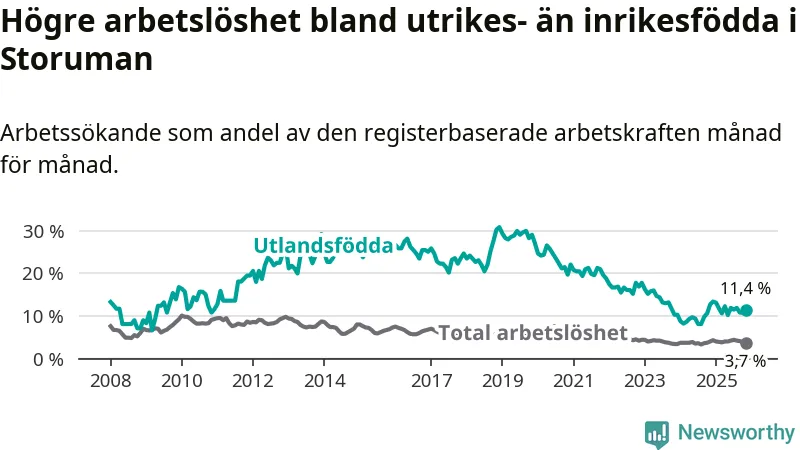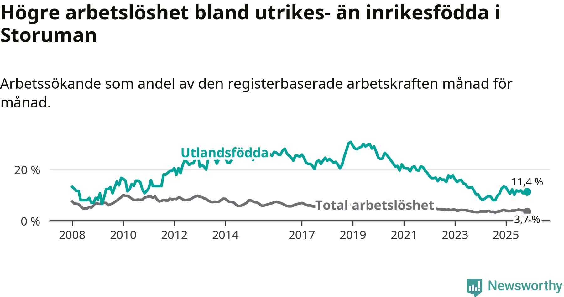 Arbetslösheten bland utlandsfödda var 11,4 procent i Storuman under november månad, motsvarande 34 av 298 personer. Det är 1,3 procentenheter färre än vid samma tidpunkt i fjol (−3 om man räknar personer). Den senaste månadens nedgång innebär ett trendbrott. Under de tolv föregående månaderna hade arbetslösheten bland utlandsfödda varit högre än motsvarande tidpunkt året innan.