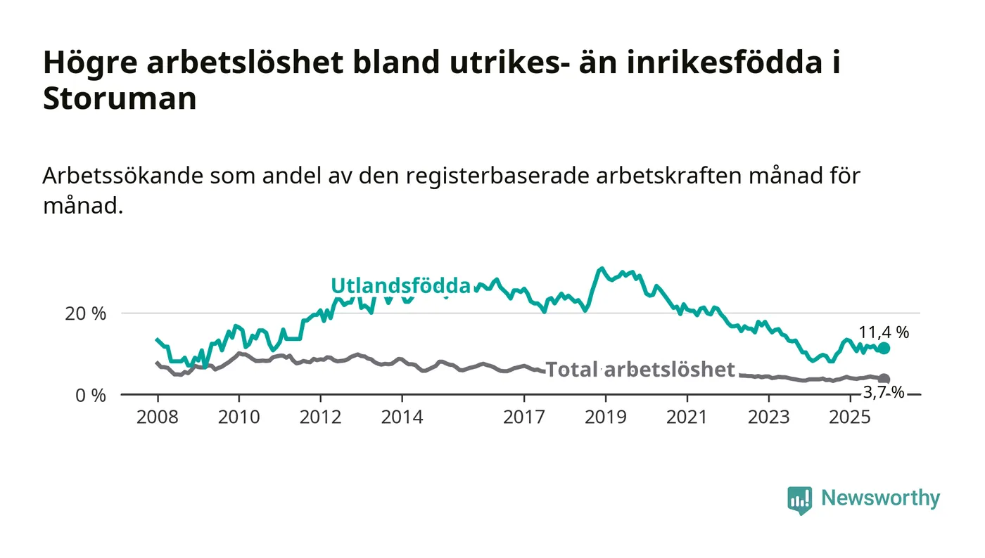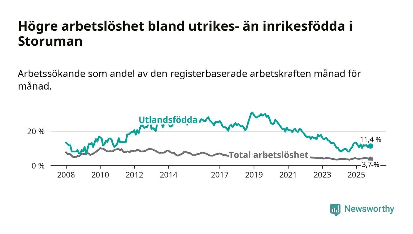 Skillnaden i arbetslöshet mellan utrikesfödda och hela befolkningen är 7,7 procentenheter i Storuman. Det är en mindre skillnad än för ett år sedan (−1,0 procentenheter).