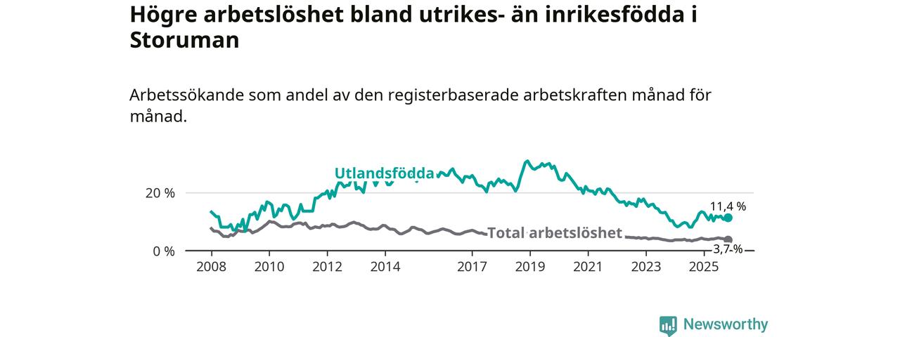 | Bland utlandsfödda | 11,4 % | −1,3 % ▼ | 11,7 % | +0,6 % ▲ | 14,3 % | −1,1 % ▼ |