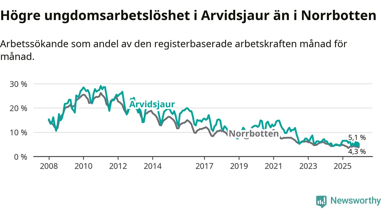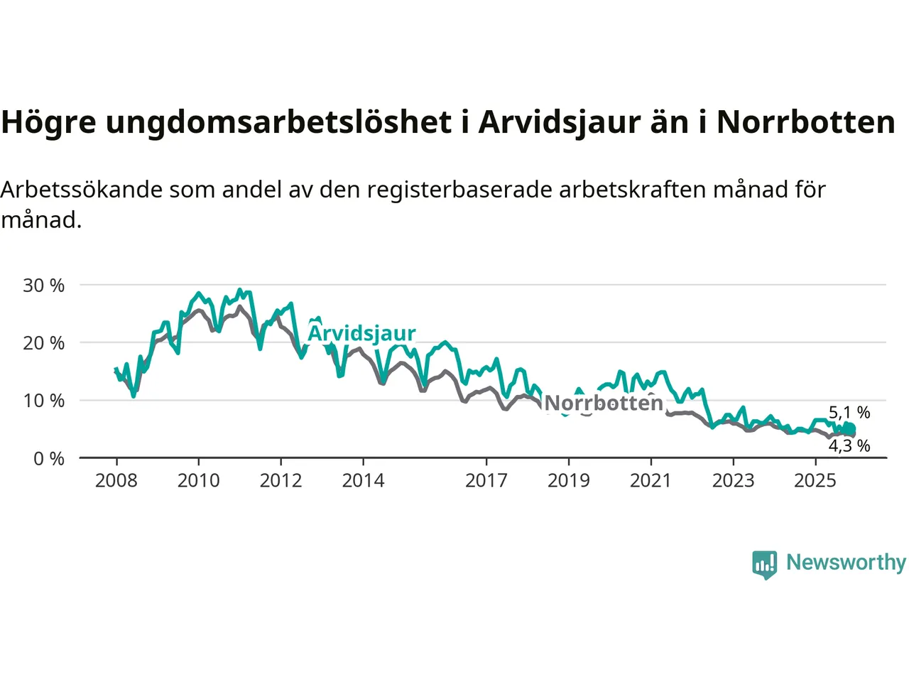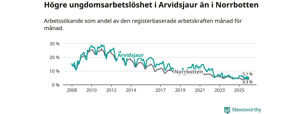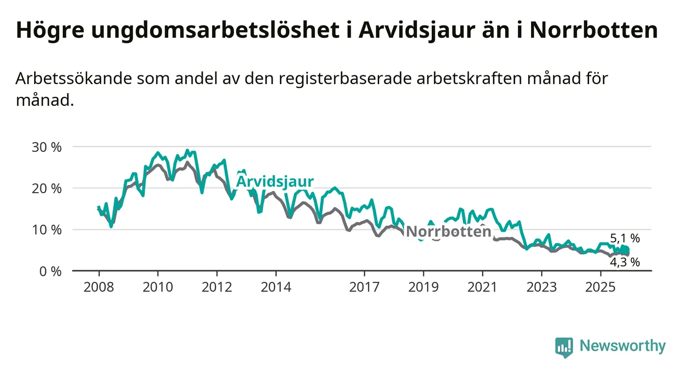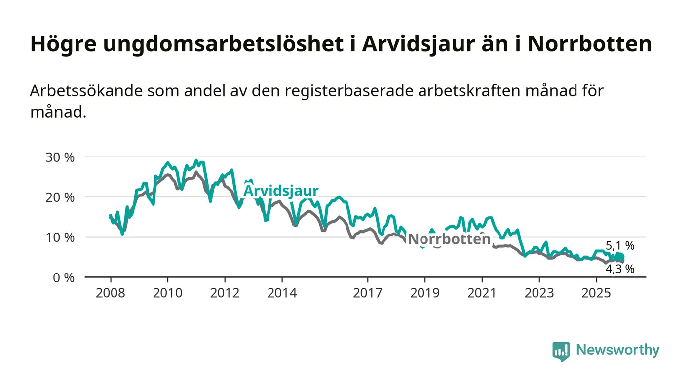 Medan Arvidsjaur har lägre total arbetslöshet än Norrbotten, ligger ungdomsarbetslösheten 0,8 procentenheter högre i Arvidsjaur.