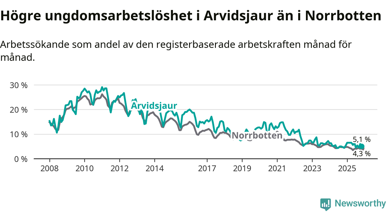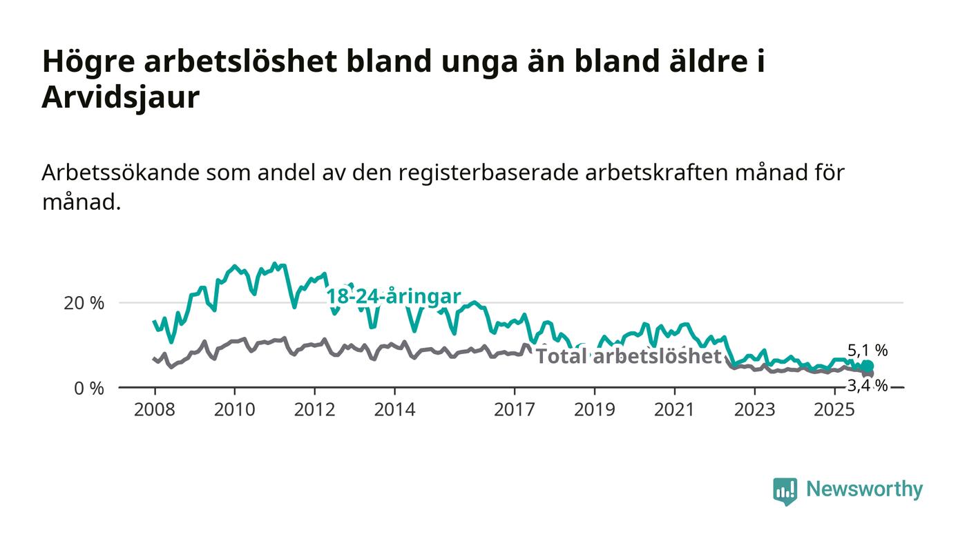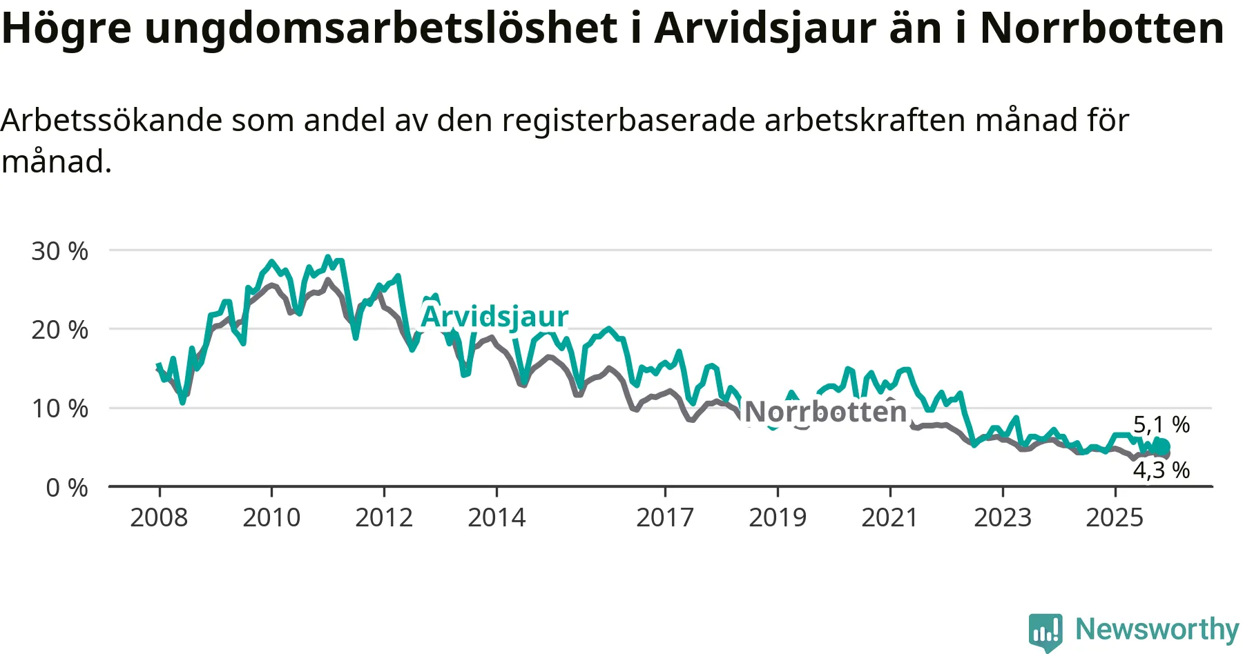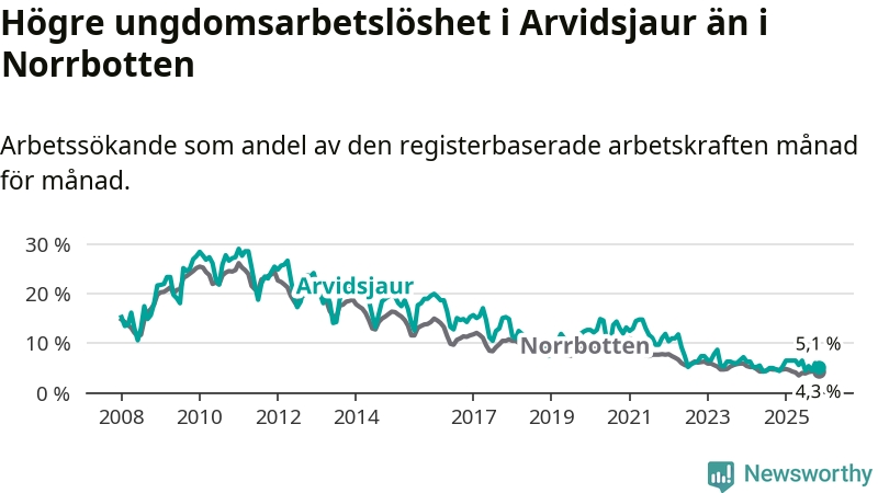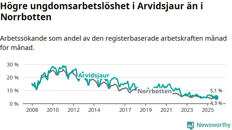 Medan Arvidsjaur har lägre total arbetslöshet än Norrbotten, ligger ungdomsarbetslösheten 0,8 procentenheter högre i Arvidsjaur.