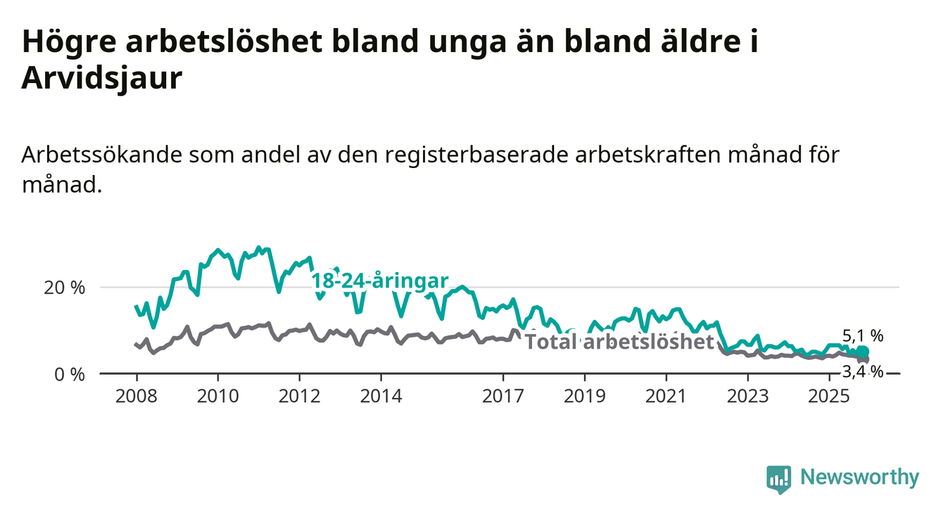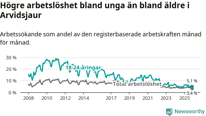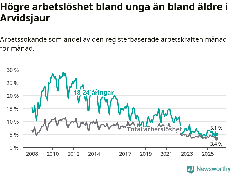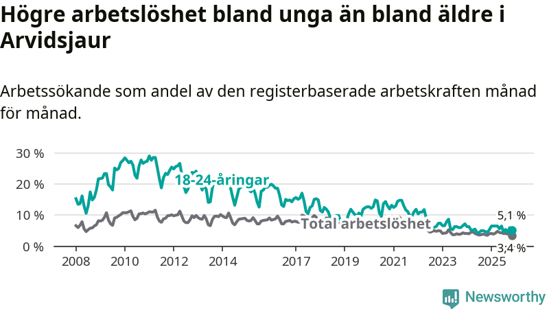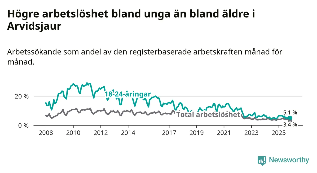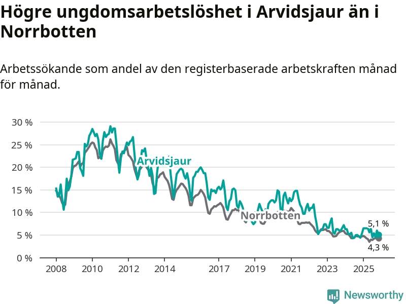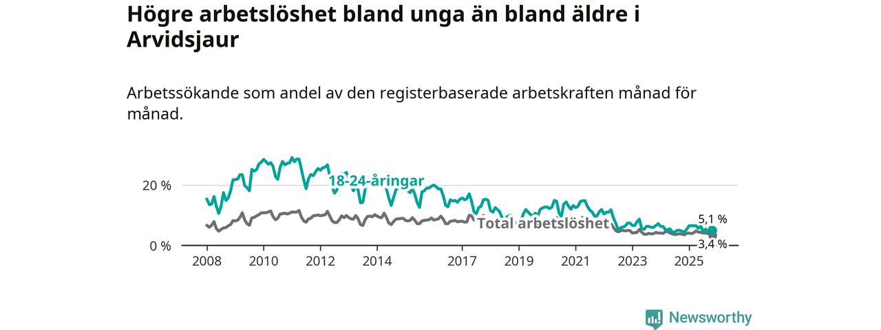 Medan Arvidsjaur har lägre total arbetslöshet än Norrbotten, ligger ungdomsarbetslösheten 0,8 procentenheter högre i Arvidsjaur.