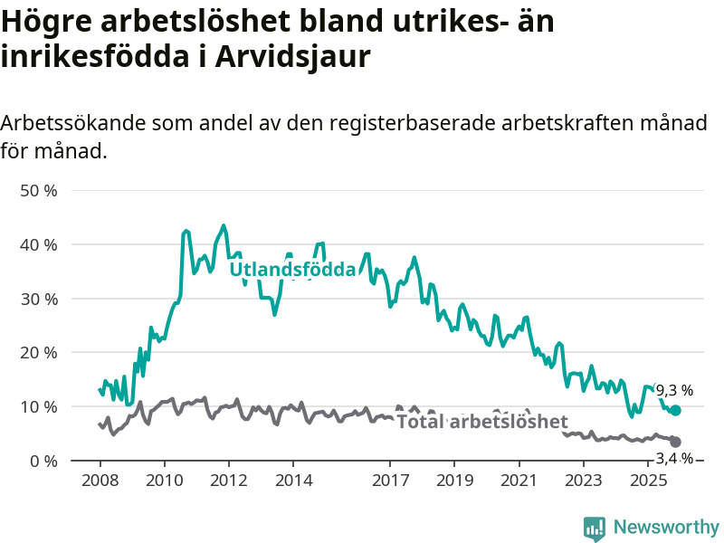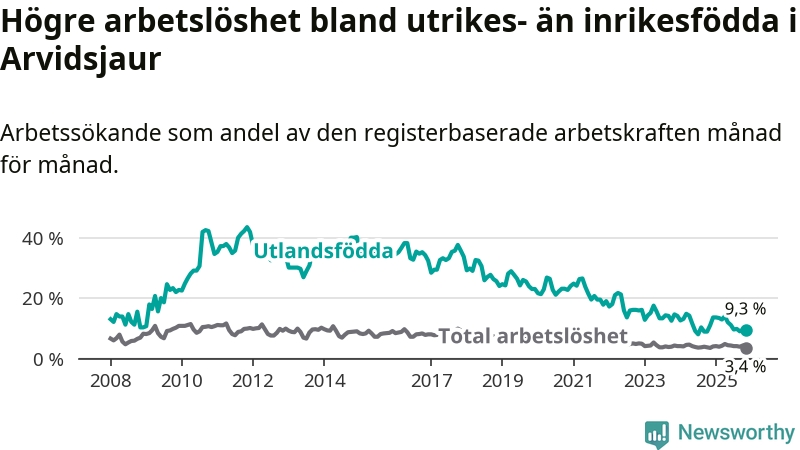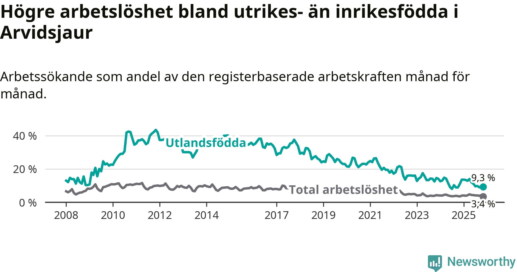Arbetslösheten bland utlandsfödda var 9,3 procent i Arvidsjaur under november månad, motsvarande 32 av 344 personer. Det är 1,7 procentenheter färre än vid samma tidpunkt i fjol (−6 om man räknar personer). Den senaste månadens nedgång innebär ett trendbrott. Under de två föregående månaderna hade arbetslösheten bland utlandsfödda varit högre än motsvarande tidpunkt året innan.