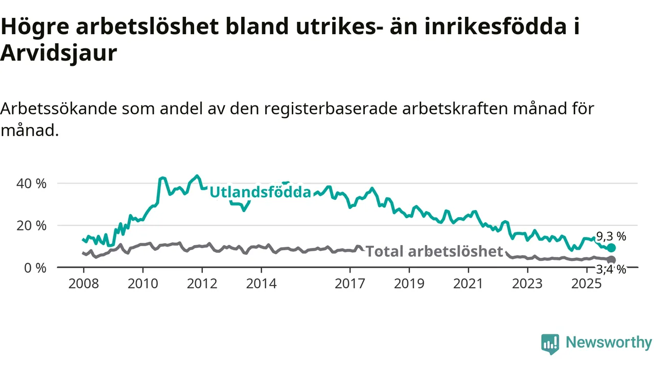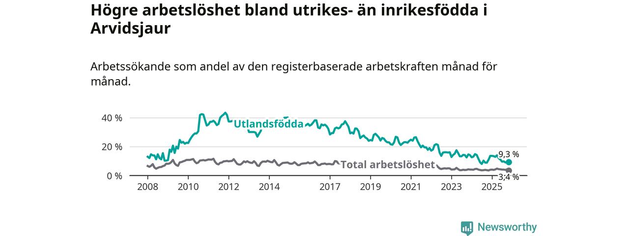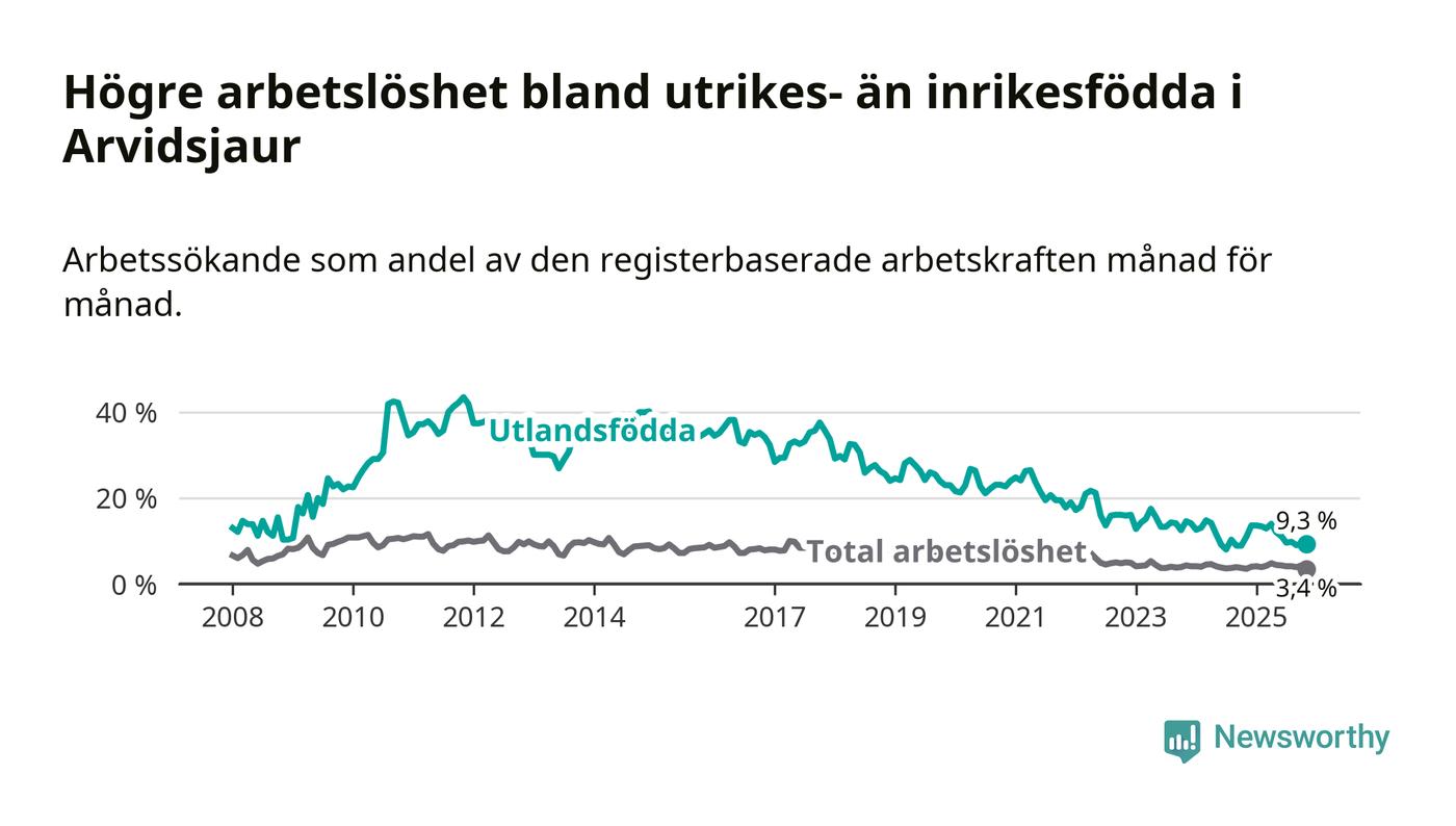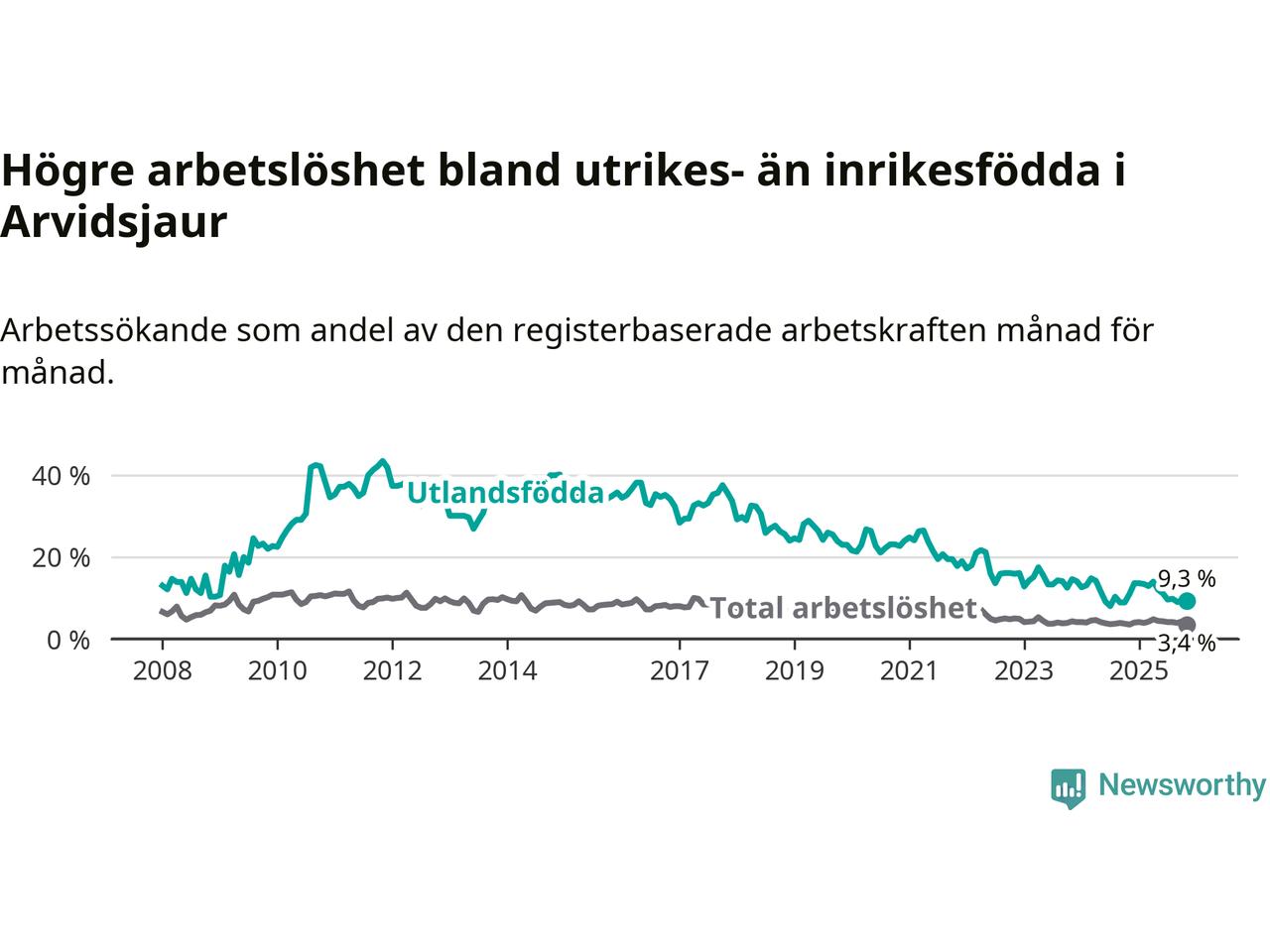 Skillnaden i arbetslöshet mellan utrikesfödda och hela befolkningen är 5,9 procentenheter i Arvidsjaur. Det är en betydligt mindre skillnad än för ett år sedan (−1,6 procentenheter).