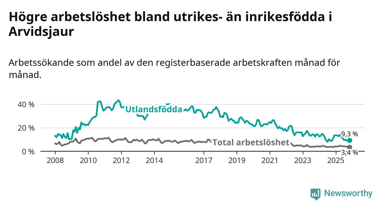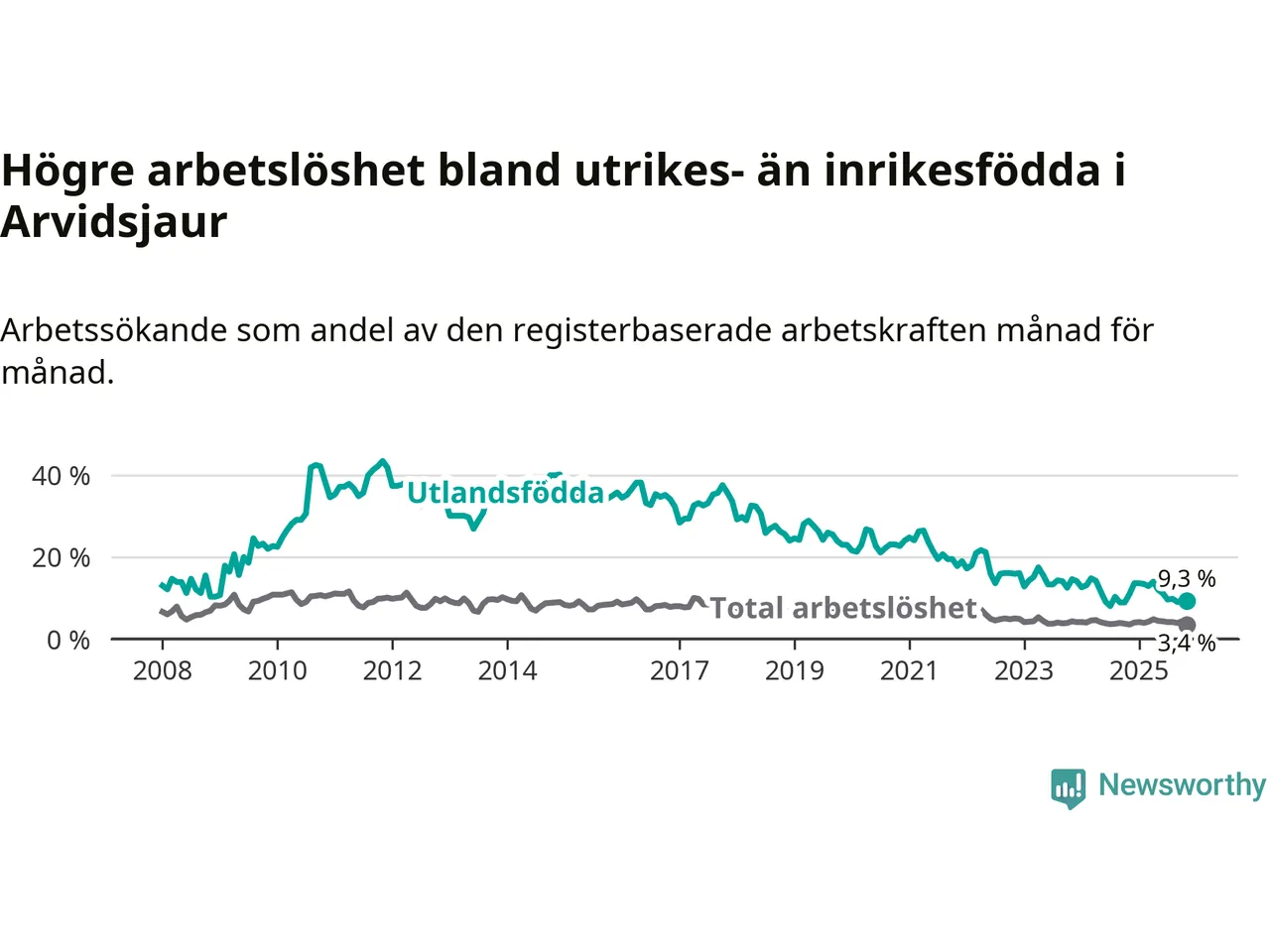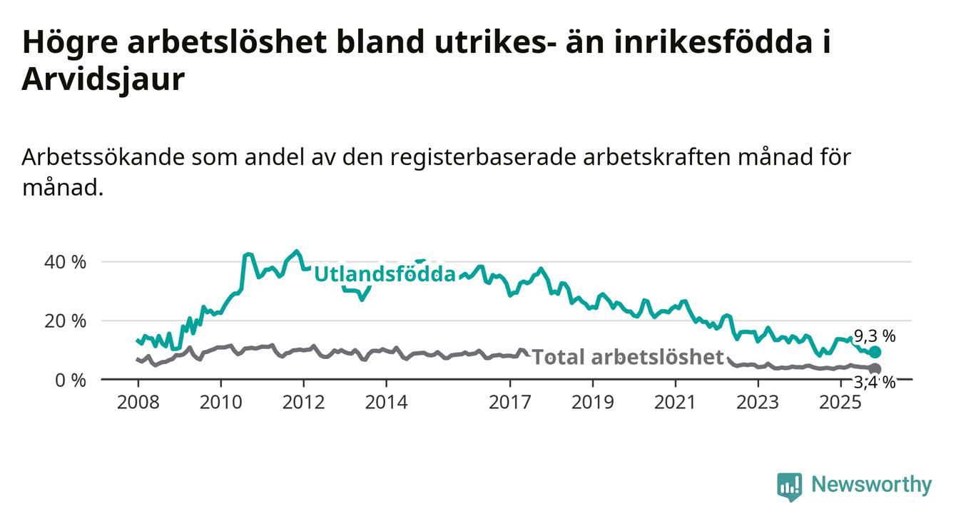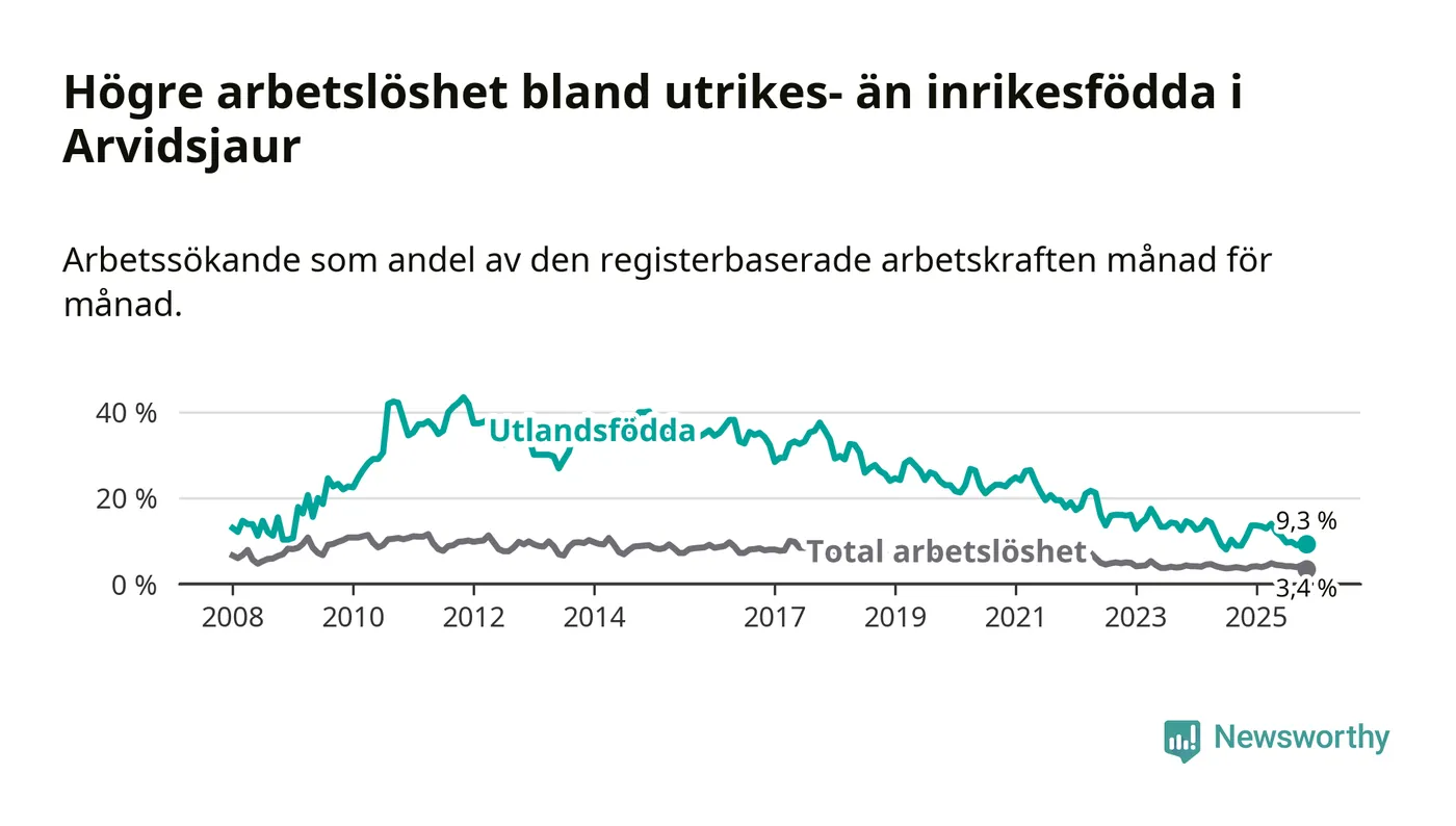 Skillnaden i arbetslöshet mellan utrikesfödda och hela befolkningen är 5,9 procentenheter i Arvidsjaur. Det är en betydligt mindre skillnad än för ett år sedan (−1,6 procentenheter).