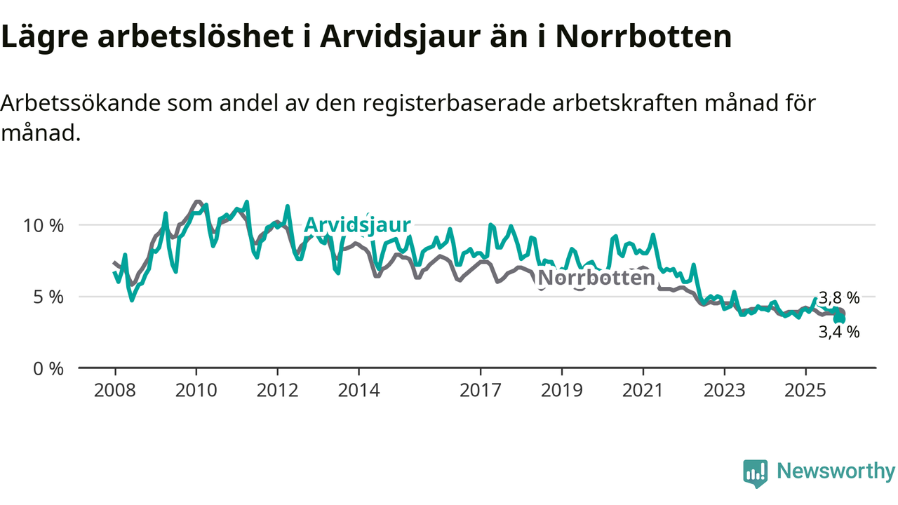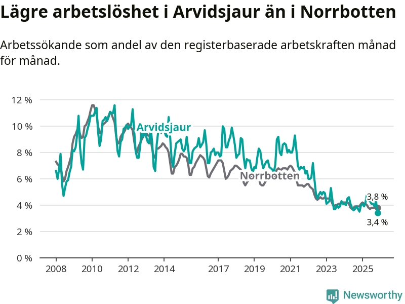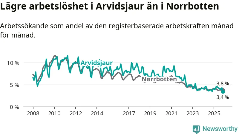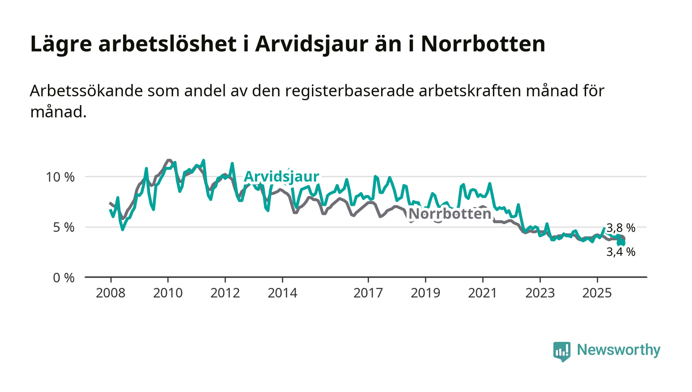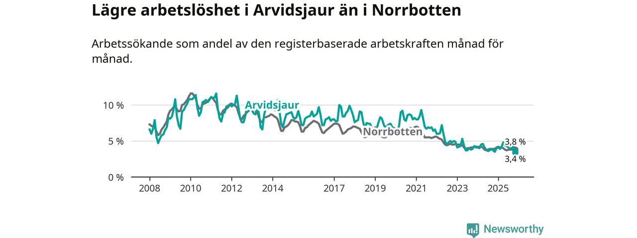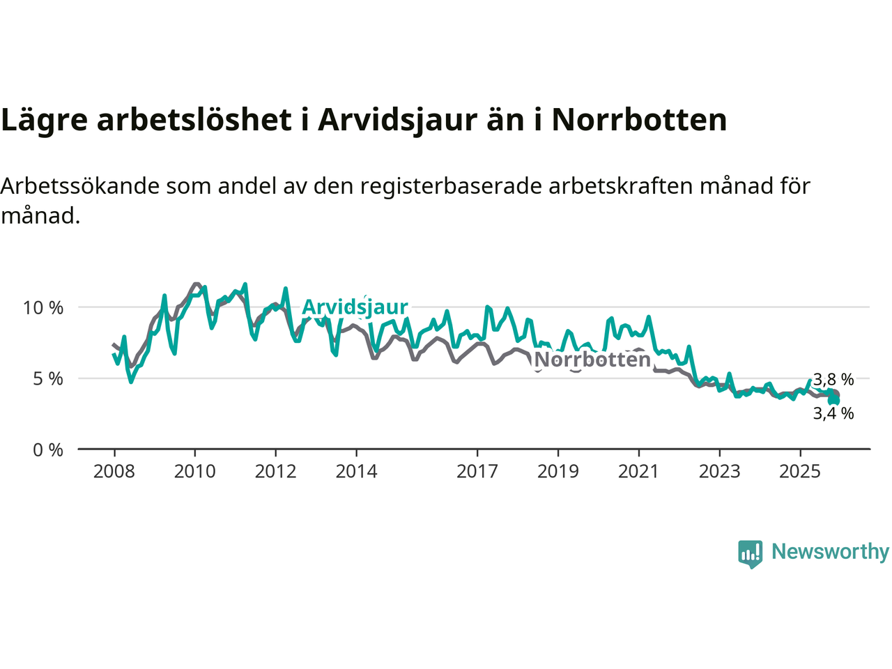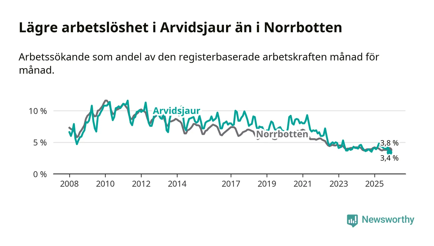 Under november månad rapporterade Arvidsjaurs kommun en total arbetslöshet på 3,4 procent. Det är en minskning jämfört med samma tidpunkt i fjol (−0,1 procentenheter). Även i Norrbottens län sjunker arbetslösheten något.