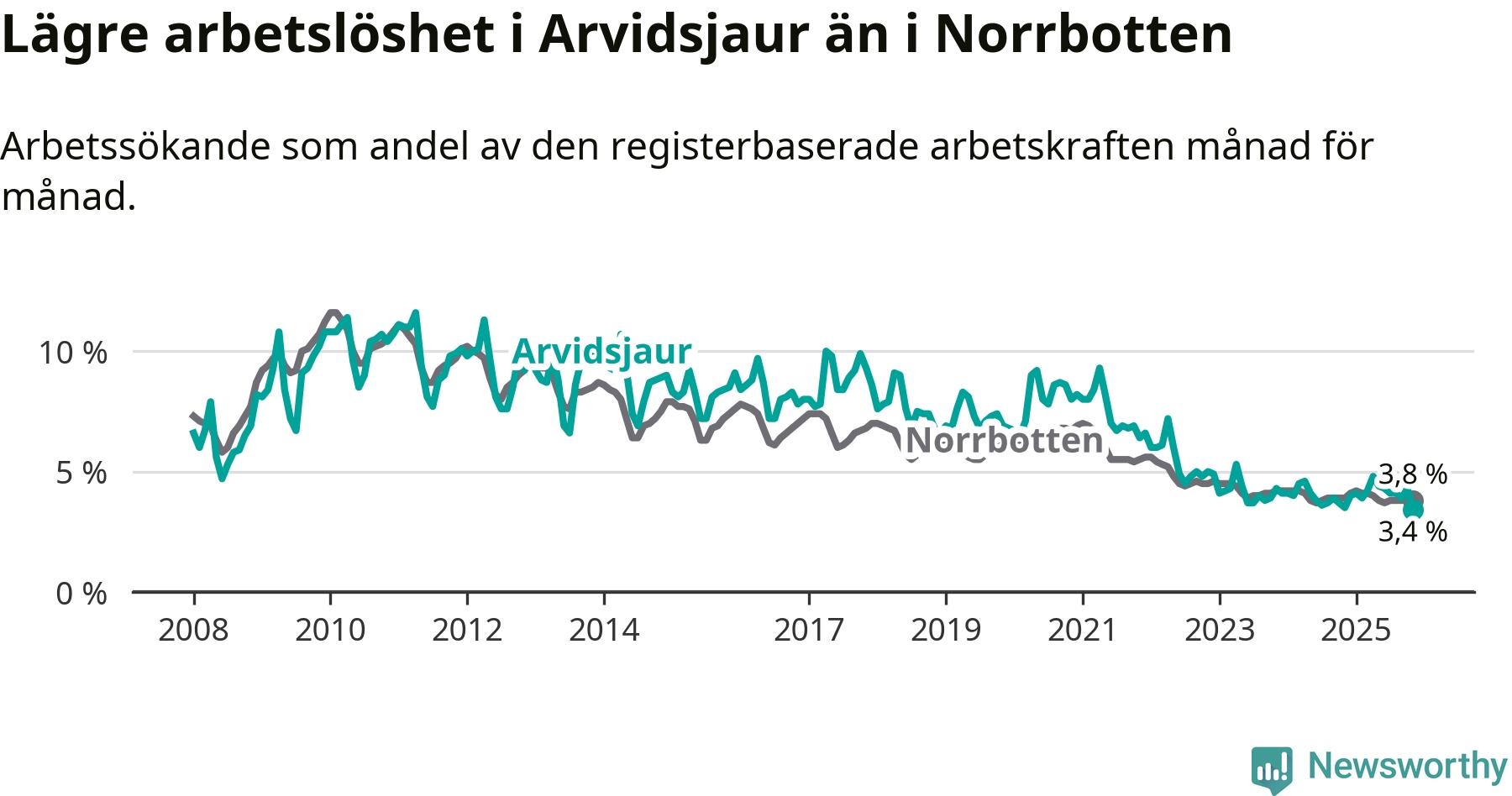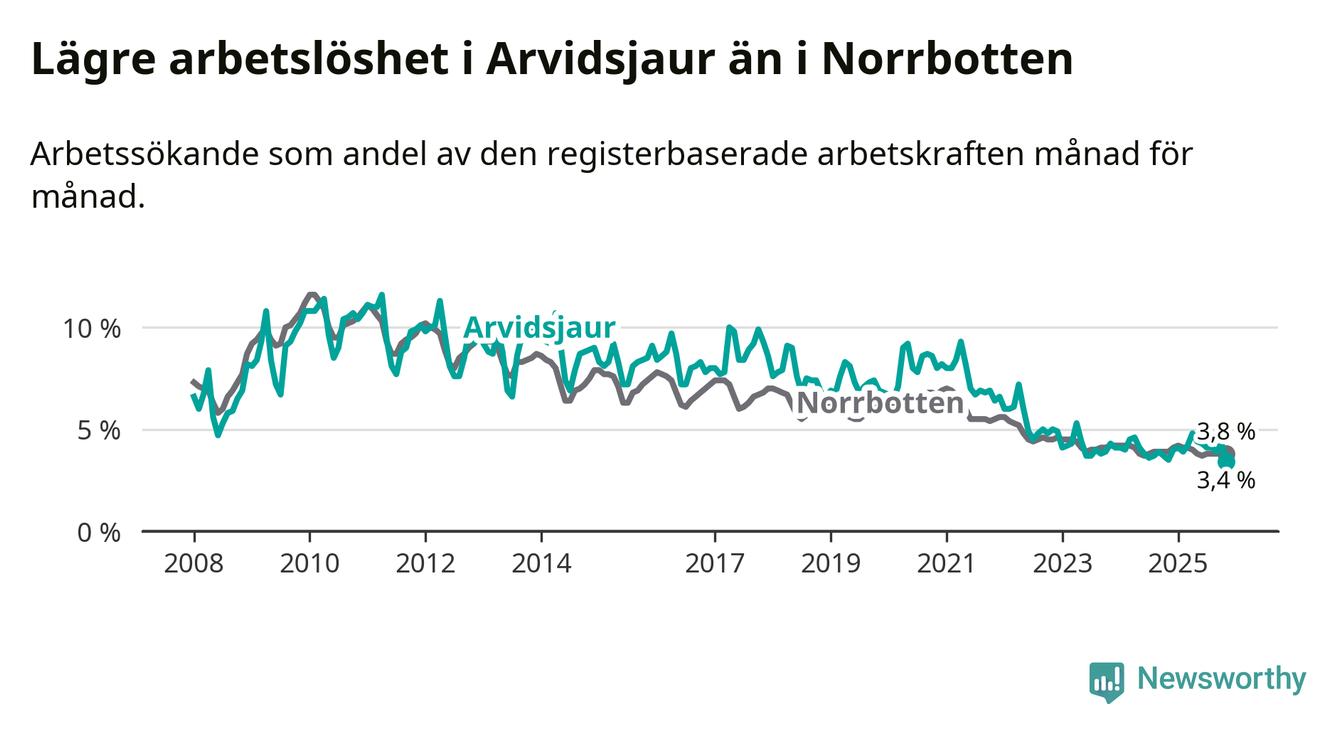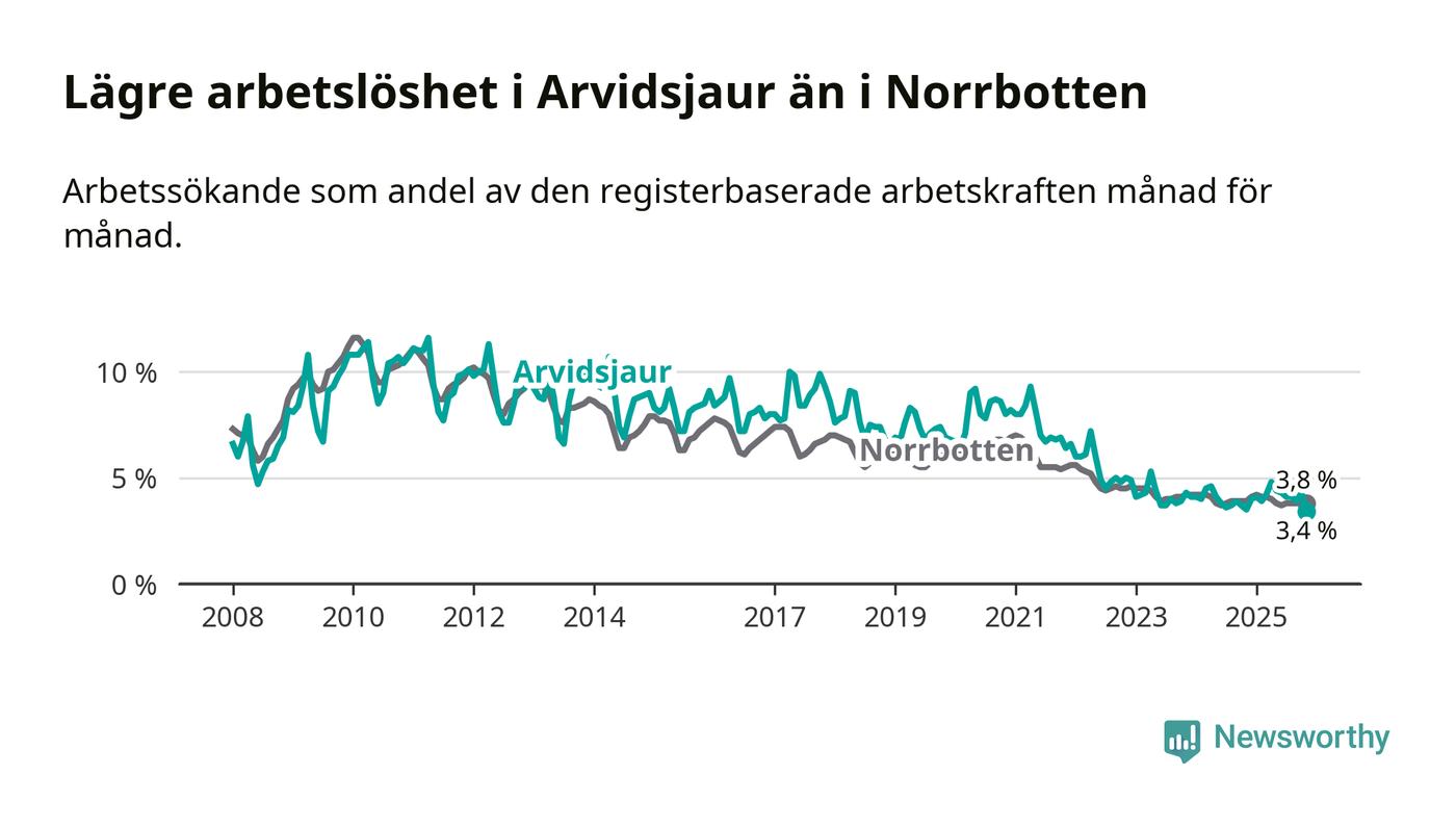 Den minskande arbetslösheten gör att Arvidsjaur passerat snittet i Norrbottens län och nu har lägre arbetslöshet (3,4 procent i kommunen, jämfört med 3,8 procent i hela länet). Kiruna har den lägsta arbetslösheten i länet (2,5 procent), medan Haparanda har den högsta (7,0 procent). För att Arvidsjaur skulle komma ner i samma arbetslöshetsnivå som Kiruna skulle 26 personer behöva sysselsättas.