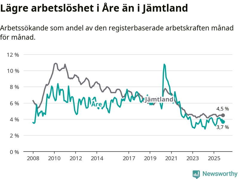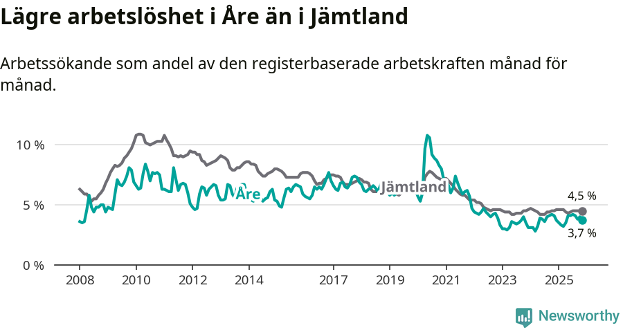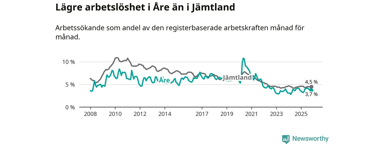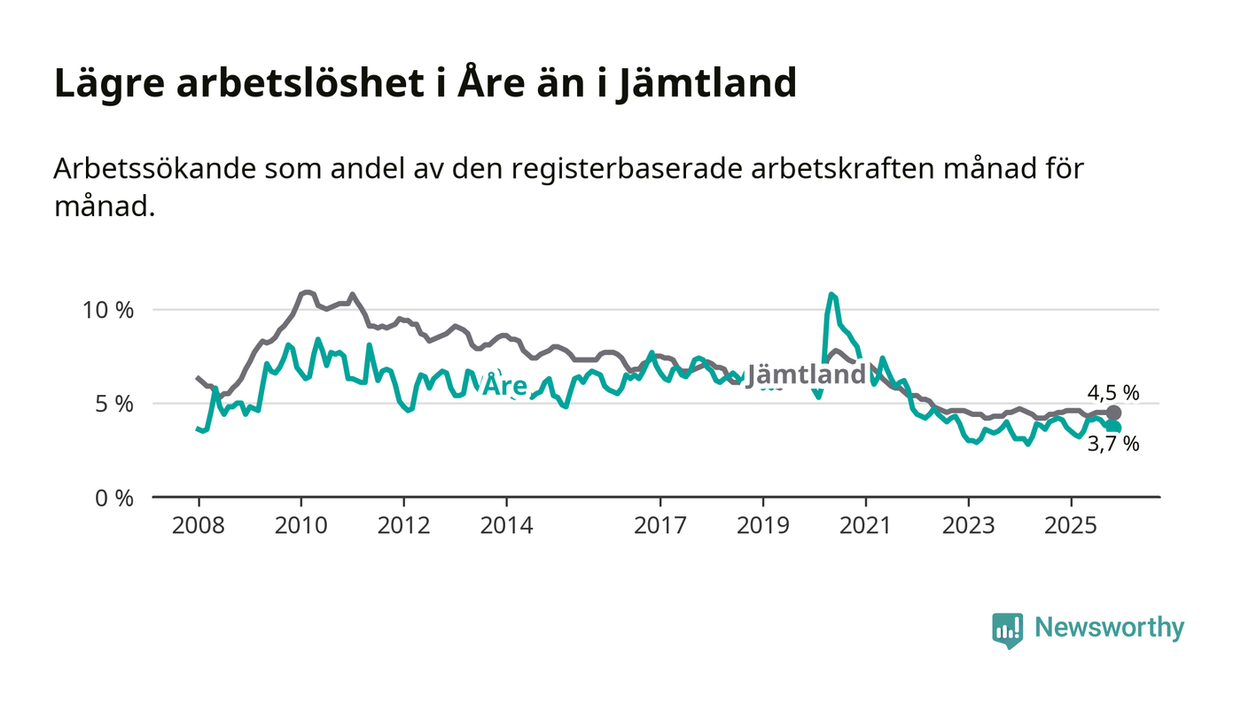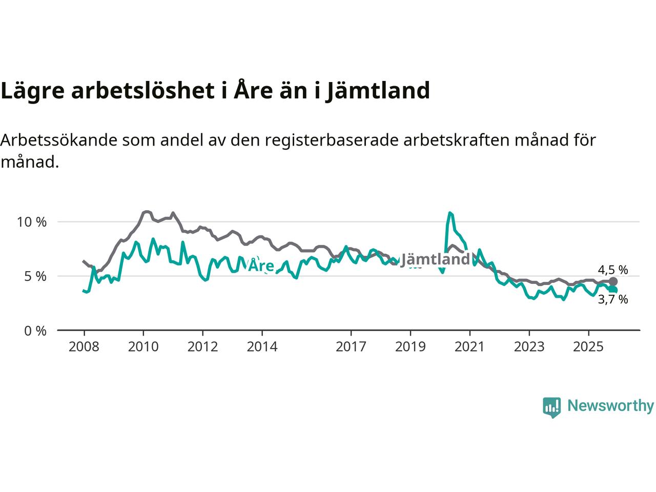 Åre hade redan tidigare lägre arbetslöshet än snittet i hela Jämtlands län och nu växer klyftan (3,7 procent i kommunen, jämfört med 4,5 procent i hela länet). Krokom har den lägsta arbetslösheten i länet (3,1 procent), medan Strömsund har den högsta (6,2 procent). För att Åre skulle komma ner i samma arbetslöshetsnivå som Krokom skulle 42 personer behöva sysselsättas.