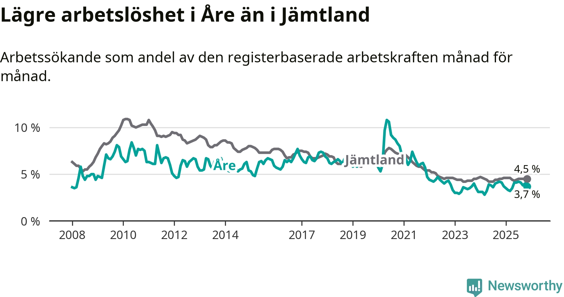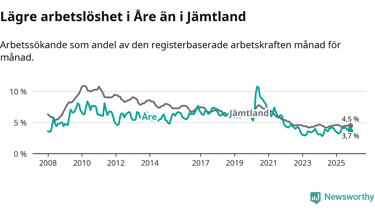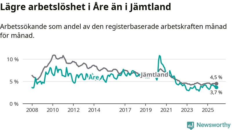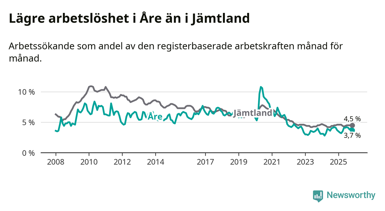Åre hade redan tidigare lägre arbetslöshet än snittet i hela Jämtlands län och nu växer klyftan (3,7 procent i kommunen, jämfört med 4,5 procent i hela länet). Krokom har den lägsta arbetslösheten i länet (3,1 procent), medan Strömsund har den högsta (6,2 procent). För att Åre skulle komma ner i samma arbetslöshetsnivå som Krokom skulle 42 personer behöva sysselsättas.