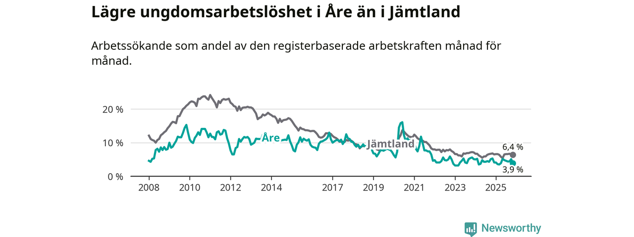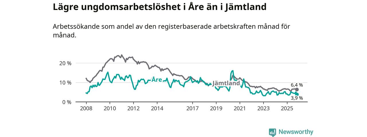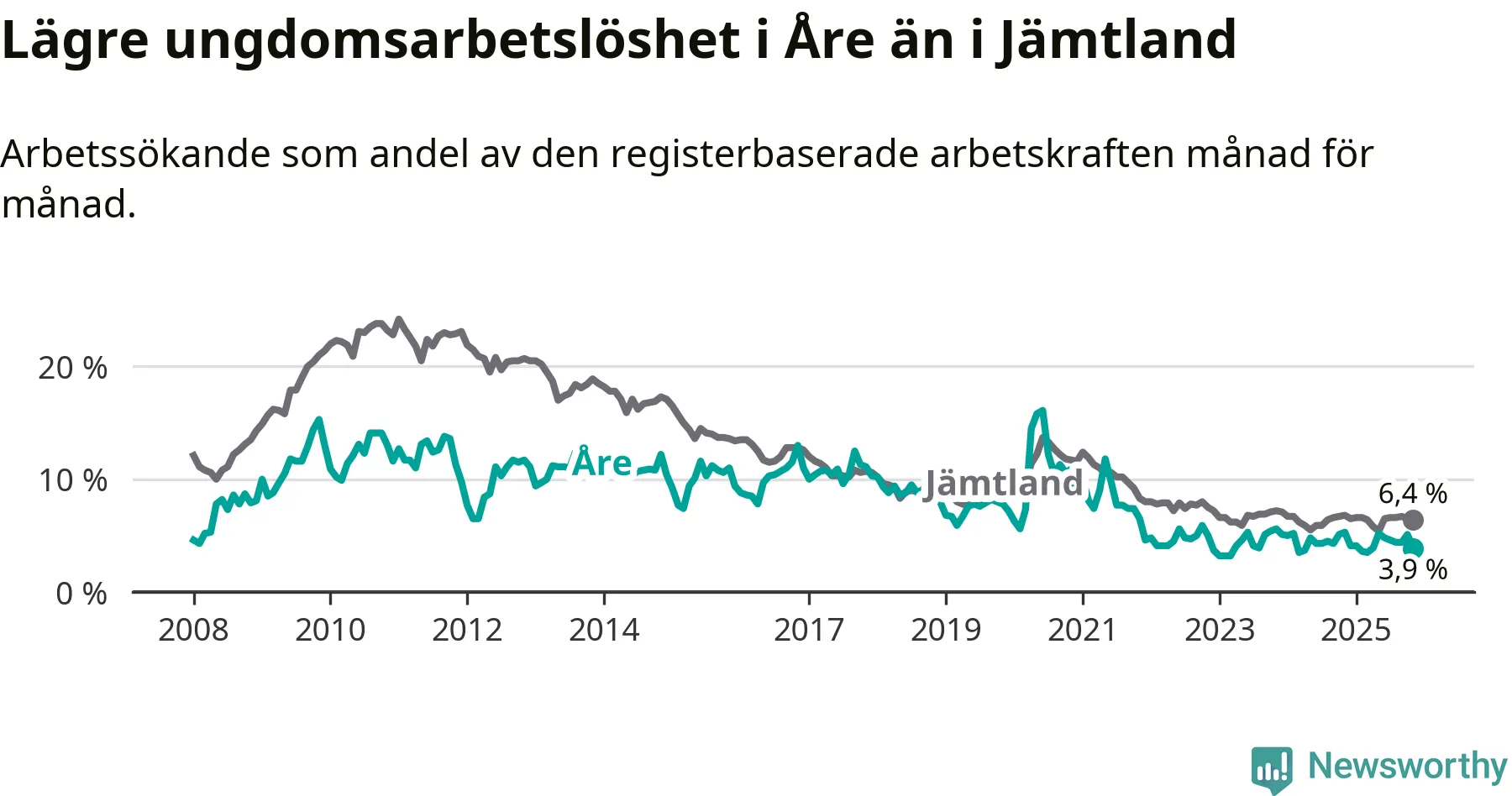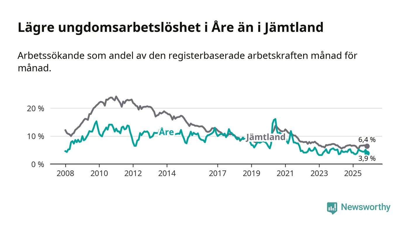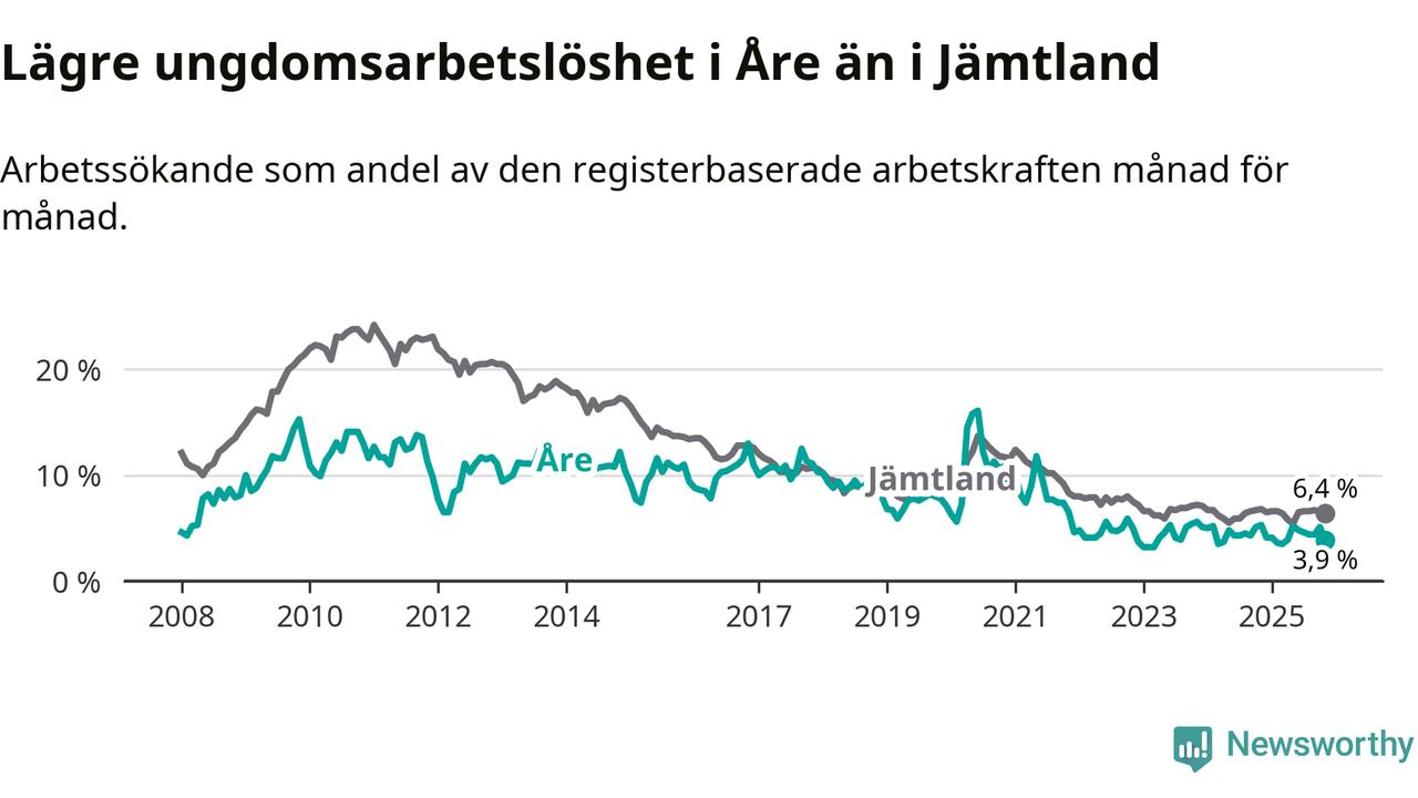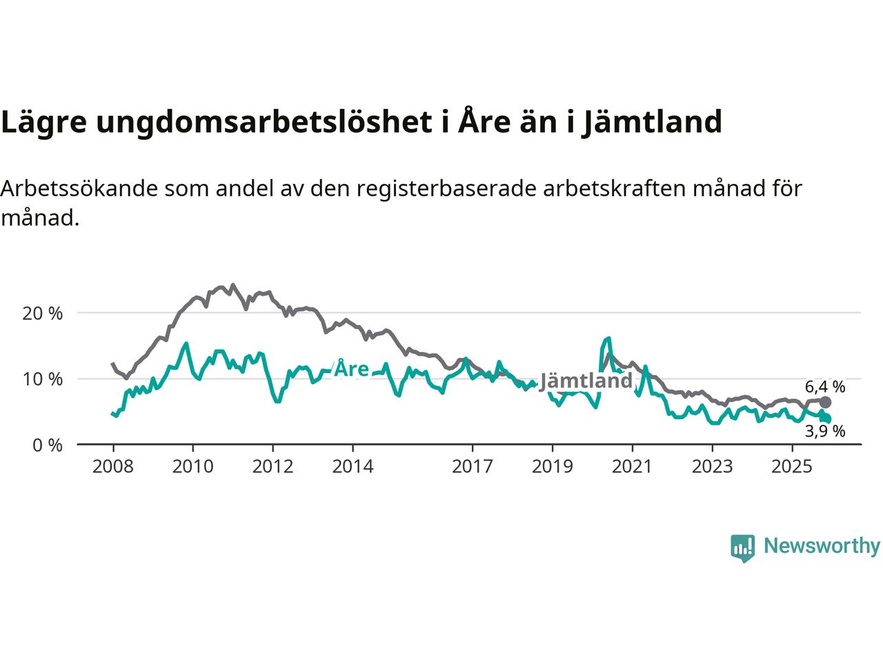 Precis som den totala arbetslösheten ligger ungdomsarbetslösheten i Åre lägre än i Jämtland som helhet. Skillnaden mellan kommunen och länet är 2,5 procentenheter.