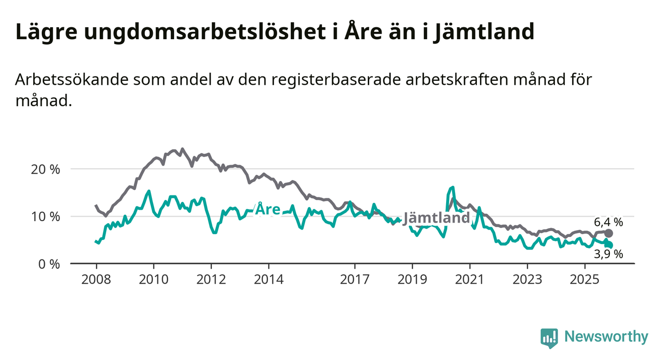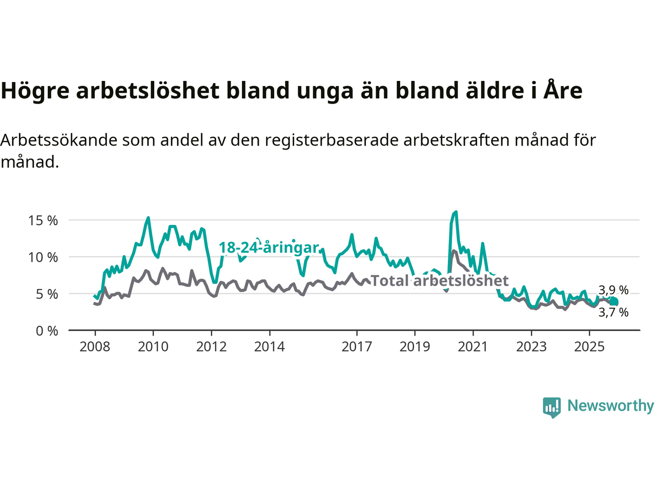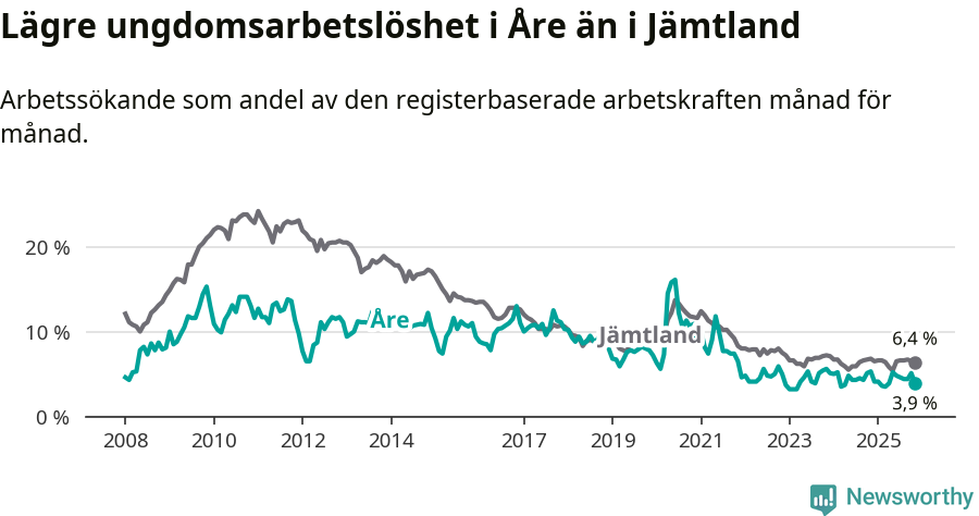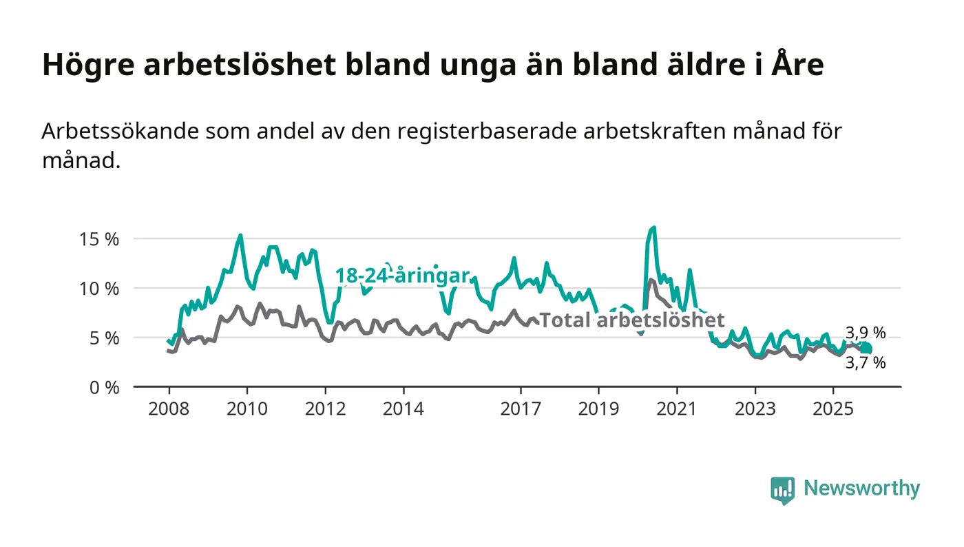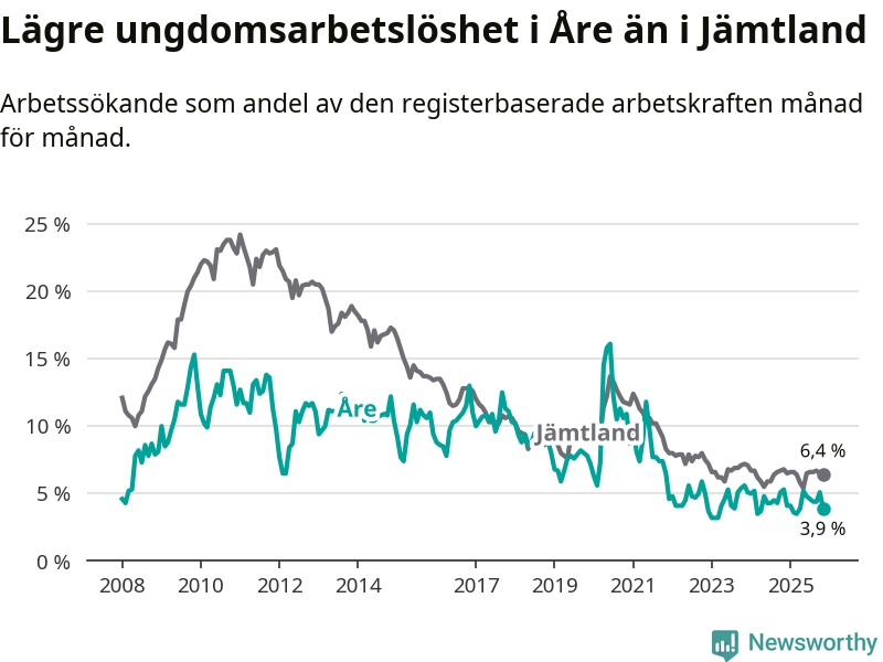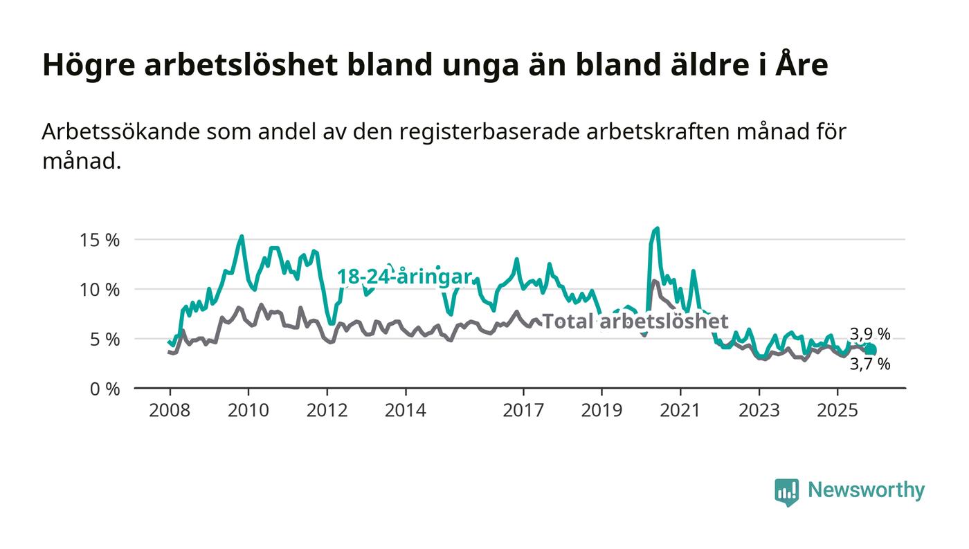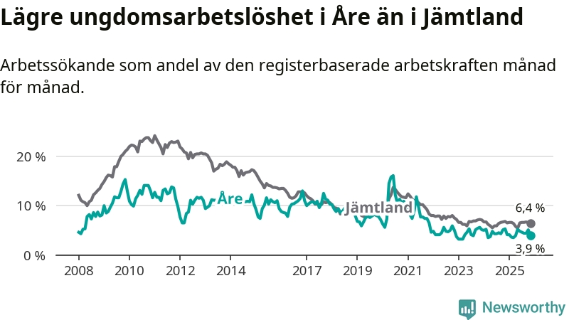 Precis som den totala arbetslösheten ligger ungdomsarbetslösheten i Åre lägre än i Jämtland som helhet. Skillnaden mellan kommunen och länet är 2,5 procentenheter.