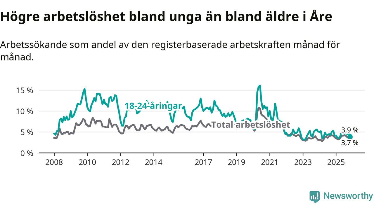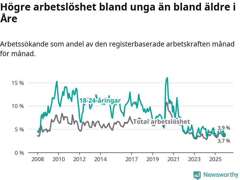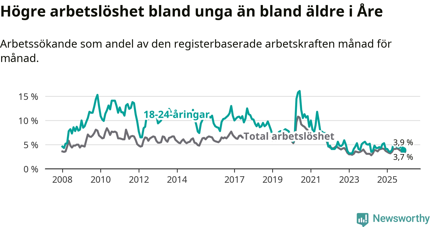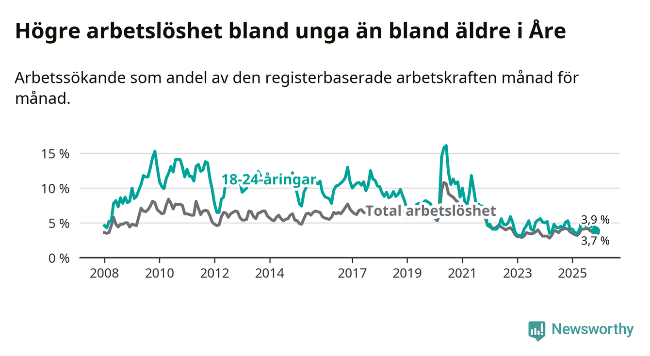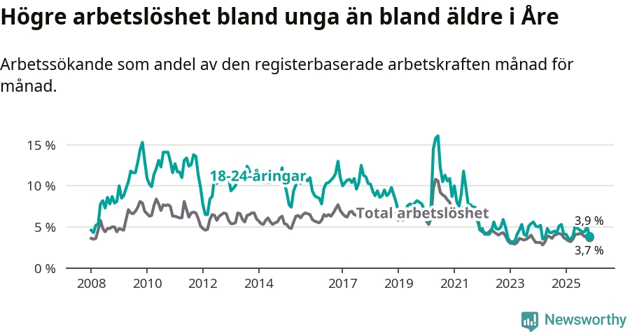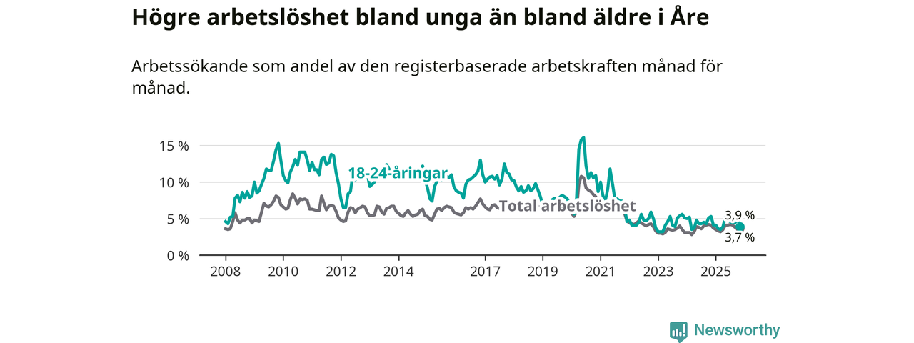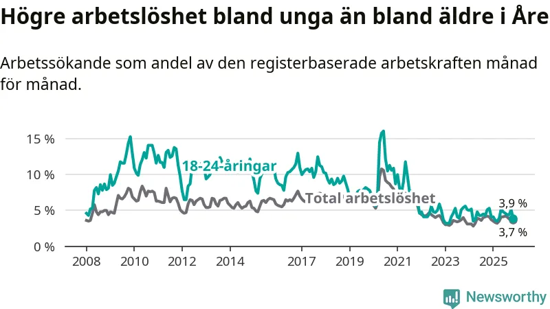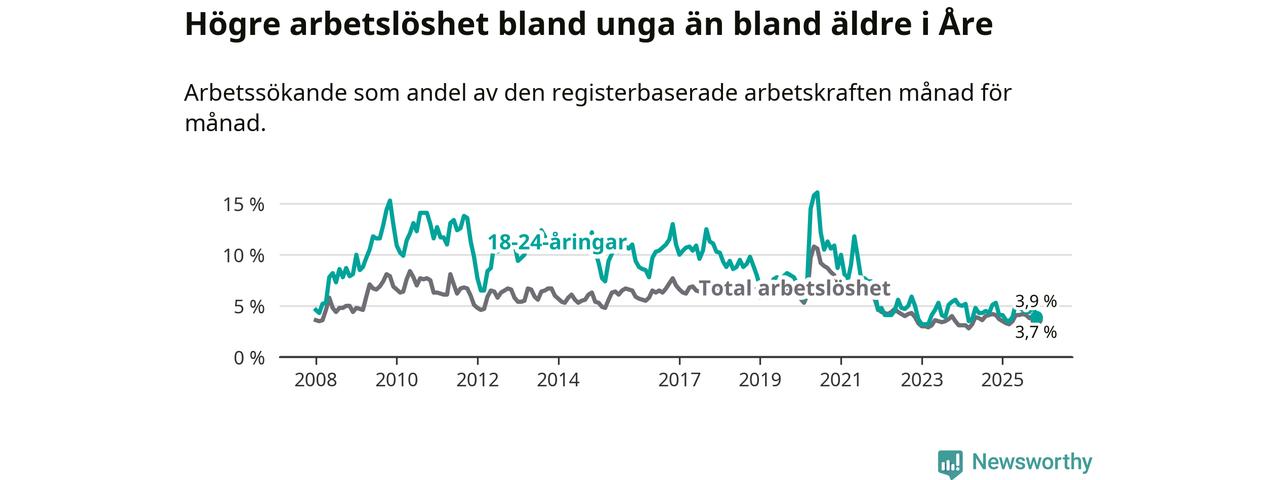 Precis som den totala arbetslösheten ligger ungdomsarbetslösheten i Åre lägre än i Jämtland som helhet. Skillnaden mellan kommunen och länet är 2,5 procentenheter.
