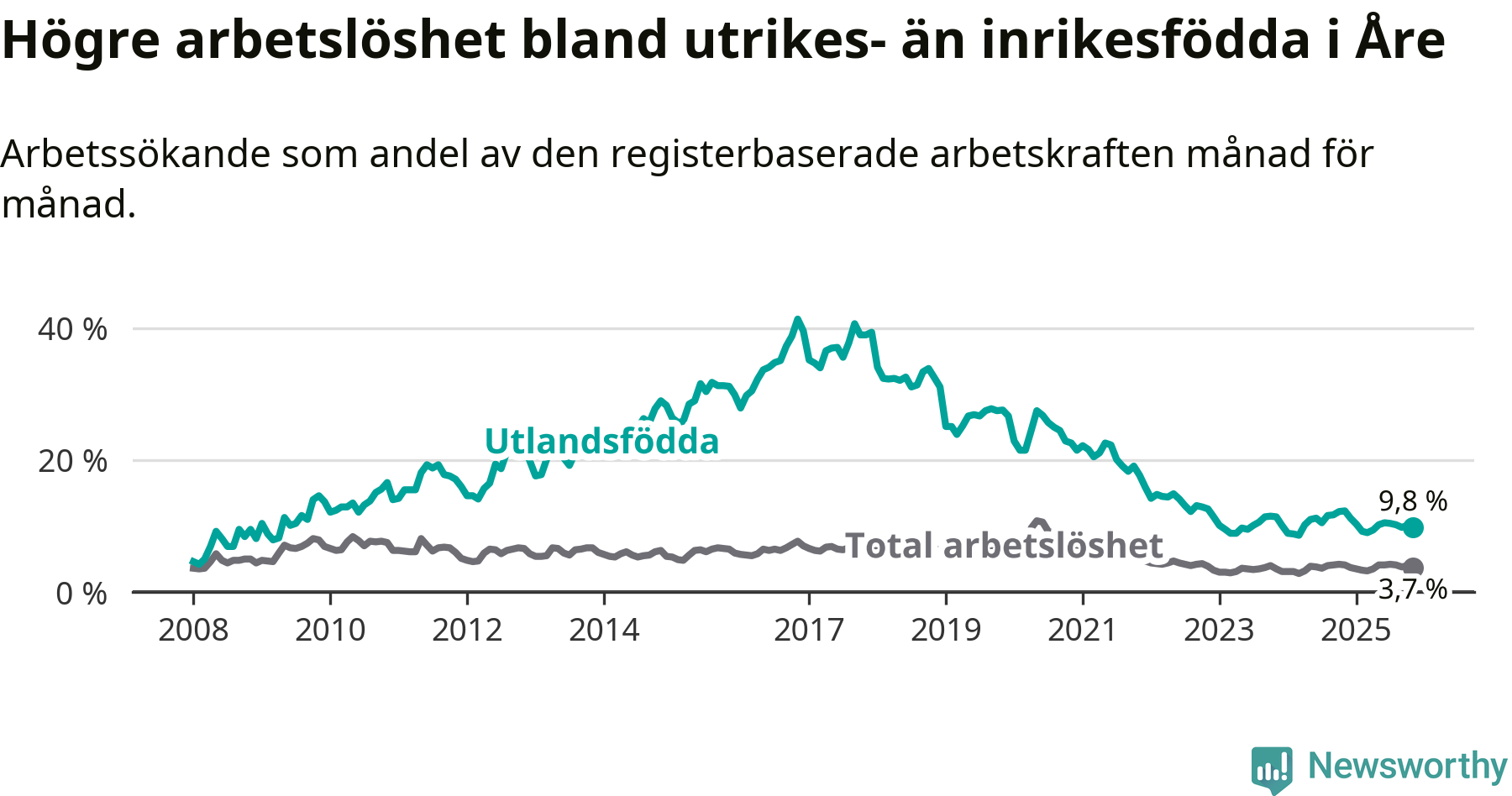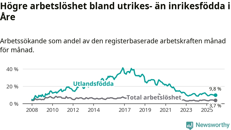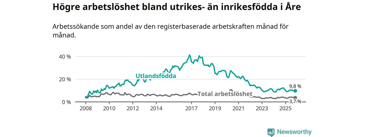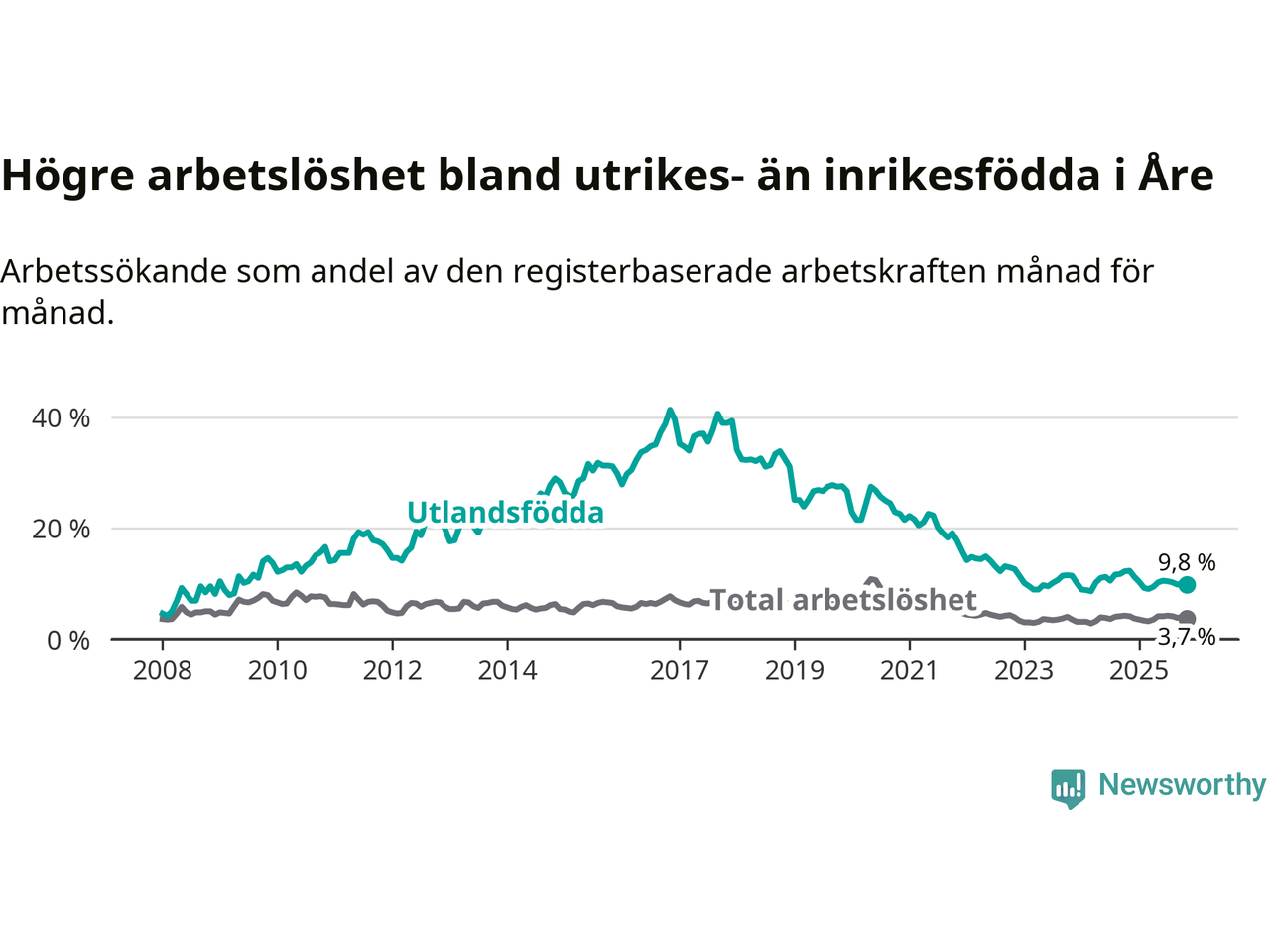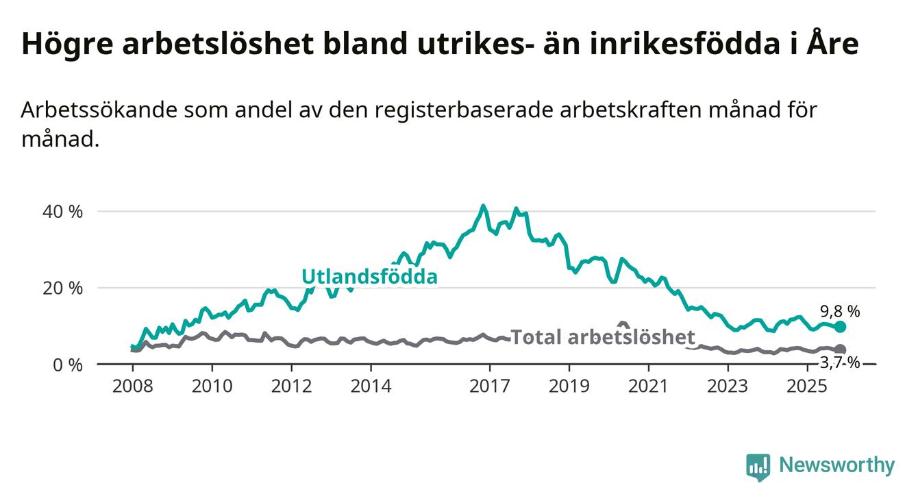 Arbetslösheten bland utlandsfödda var 9,8 procent i Åre under november månad, motsvarande 86 av 878 personer. Det är 2,5 procentenheter färre än vid samma tidpunkt i fjol (−22 om man räknar personer). Därmed är de utlandsföddas arbetslöshet lägre än vid samma tidpunkt i fjol för åttonde månaden i följd.