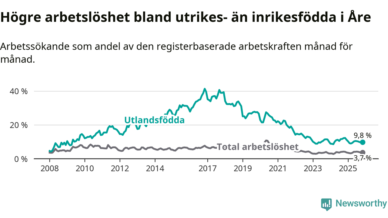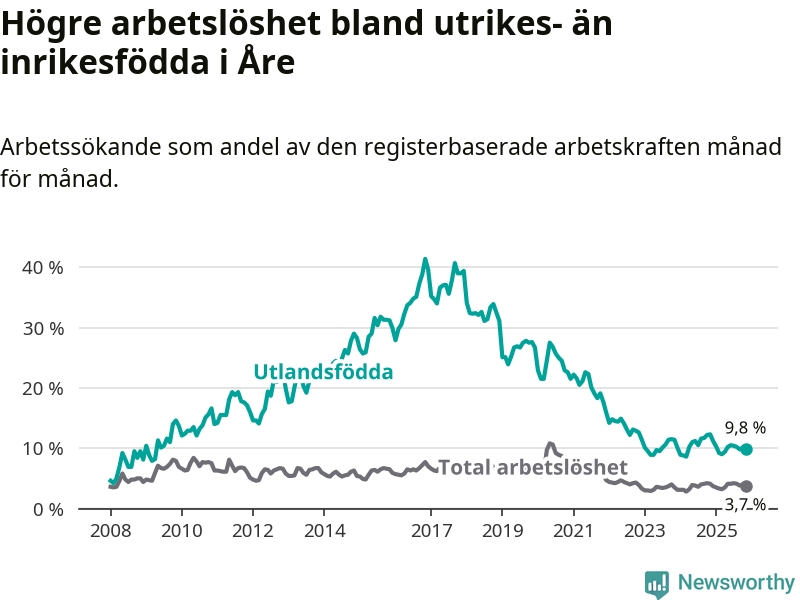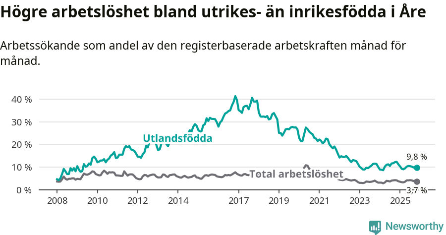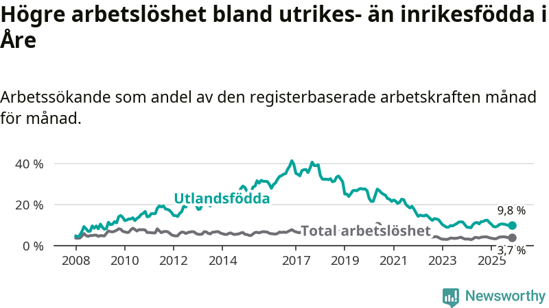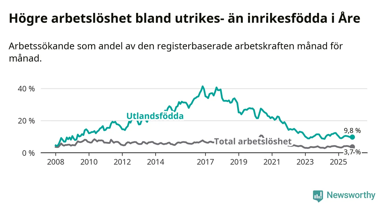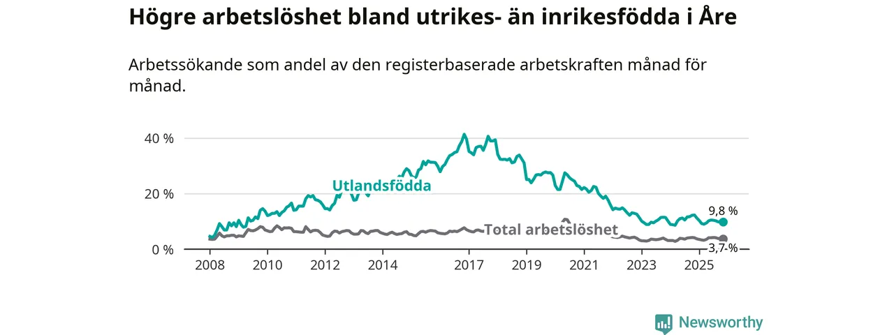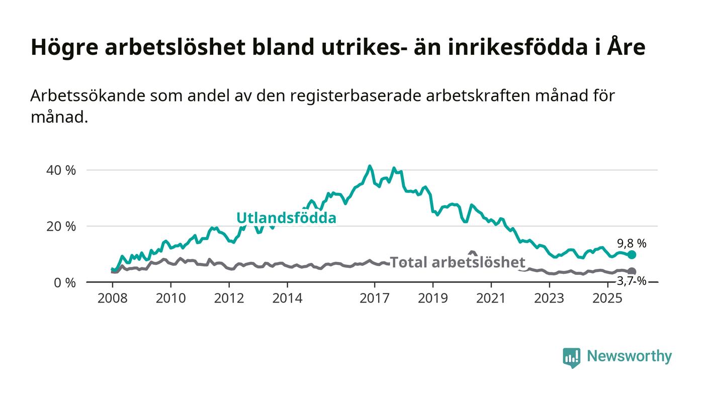 Skillnaden i arbetslöshet mellan utrikesfödda och hela befolkningen är 6,1 procentenheter i Åre. Det är en betydligt mindre skillnad än för ett år sedan (−2,1 procentenheter).