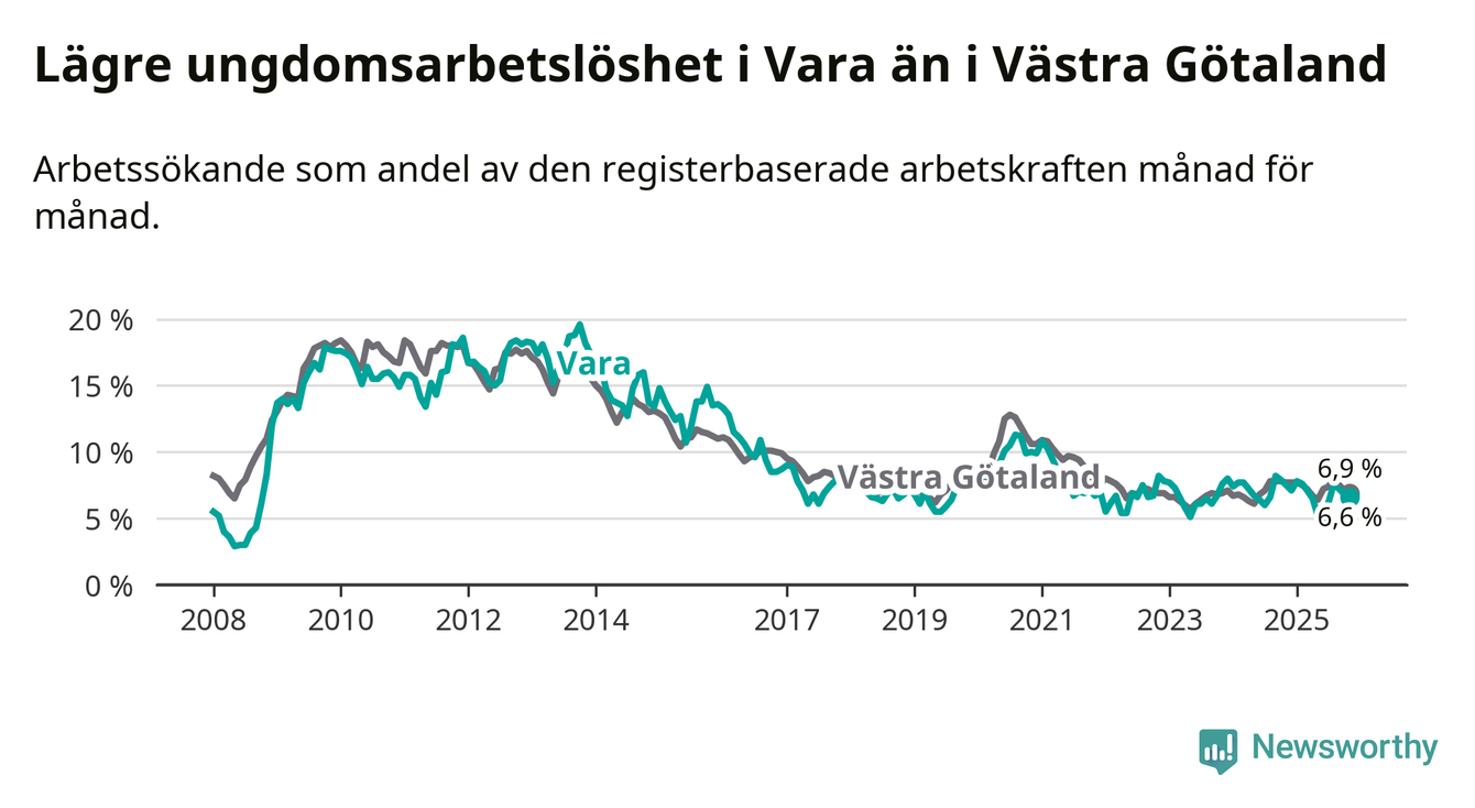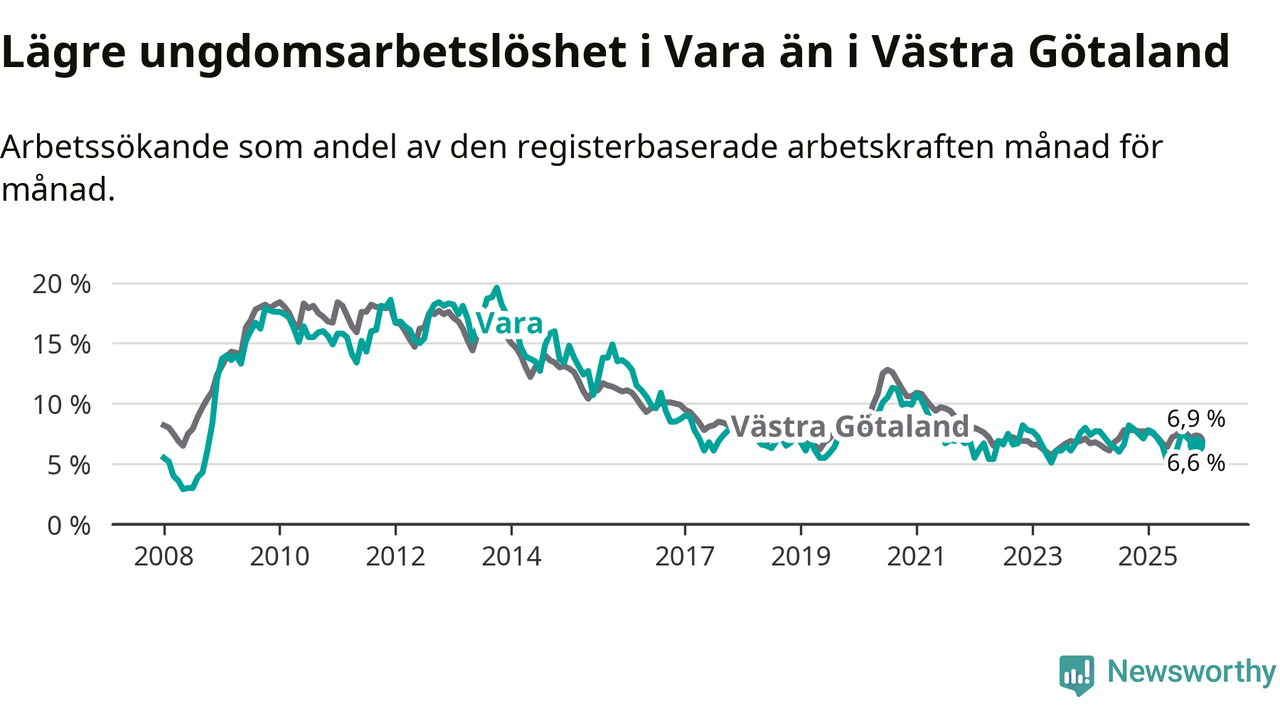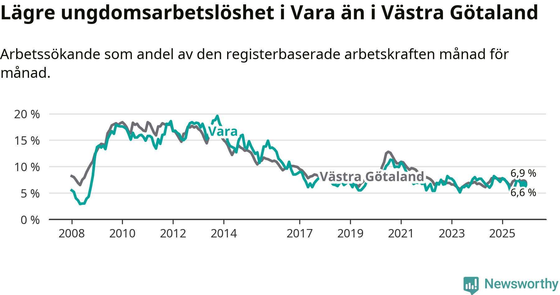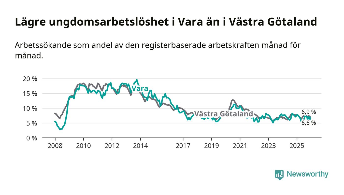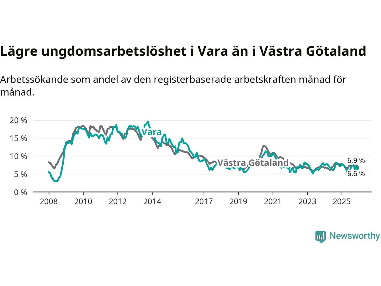 Precis som den totala arbetslösheten ligger ungdomsarbetslösheten i Vara lägre än i Västra Götaland som helhet. Skillnaden mellan kommunen och länet är 0,3 procentenheter.