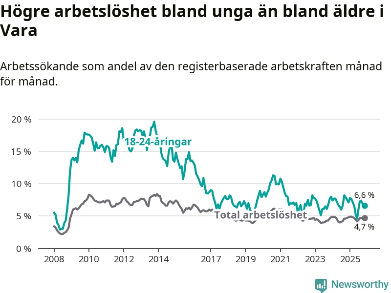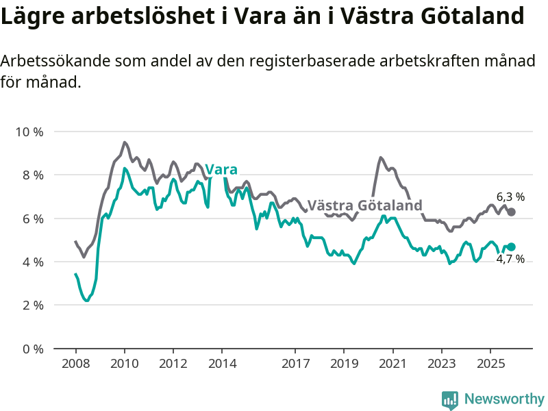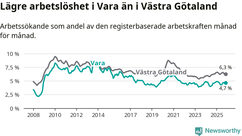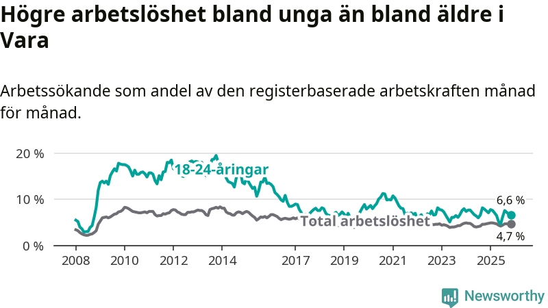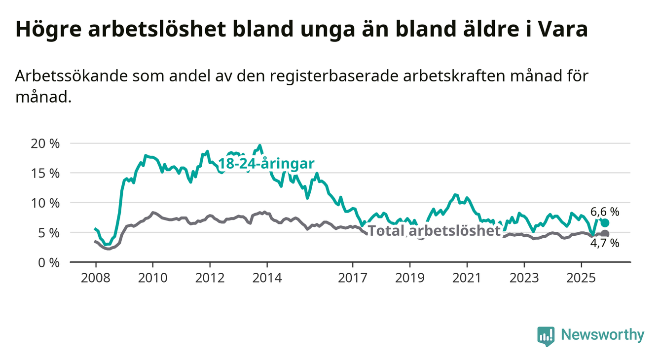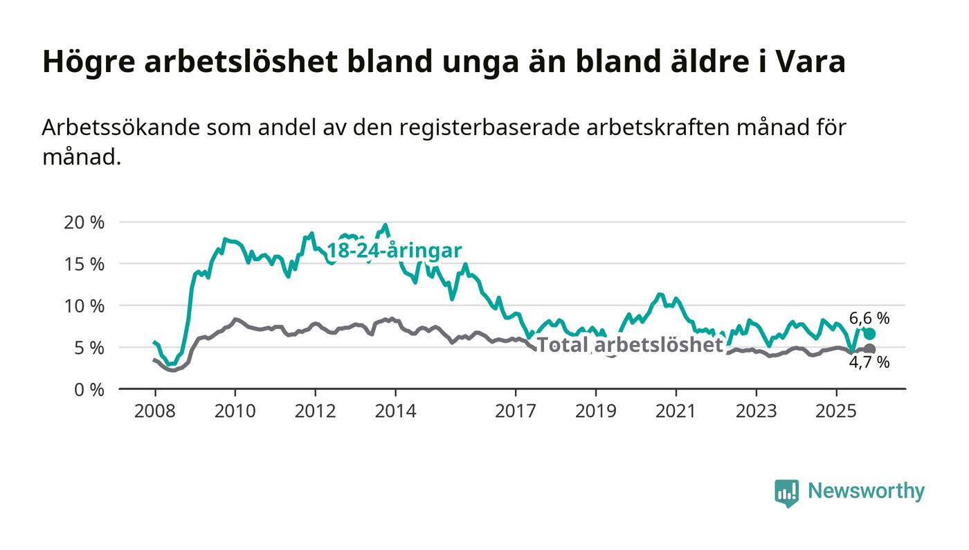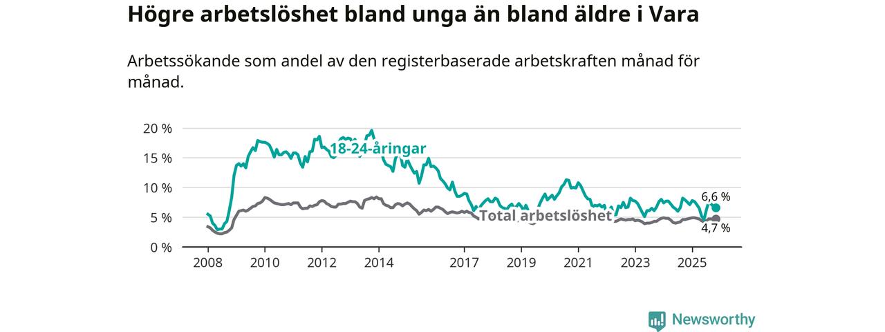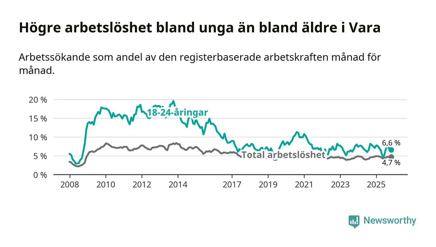Precis som den totala arbetslösheten ligger ungdomsarbetslösheten i Vara lägre än i Västra Götaland som helhet. Skillnaden mellan kommunen och länet är 0,3 procentenheter.