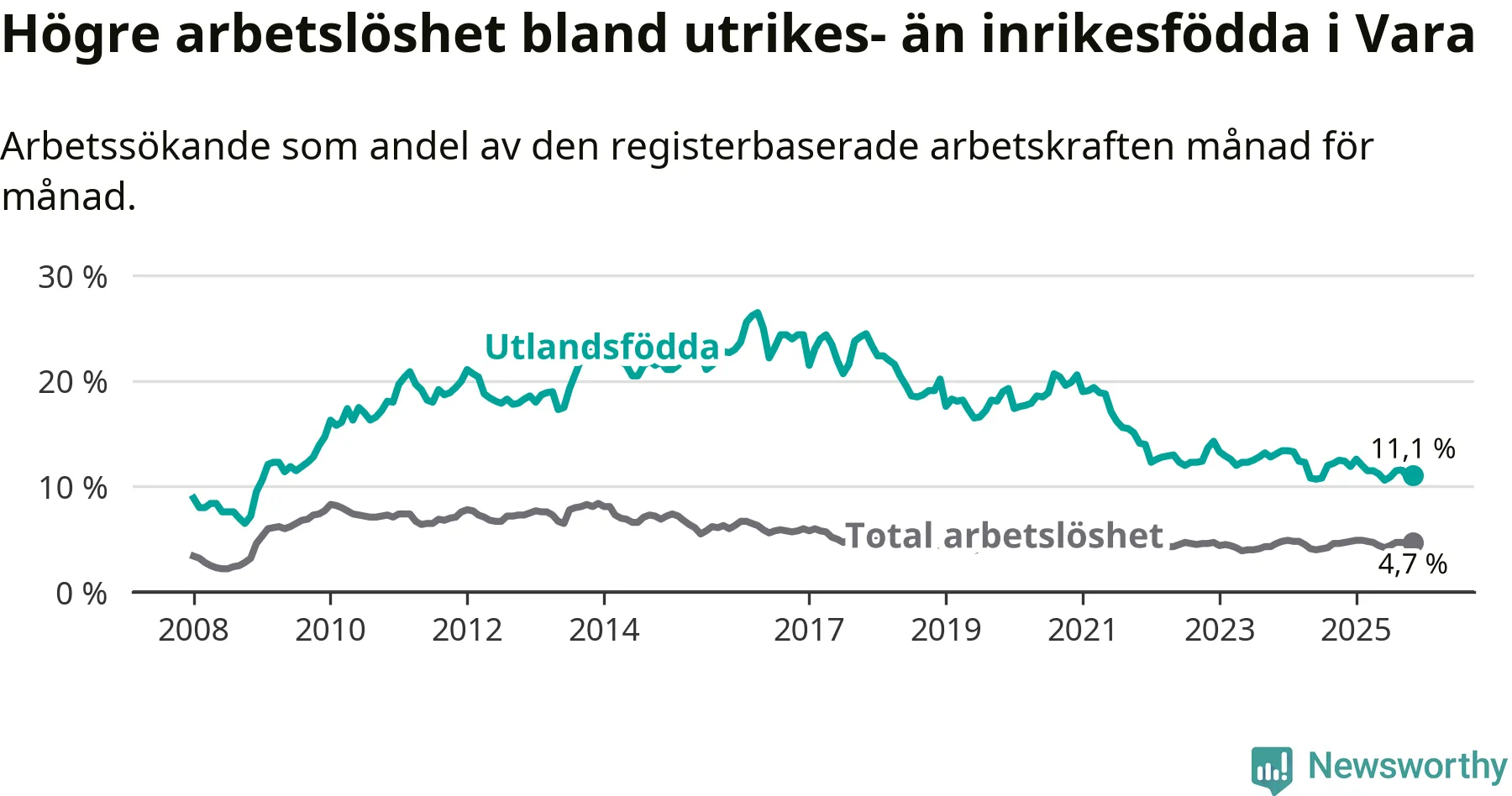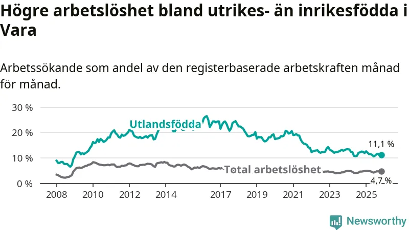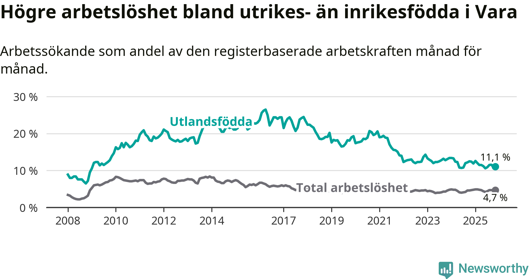 Arbetslösheten bland utlandsfödda var 11,1 procent i Vara under november månad, motsvarande 118 av 1 063 personer. Det är 1,3 procentenheter färre än vid samma tidpunkt i fjol (−13 om man räknar personer).