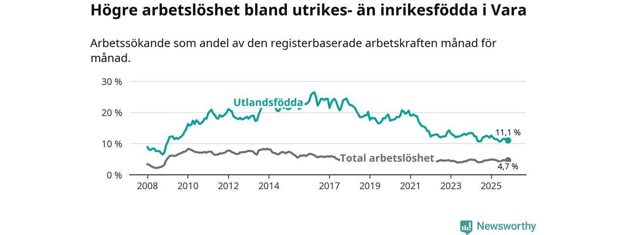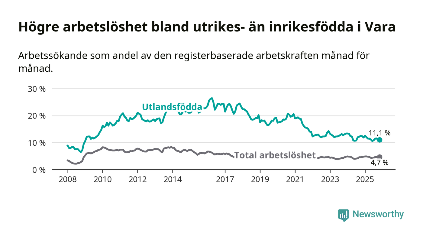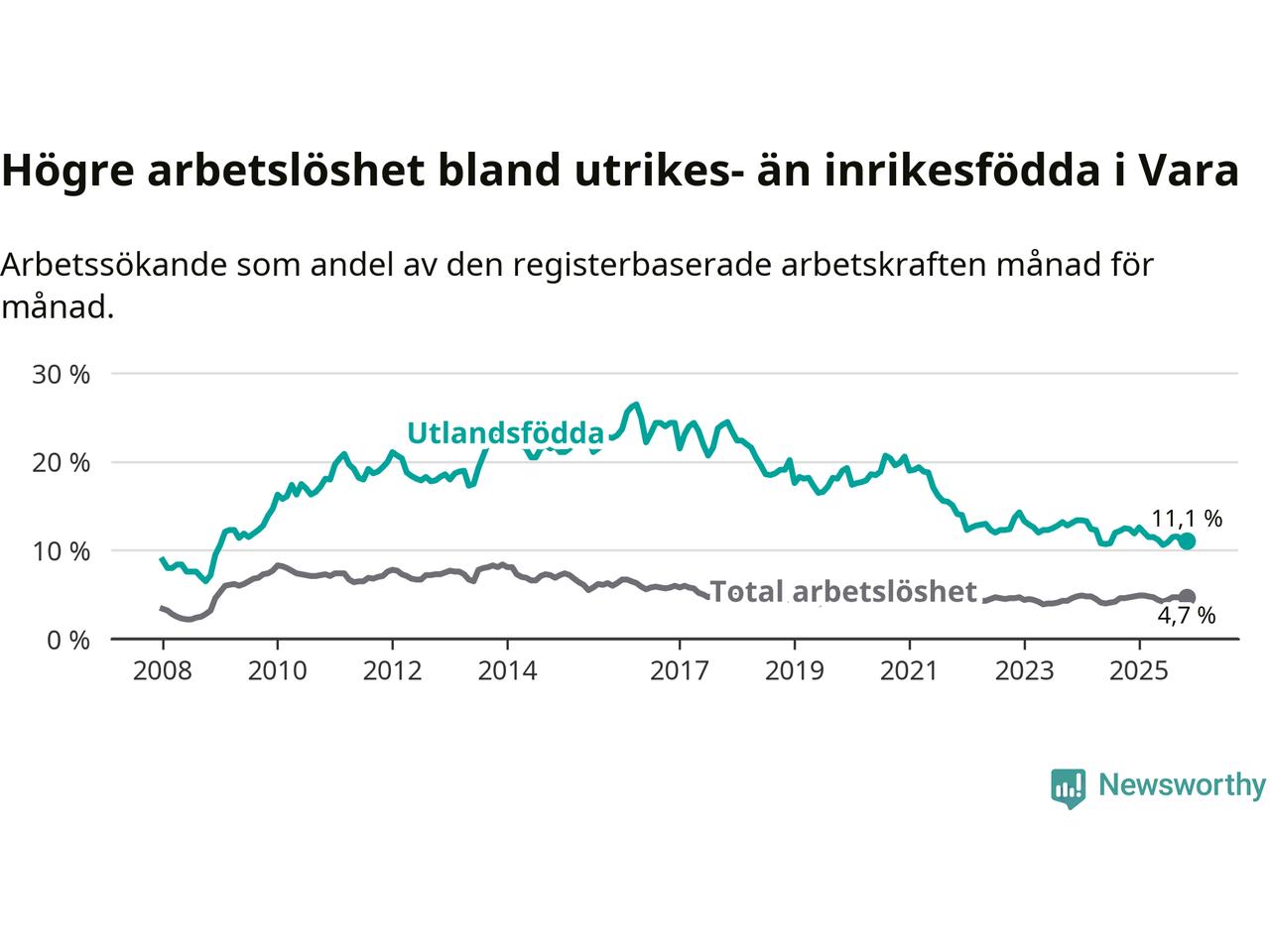 Skillnaden i arbetslöshet mellan utrikesfödda och hela befolkningen är 6,4 procentenheter i Vara. Det är en mindre skillnad än för ett år sedan (−1,3 procentenheter).