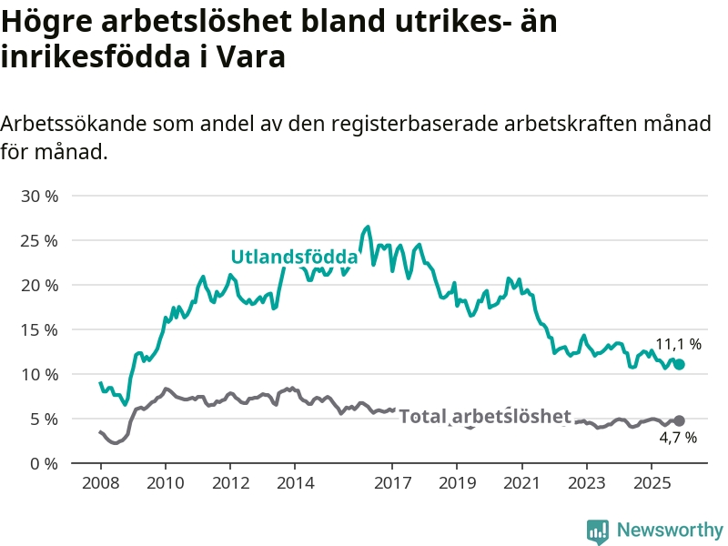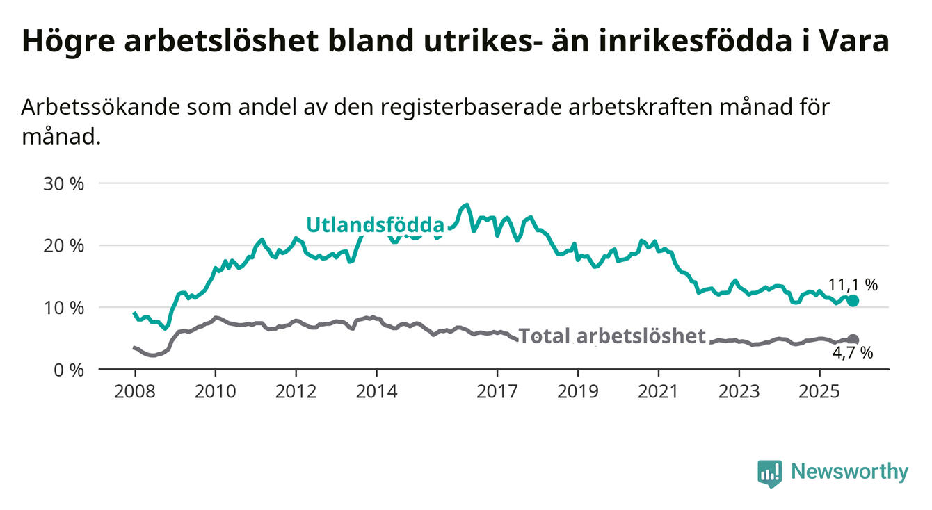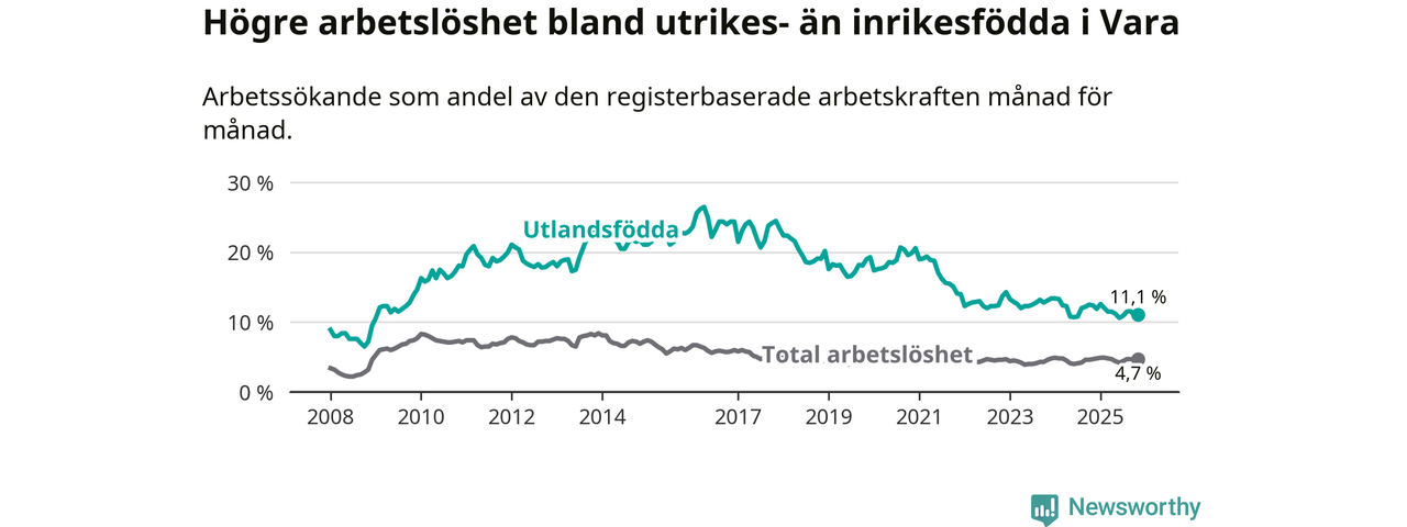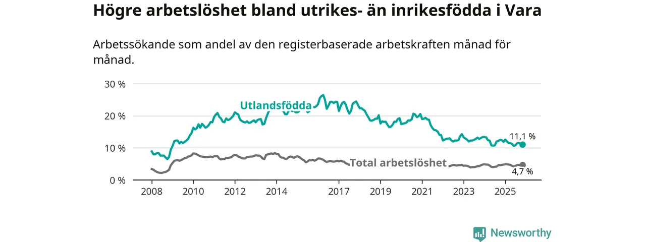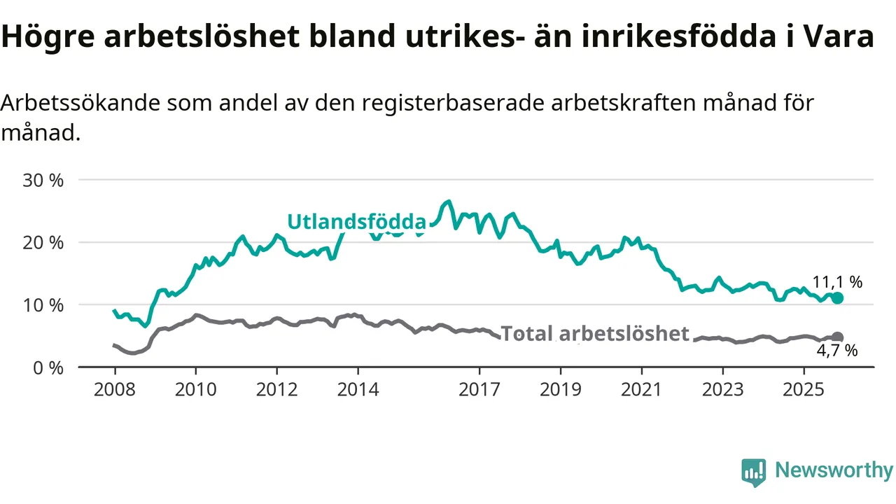 Skillnaden i arbetslöshet mellan utrikesfödda och hela befolkningen är 6,4 procentenheter i Vara. Det är en mindre skillnad än för ett år sedan (−1,3 procentenheter).