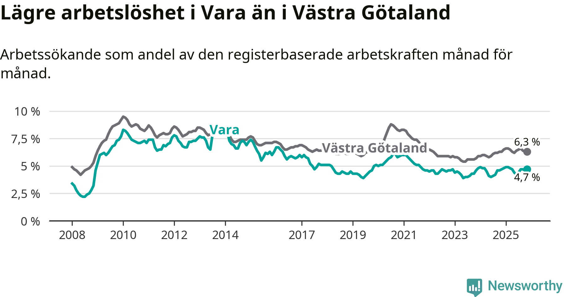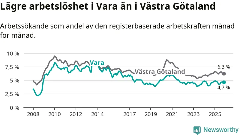 Arbetslösheten i Vara ligger under nivån i hela Västra Götalands län (4,7 procent i kommunen, jämfört med 6,3 procent i hela länet). Öckerö har den lägsta arbetslösheten i länet (2,9 procent), medan Gullspång har den högsta (8,6 procent). För att Vara skulle komma ner i samma arbetslöshetsnivå som Öckerö skulle 135 personer behöva sysselsättas.