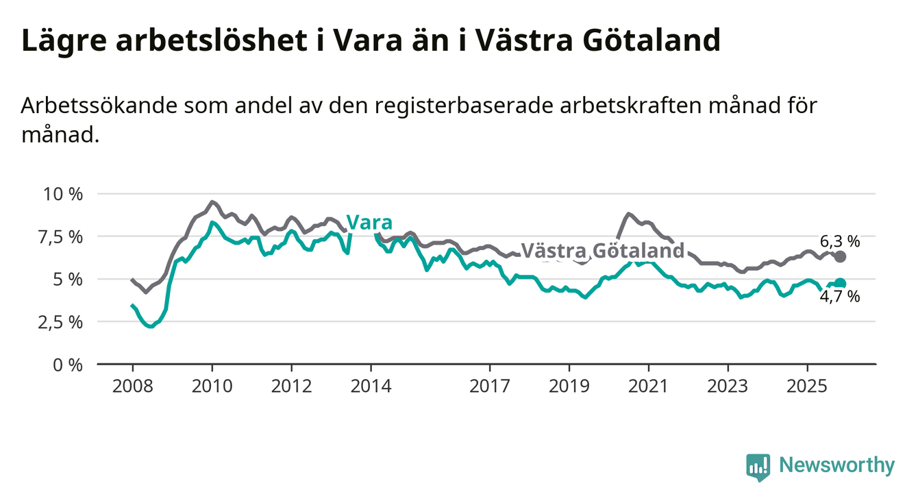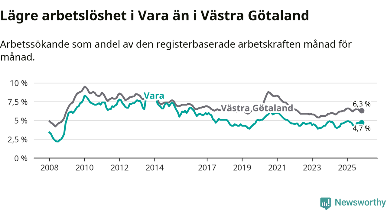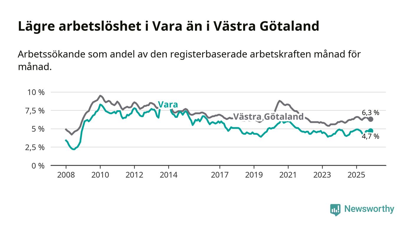 Ny statistik från Arbetsförmedlingen visar på en oförändrad i arbetslöshet i Vara kommun. Även i Västra Götaland står arbetslösheten stilla.