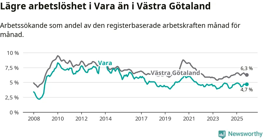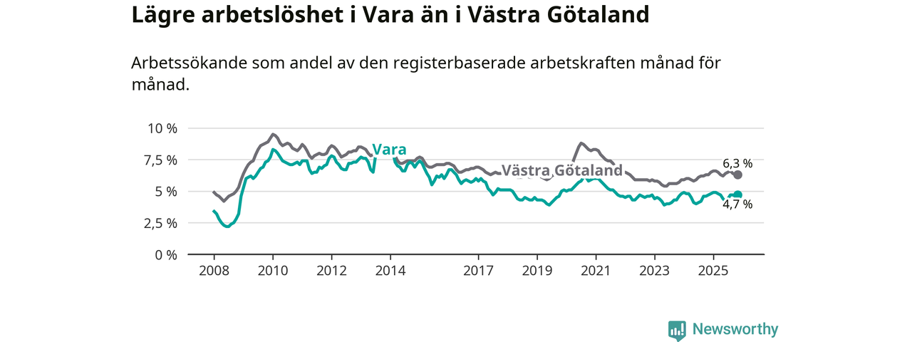 Under november månad rapporterade Vara kommun en total arbetslöshet på 4,7 procent. Det är i samma nivå som i november i fjol. Även i Västra Götalands län står arbetslösheten stilla