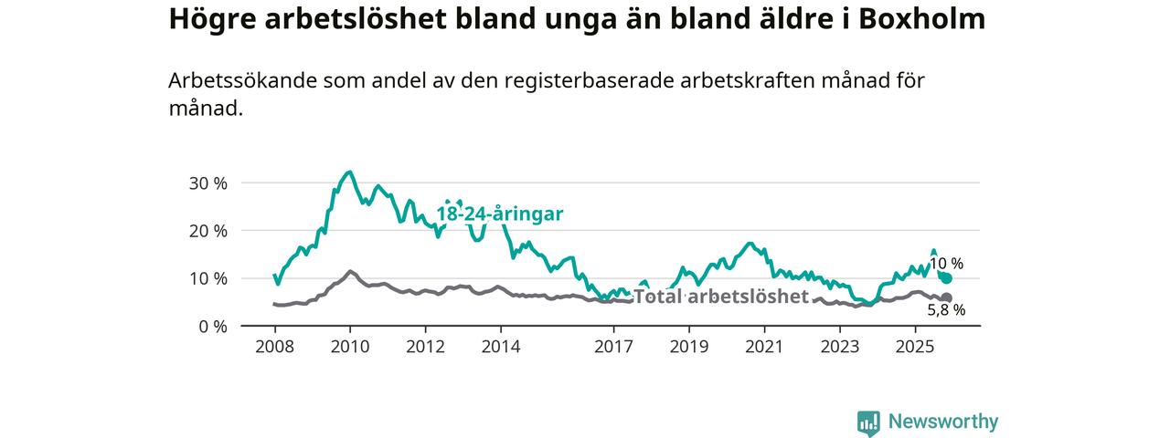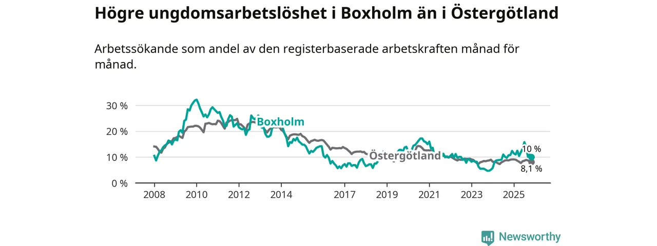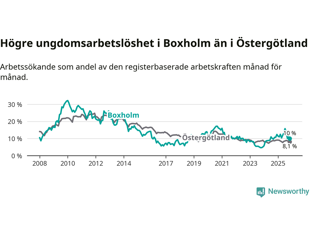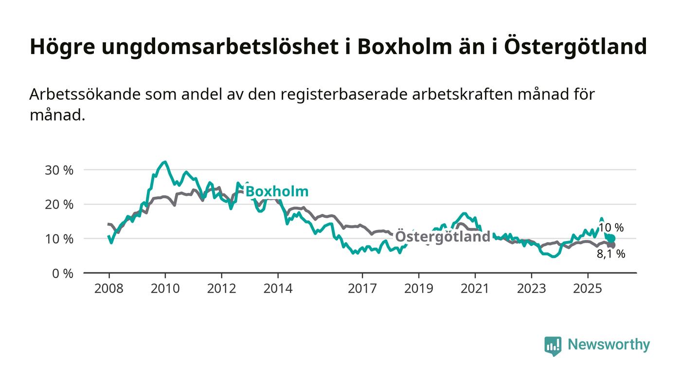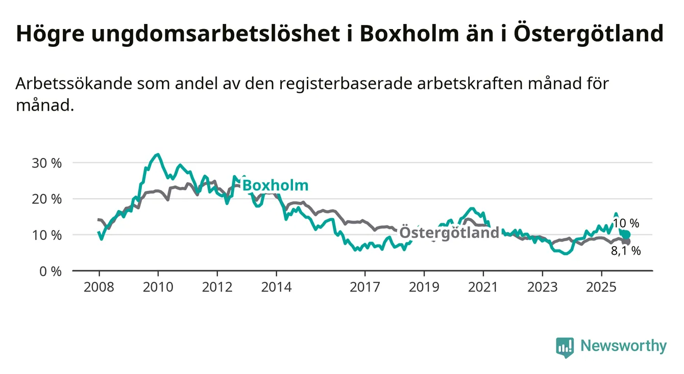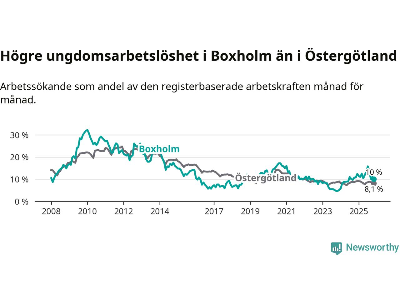 Medan Boxholm har lägre total arbetslöshet än Östergötland, ligger ungdomsarbetslösheten 1,9 procentenheter högre i Boxholm.