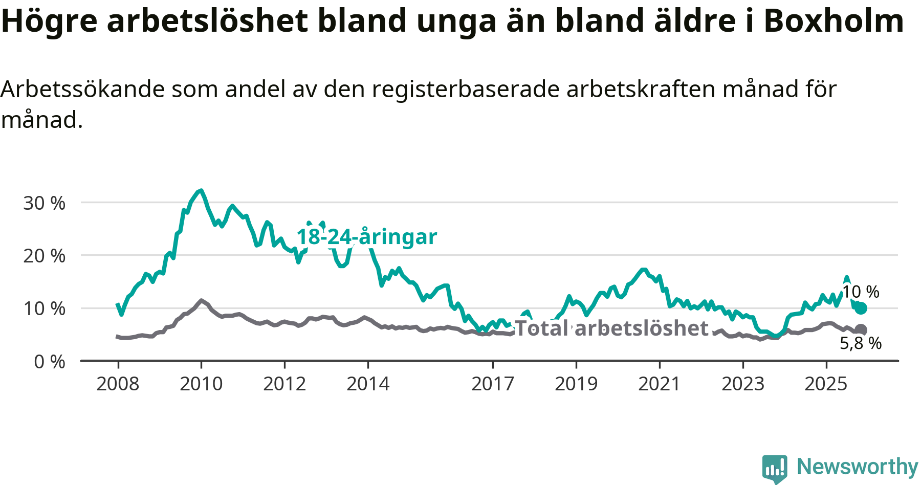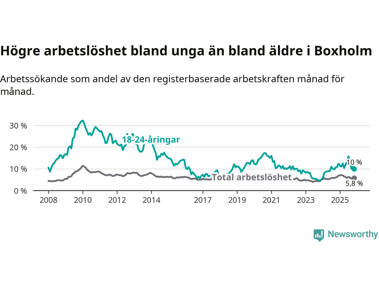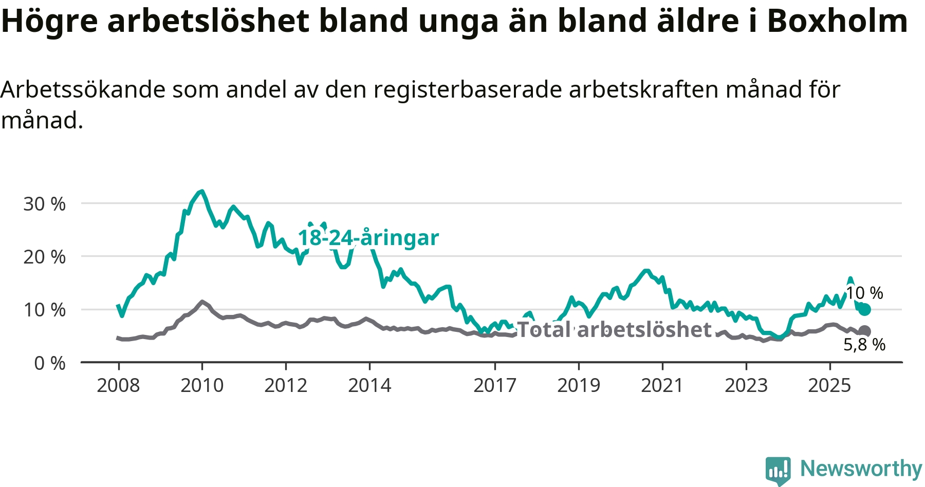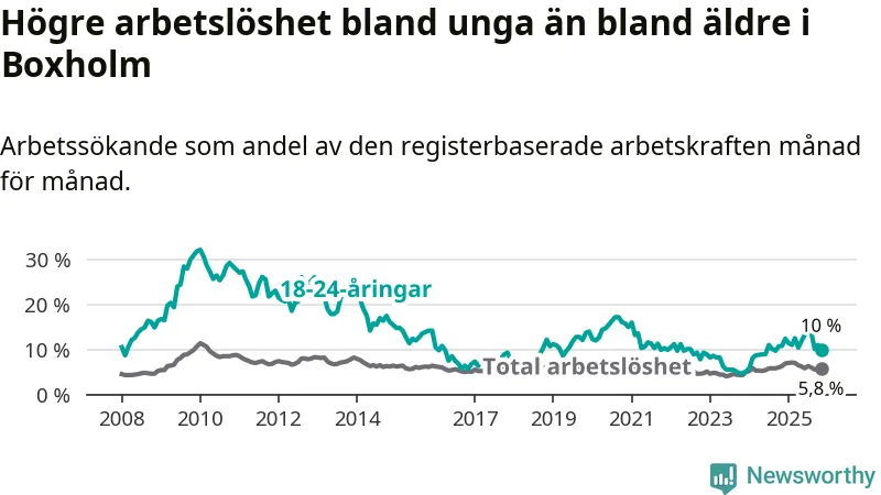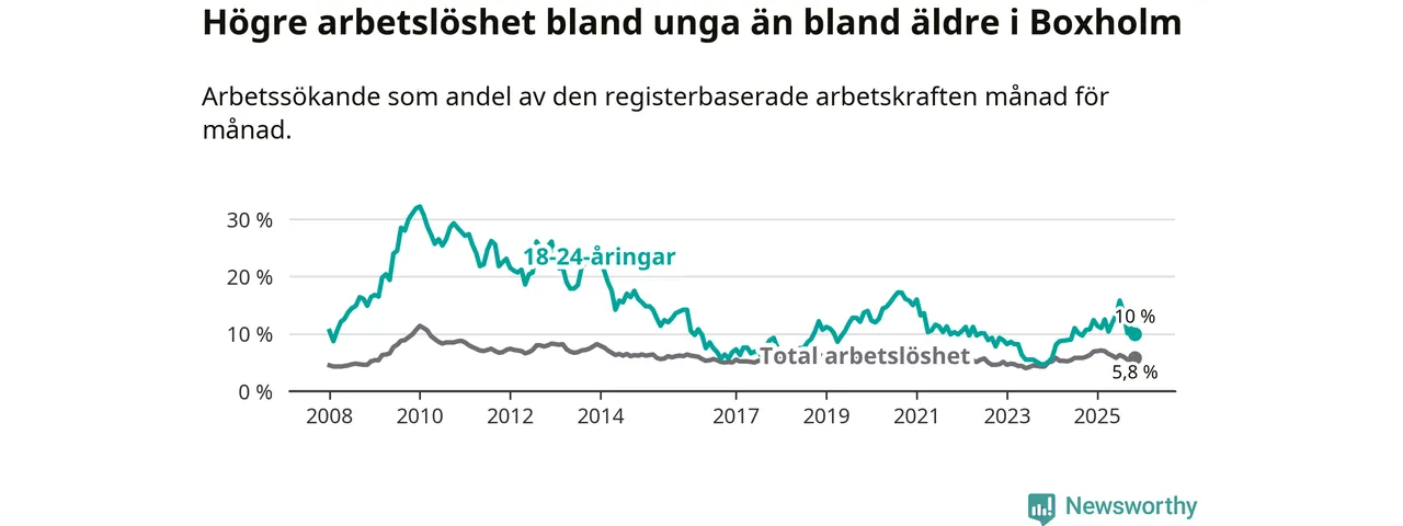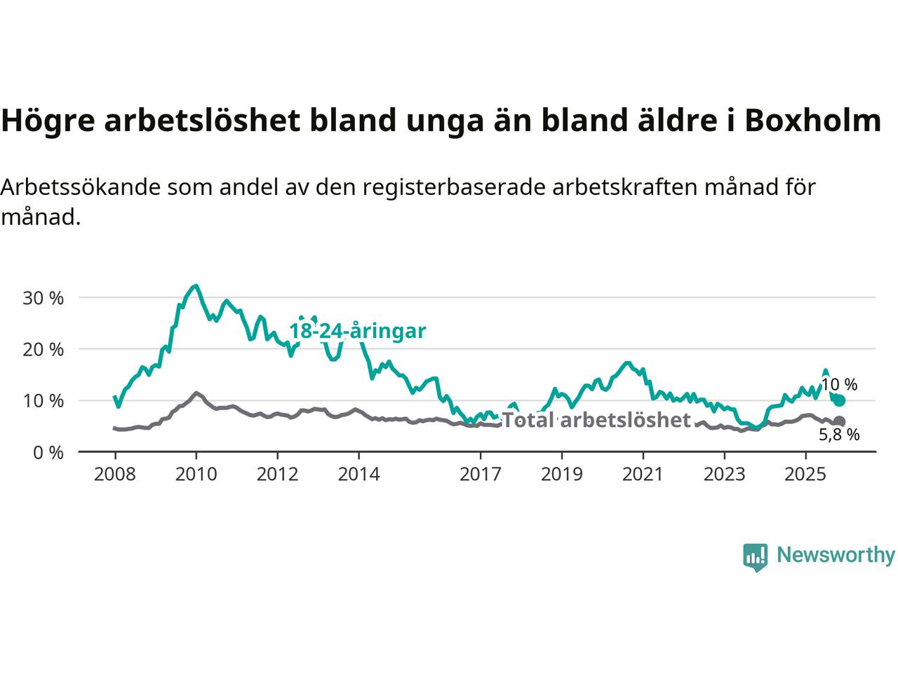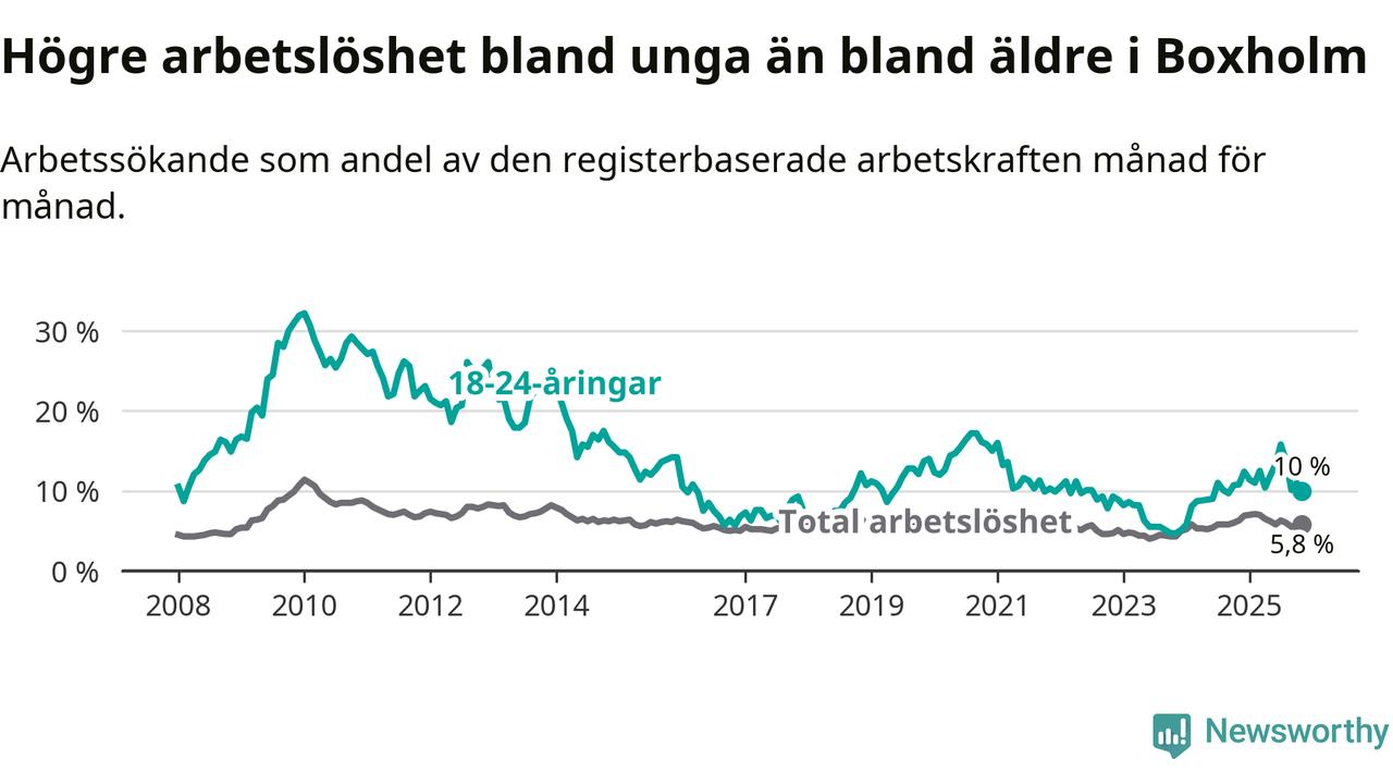 Medan Boxholm har lägre total arbetslöshet än Östergötland, ligger ungdomsarbetslösheten 1,9 procentenheter högre i Boxholm.