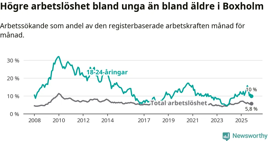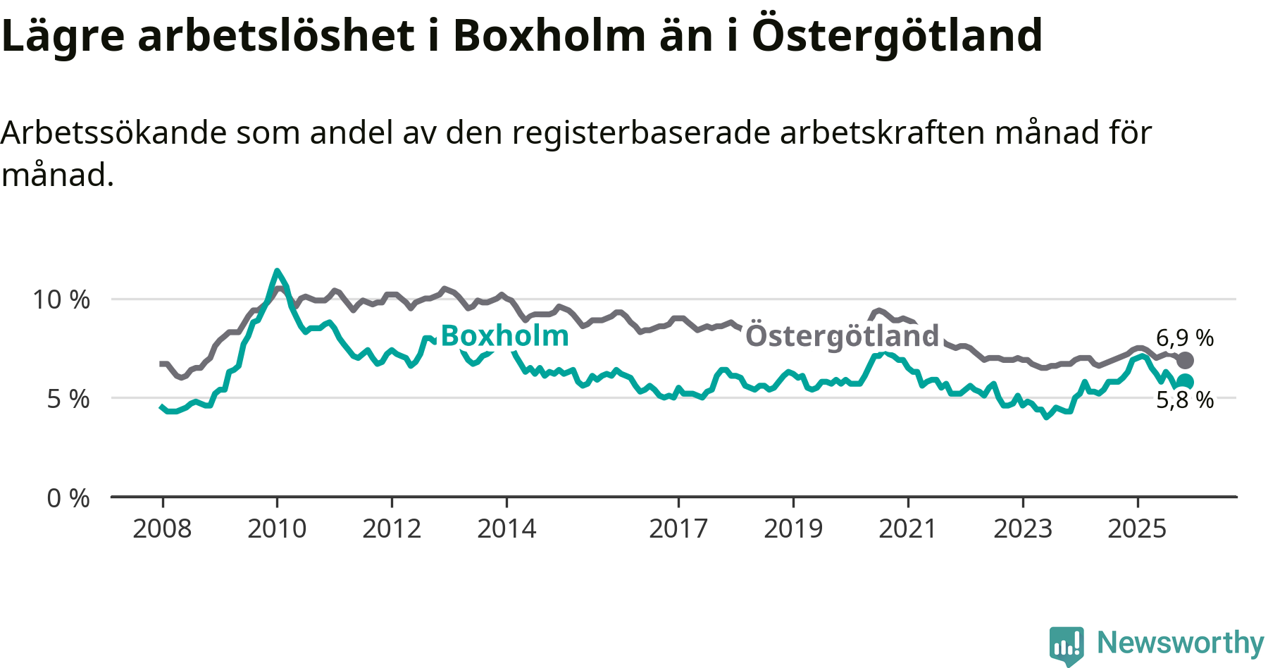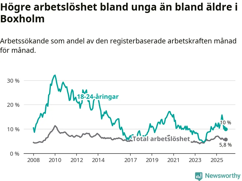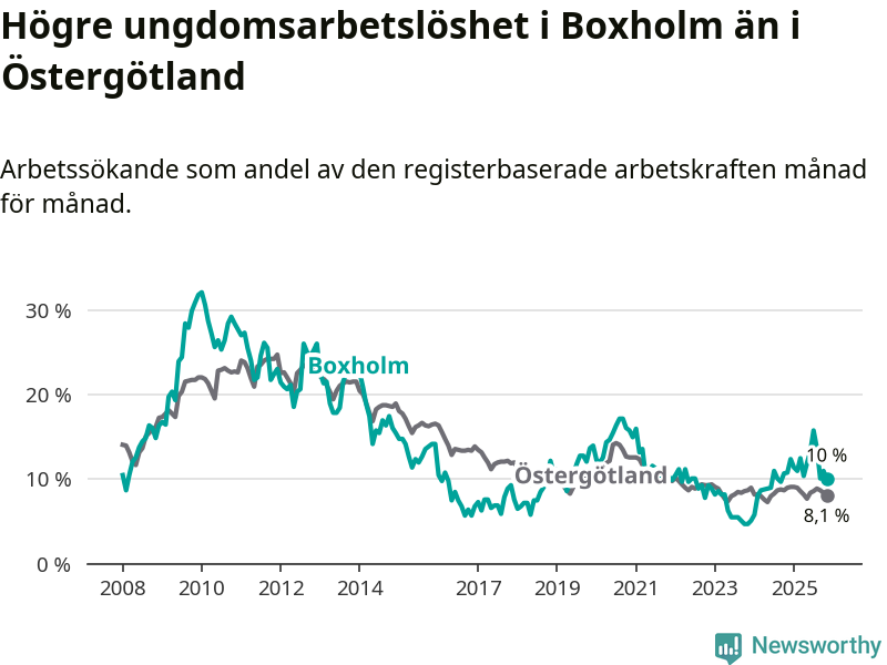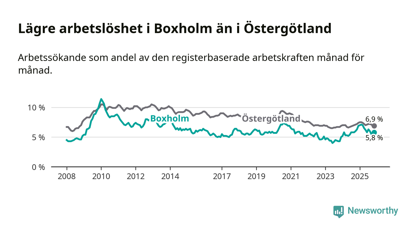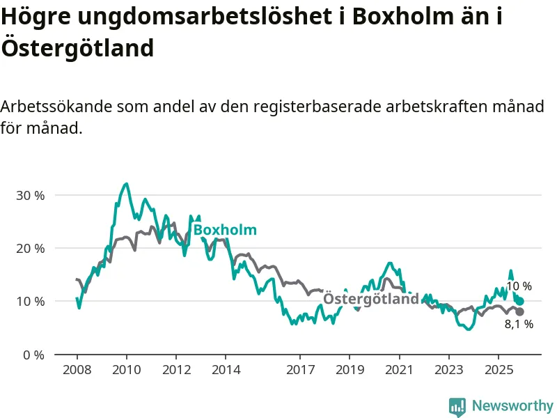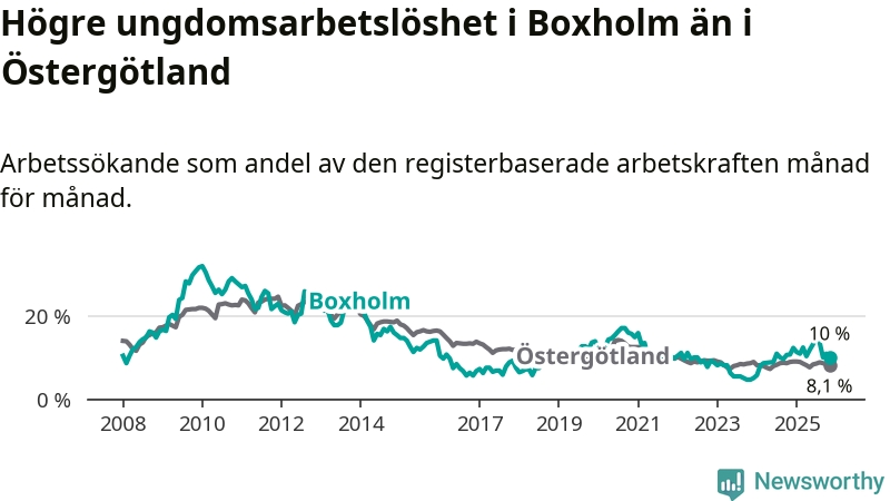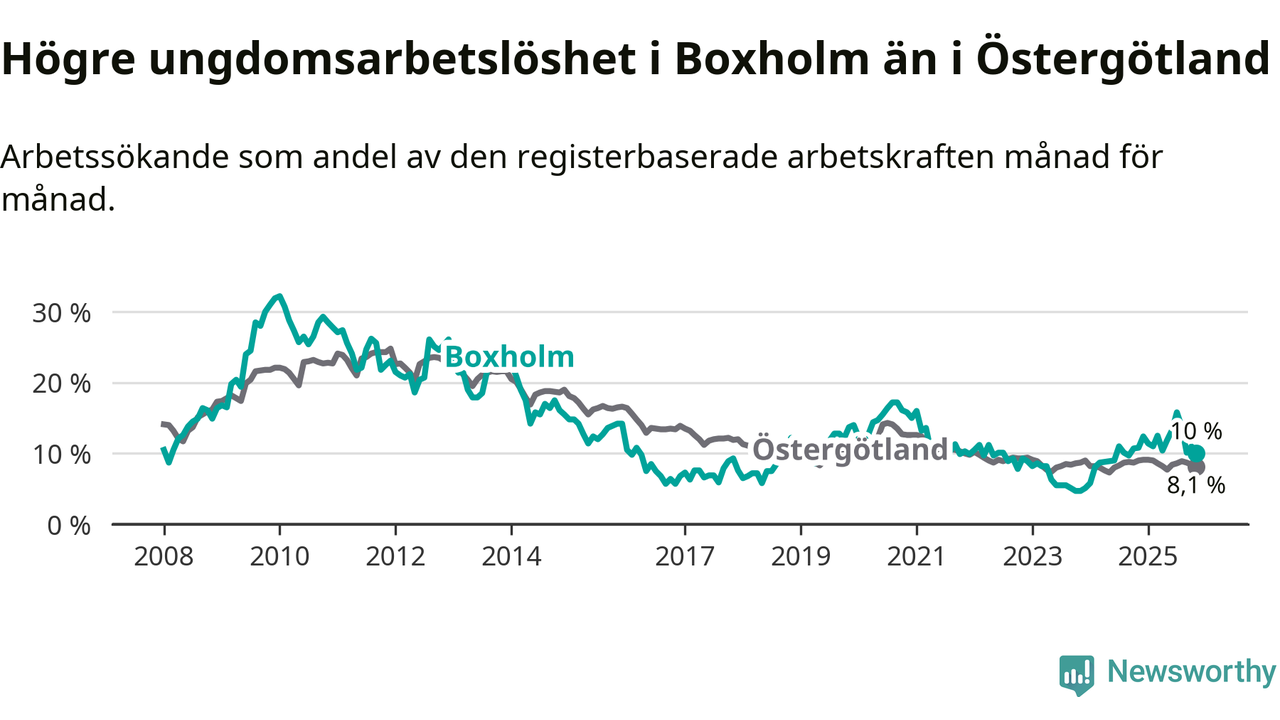 Medan Boxholm har lägre total arbetslöshet än Östergötland, ligger ungdomsarbetslösheten 1,9 procentenheter högre i Boxholm.