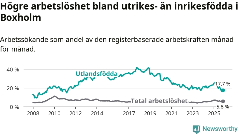 Arbetslösheten bland utlandsfödda var 17,7 procent i Boxholm under november månad, motsvarande 57 av 322 personer. Det är 5,6 procentenheter färre än vid samma tidpunkt i fjol (−16 om man räknar personer).