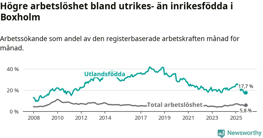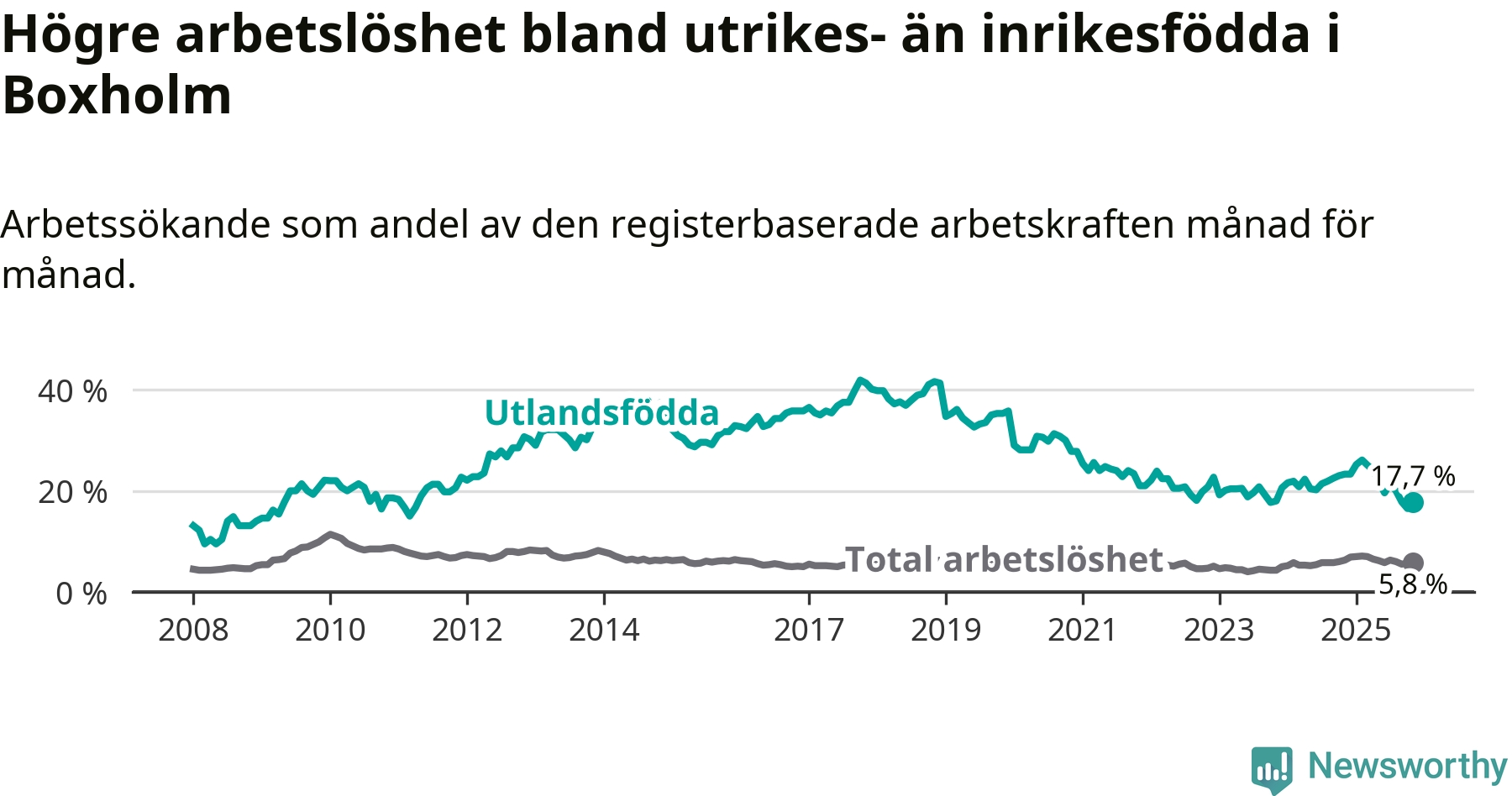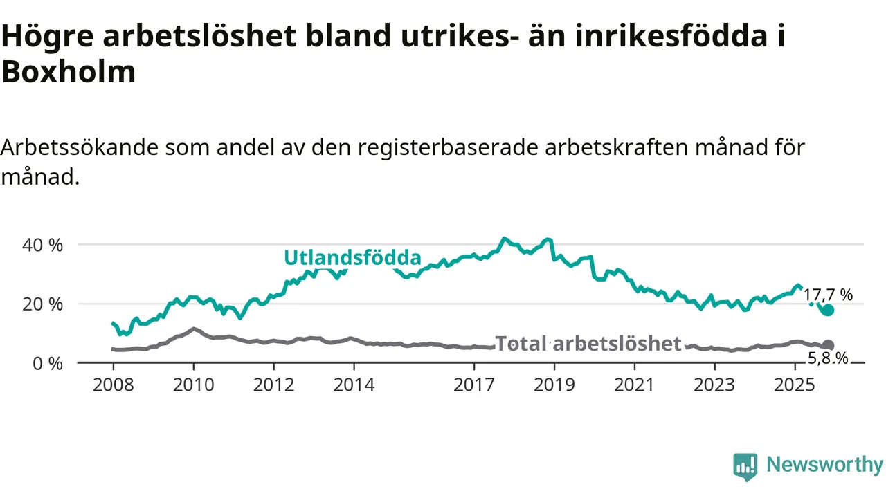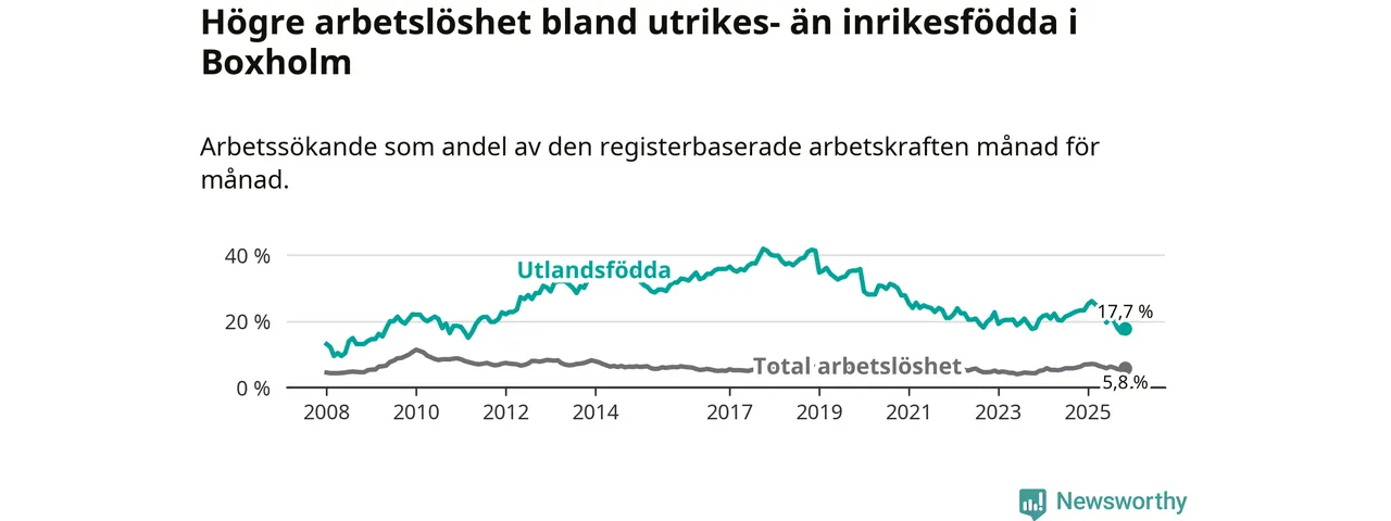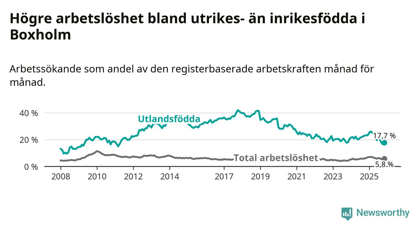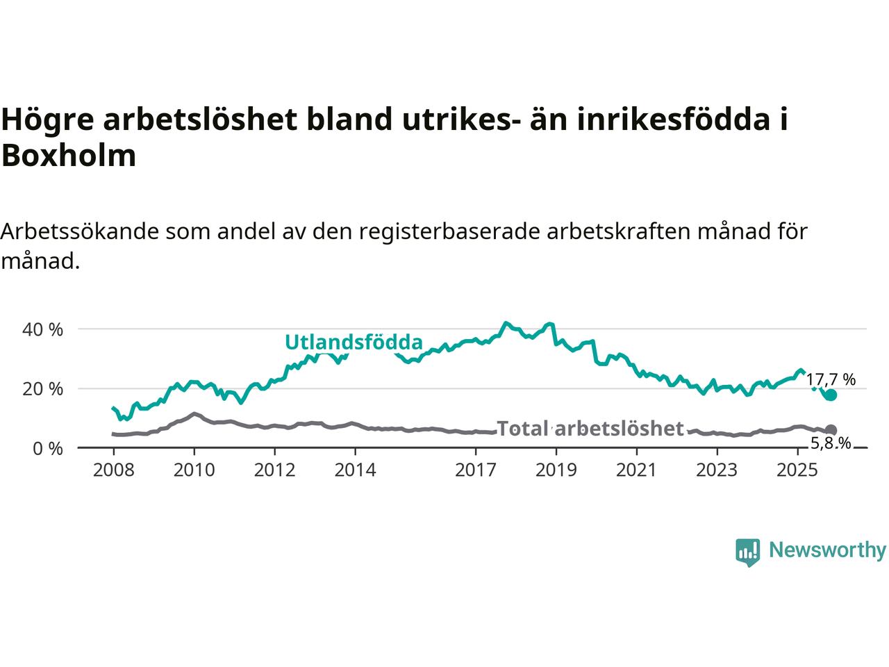 Skillnaden i arbetslöshet mellan utrikesfödda och hela befolkningen är 11,9 procentenheter i Boxholm. Det är en betydligt mindre skillnad än för ett år sedan (−5,1 procentenheter).