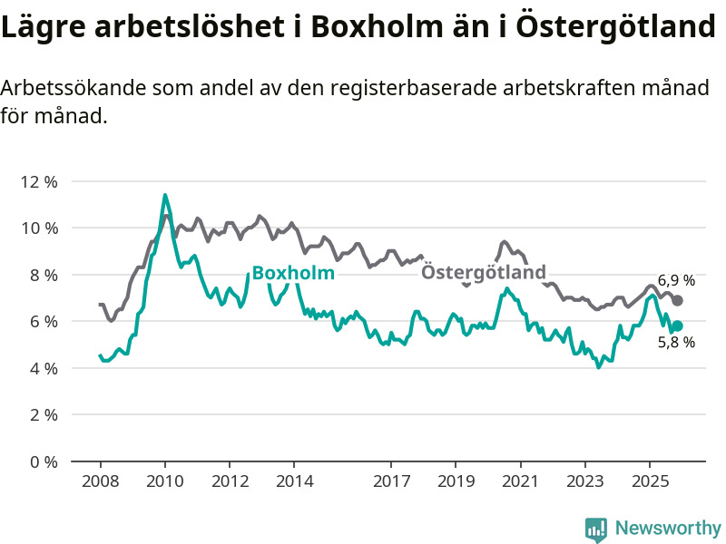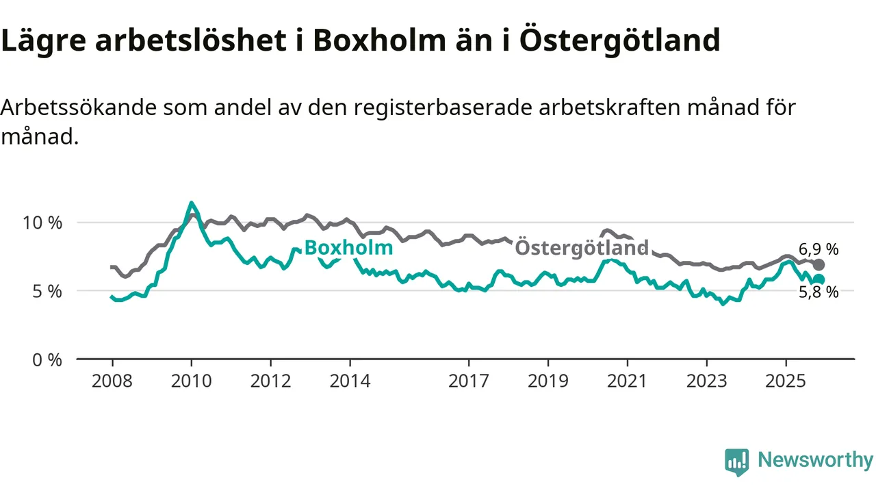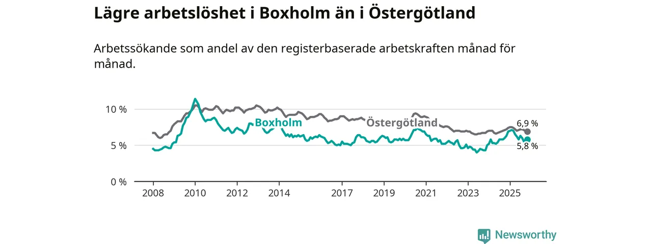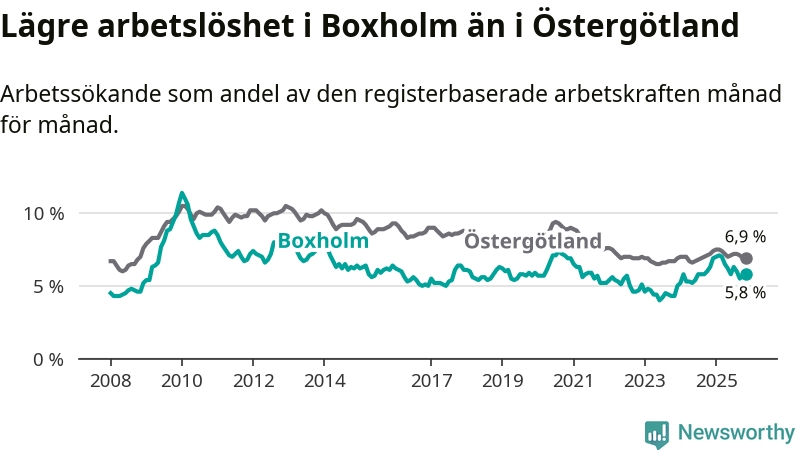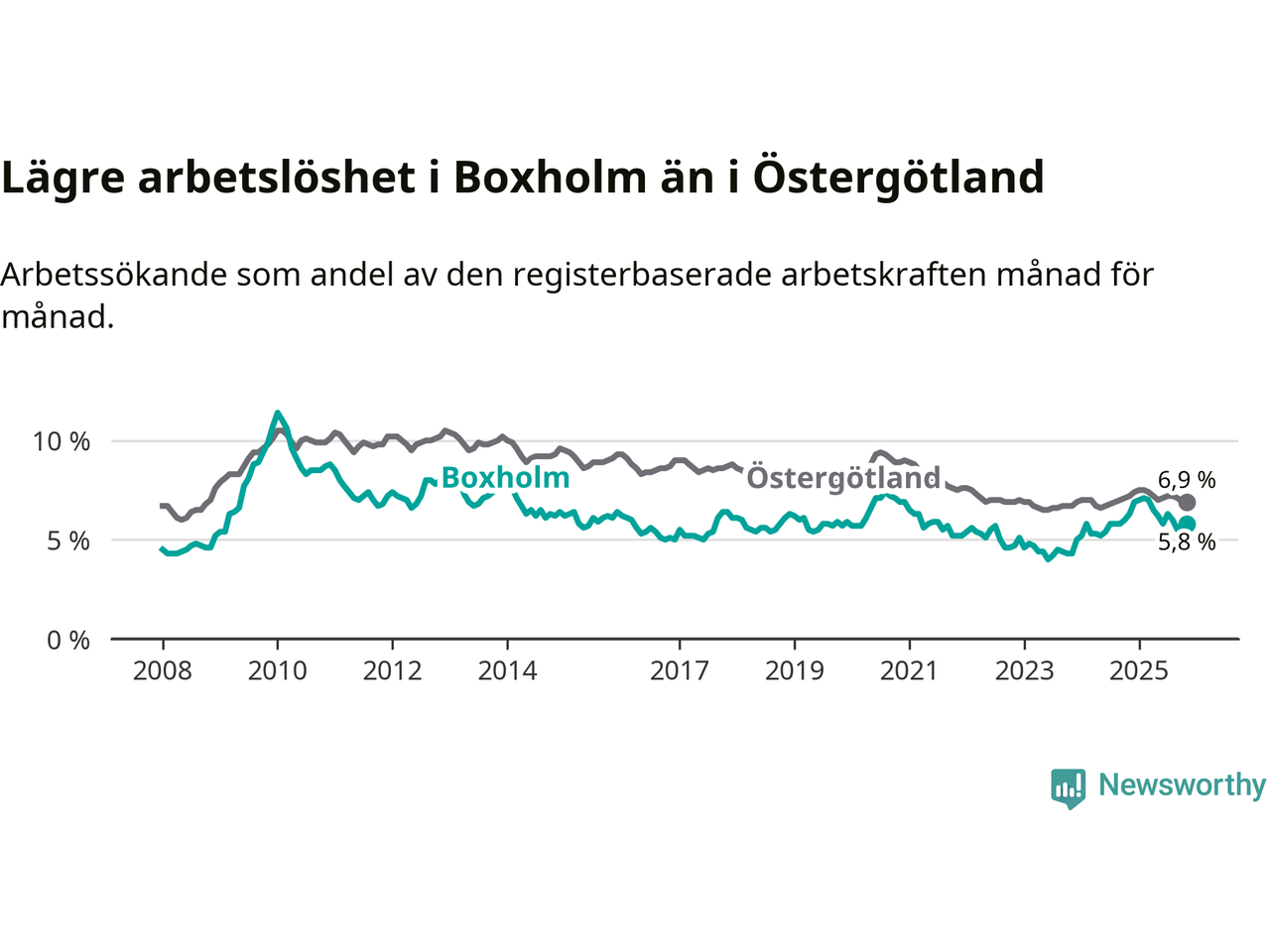 Under november månad rapporterade Boxholms kommun en total arbetslöshet på 5,8 procent. Det är en minskning jämfört med samma tidpunkt i fjol (−0,5 procentenheter). Även i Östergötlands län sjunker arbetslösheten .