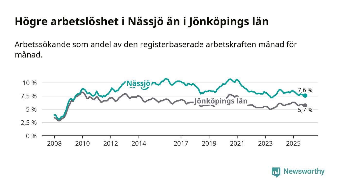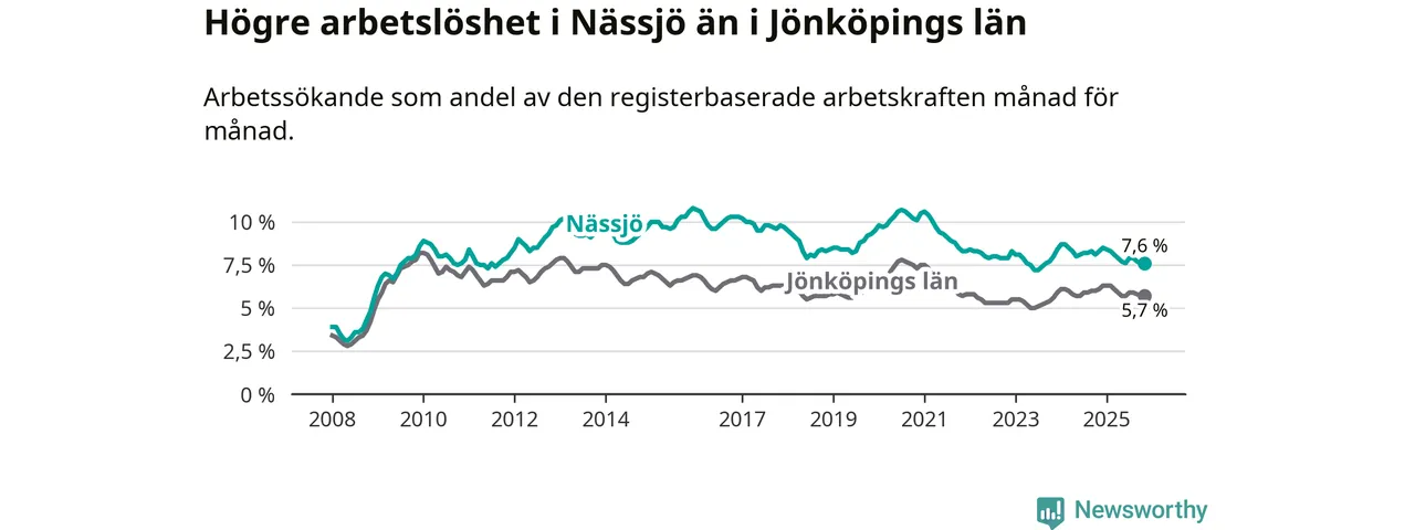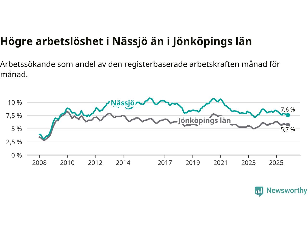 Under november månad rapporterade Nässjö kommun en total arbetslöshet på 7,6 procent. Det är en minskning jämfört med samma tidpunkt i fjol (−0,7 procentenheter). Även i Jönköpings län sjunker arbetslösheten .