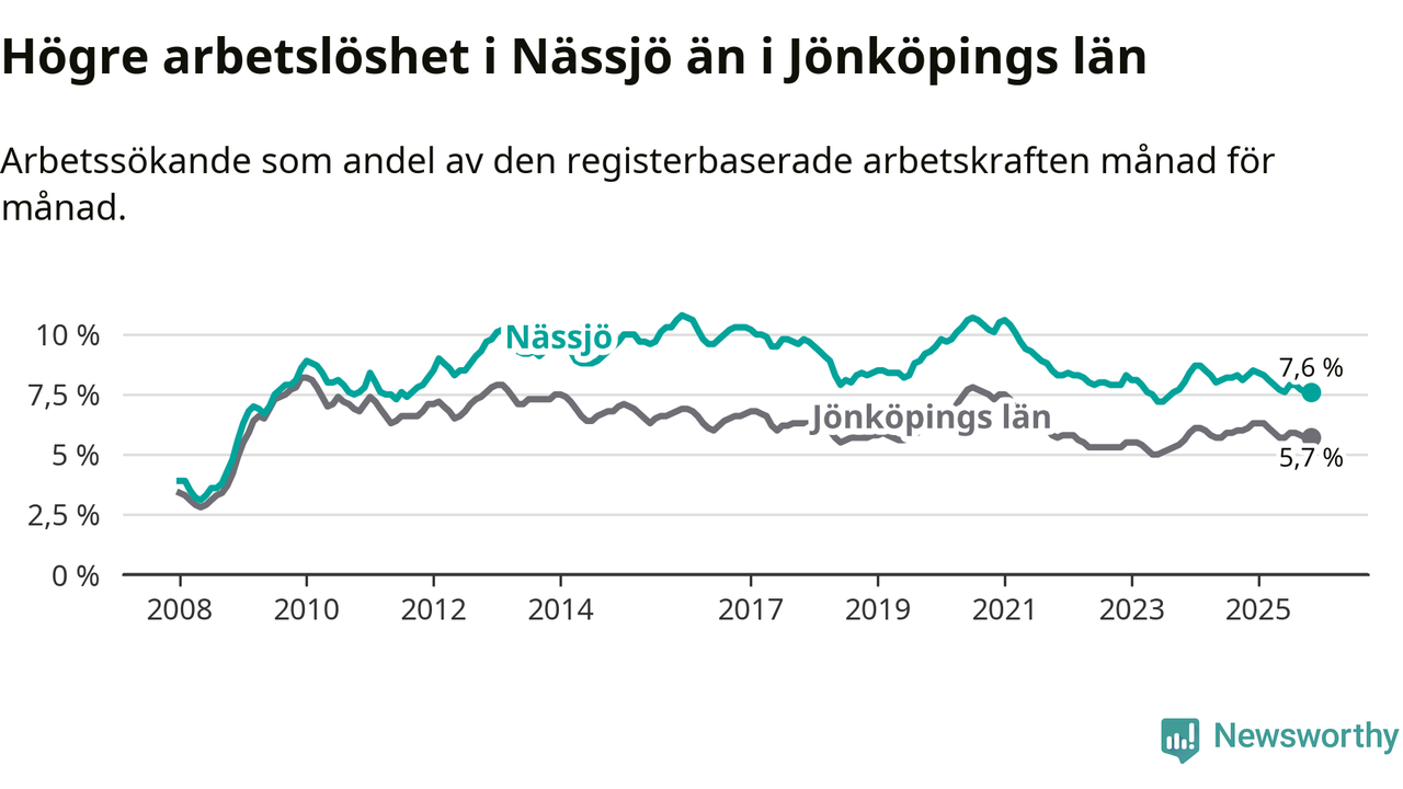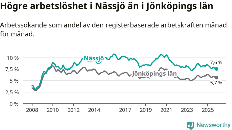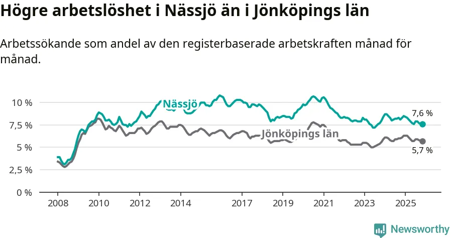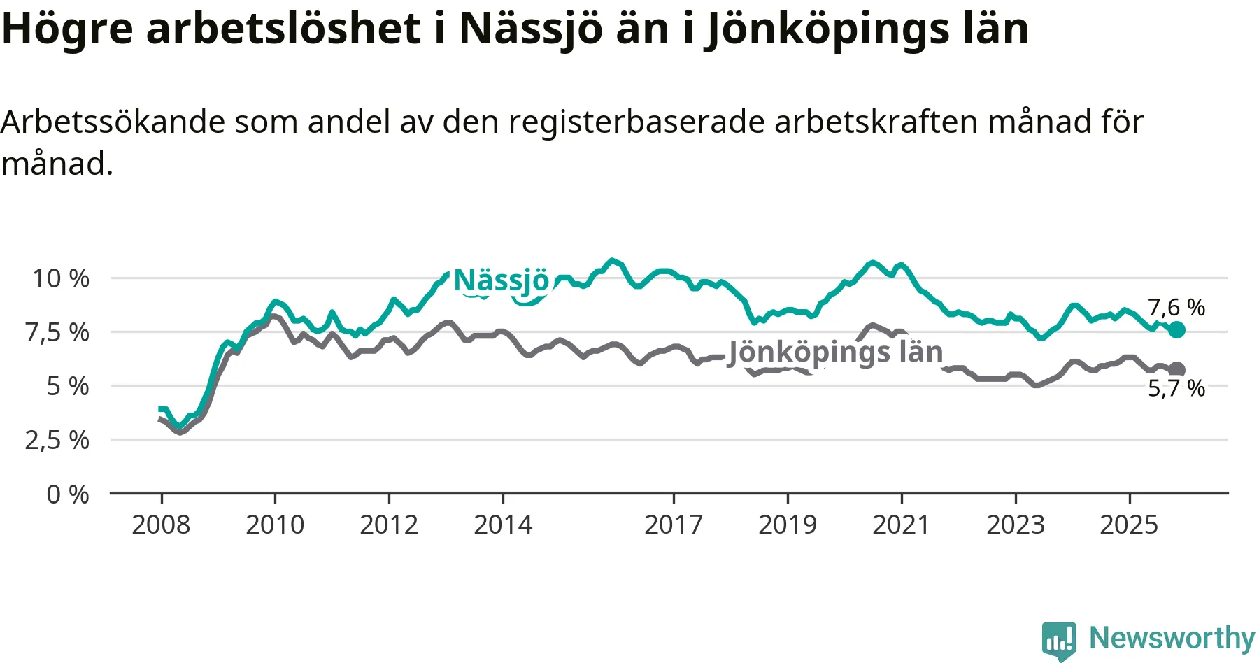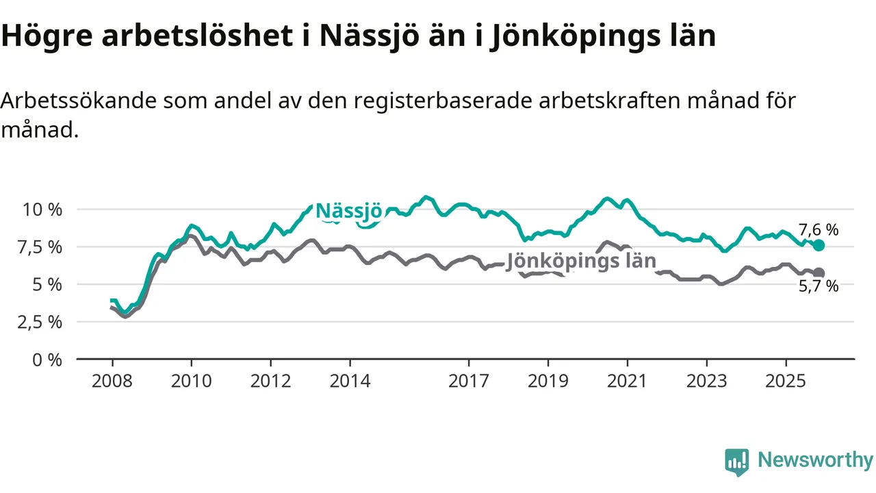 Under november månad rapporterade Nässjö kommun en total arbetslöshet på 7,6 procent. Det är en minskning jämfört med samma tidpunkt i fjol (−0,7 procentenheter). Även i Jönköpings län sjunker arbetslösheten .