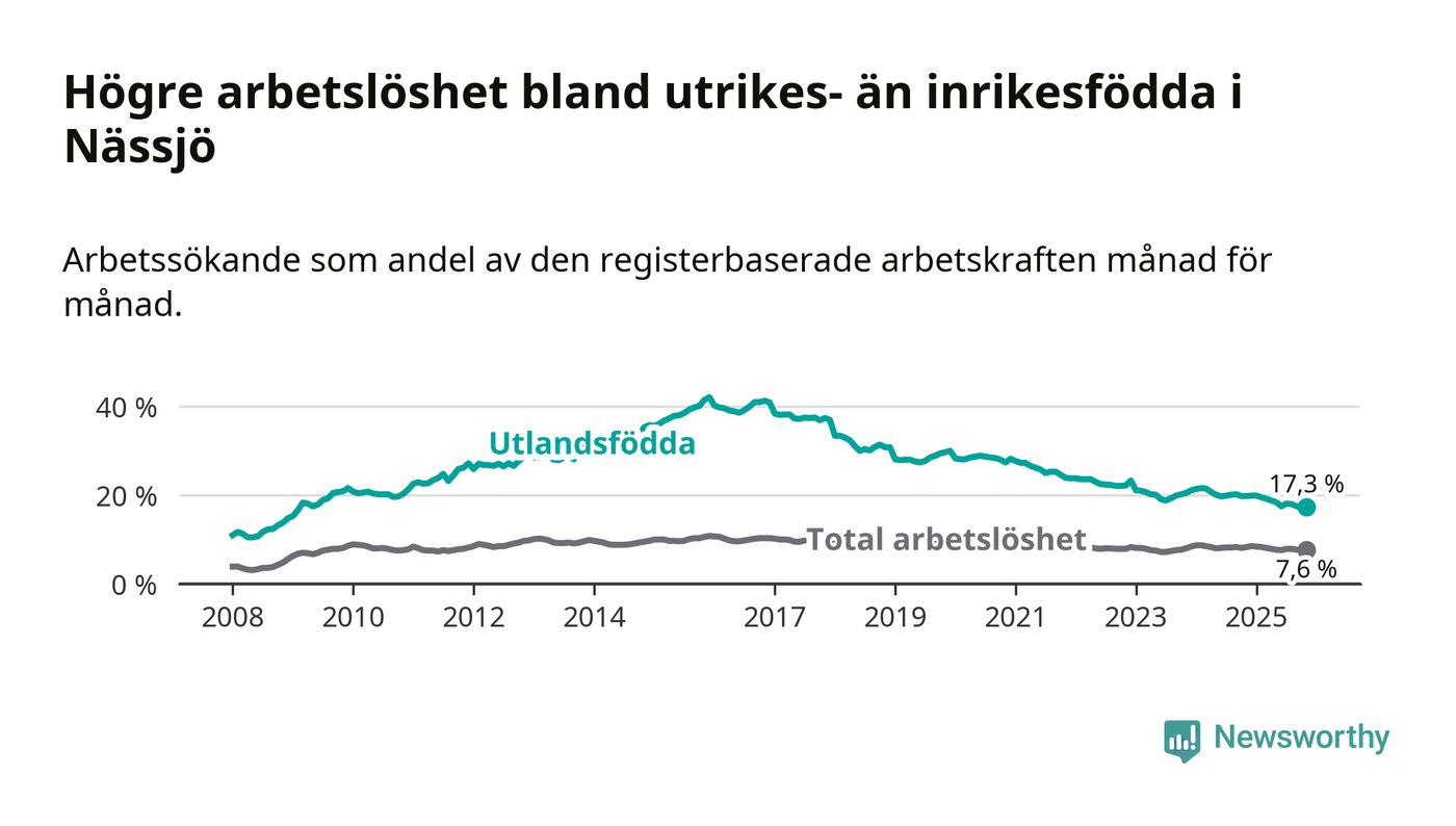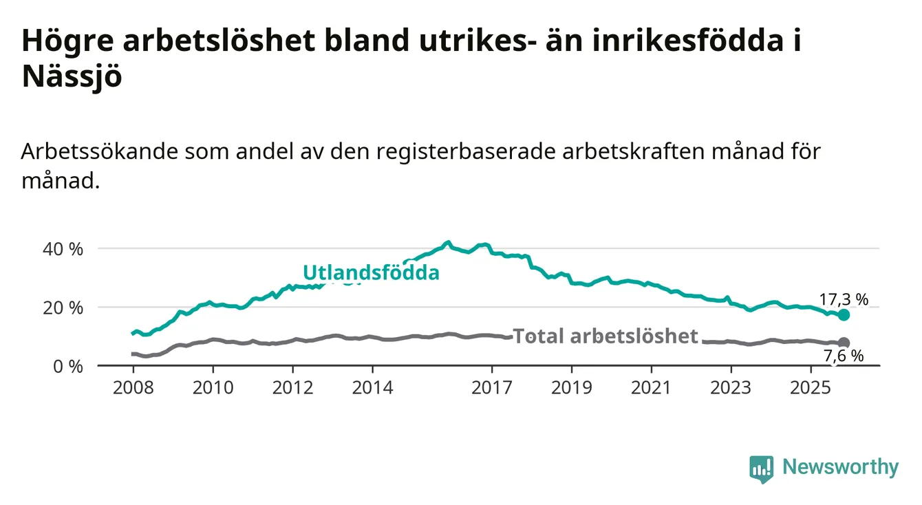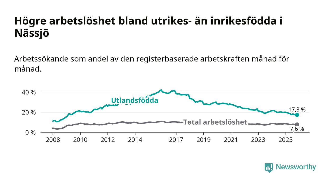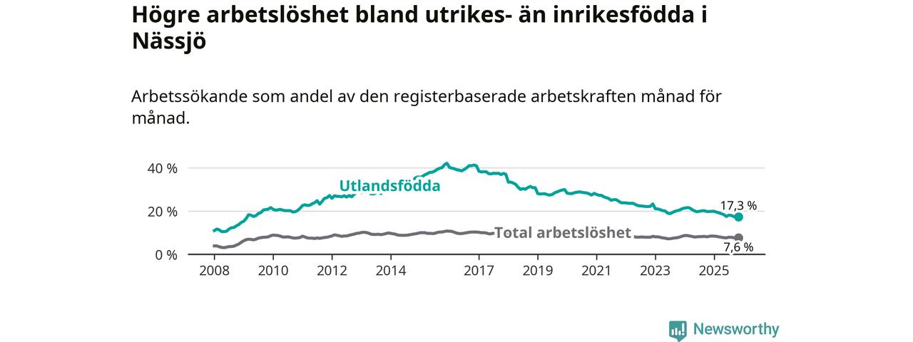 Arbetslösheten bland utlandsfödda var 17,3 procent i Nässjö under november månad, motsvarande 684 av 3 954 personer. Det är 2,5 procentenheter färre än vid samma tidpunkt i fjol (−99 om man räknar personer). Därmed är de utlandsföddas arbetslöshet lägre än vid samma tidpunkt i fjol för 14:e månaden i följd. Sedan september 2024 har arbetslösheten bland utlandsfödda minskat från 20,2 till 17,3 procent.