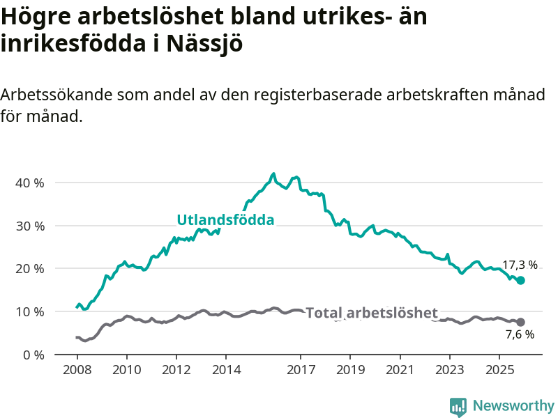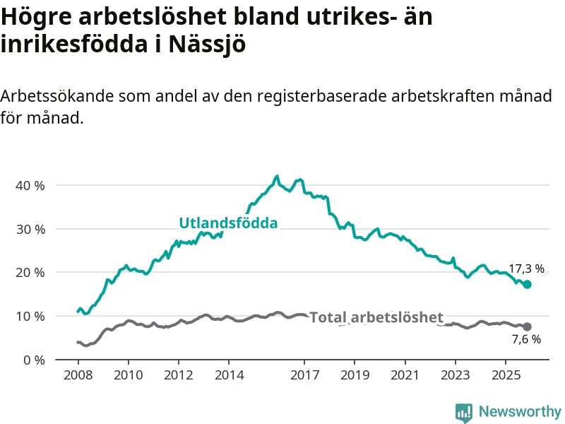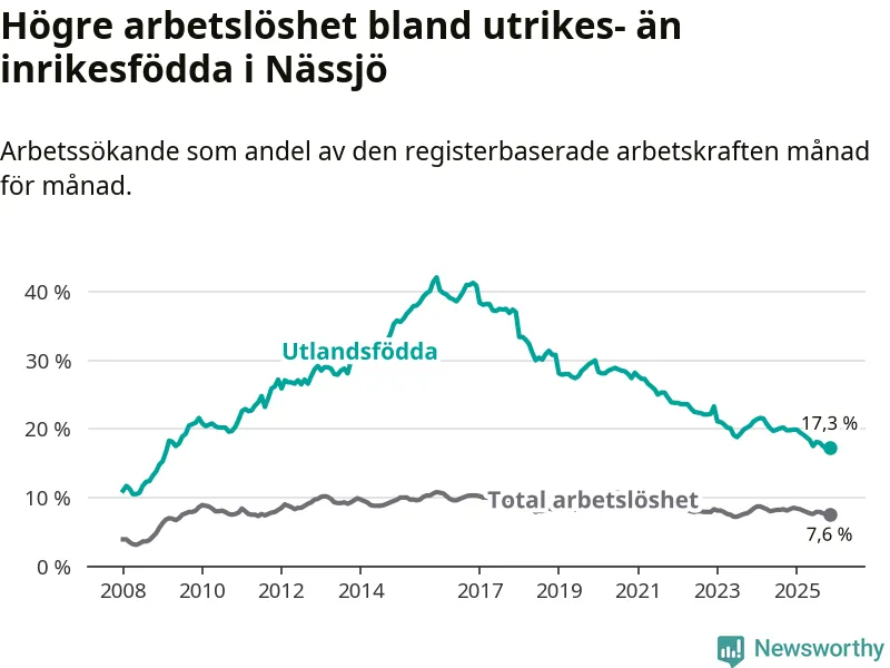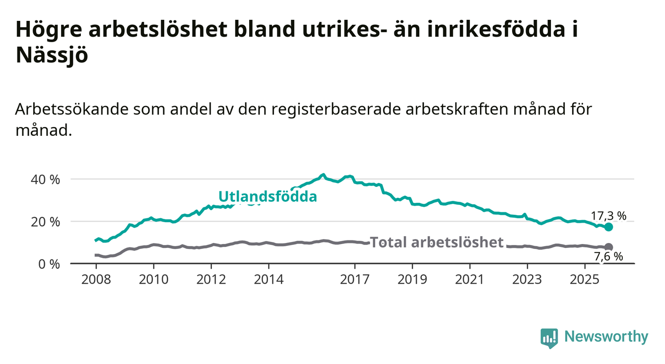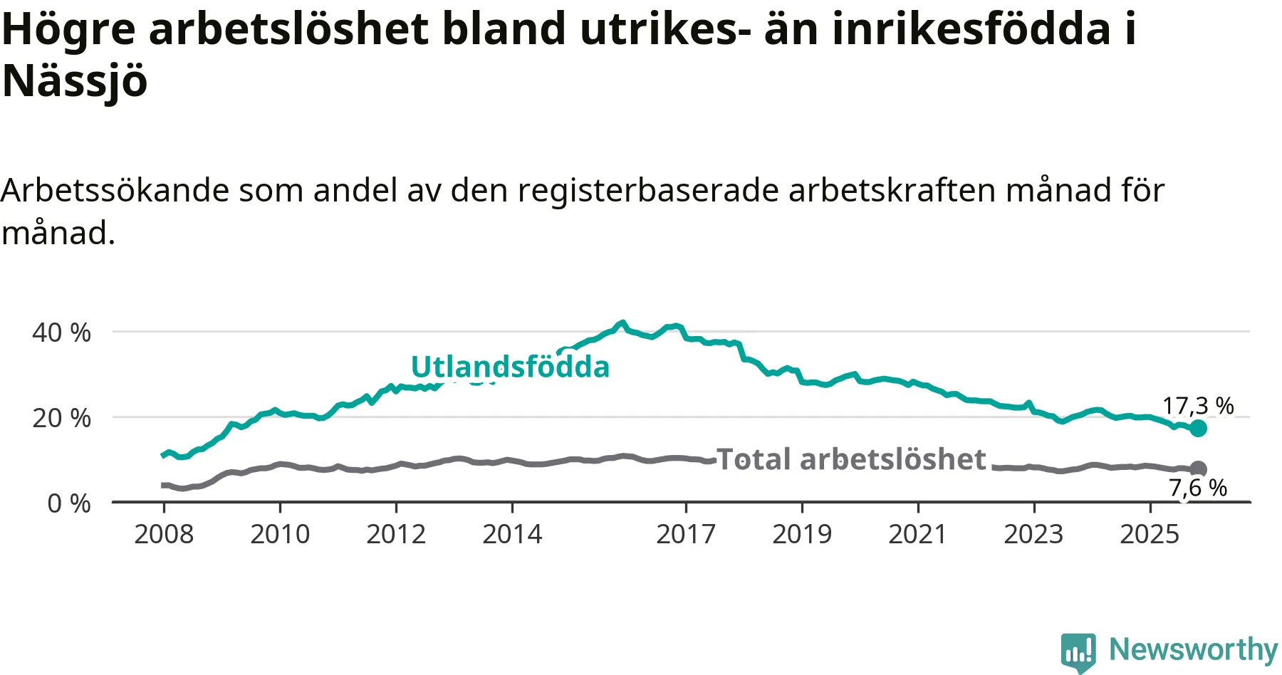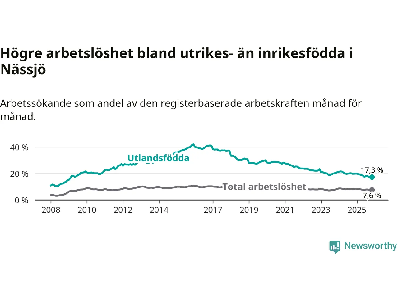 Arbetslösheten bland utlandsfödda var 17,3 procent i Nässjö under november månad, motsvarande 684 av 3 954 personer. Det är 2,5 procentenheter färre än vid samma tidpunkt i fjol (−99 om man räknar personer). Därmed är de utlandsföddas arbetslöshet lägre än vid samma tidpunkt i fjol för 14:e månaden i följd. Sedan september 2024 har arbetslösheten bland utlandsfödda minskat från 20,2 till 17,3 procent.