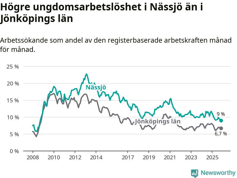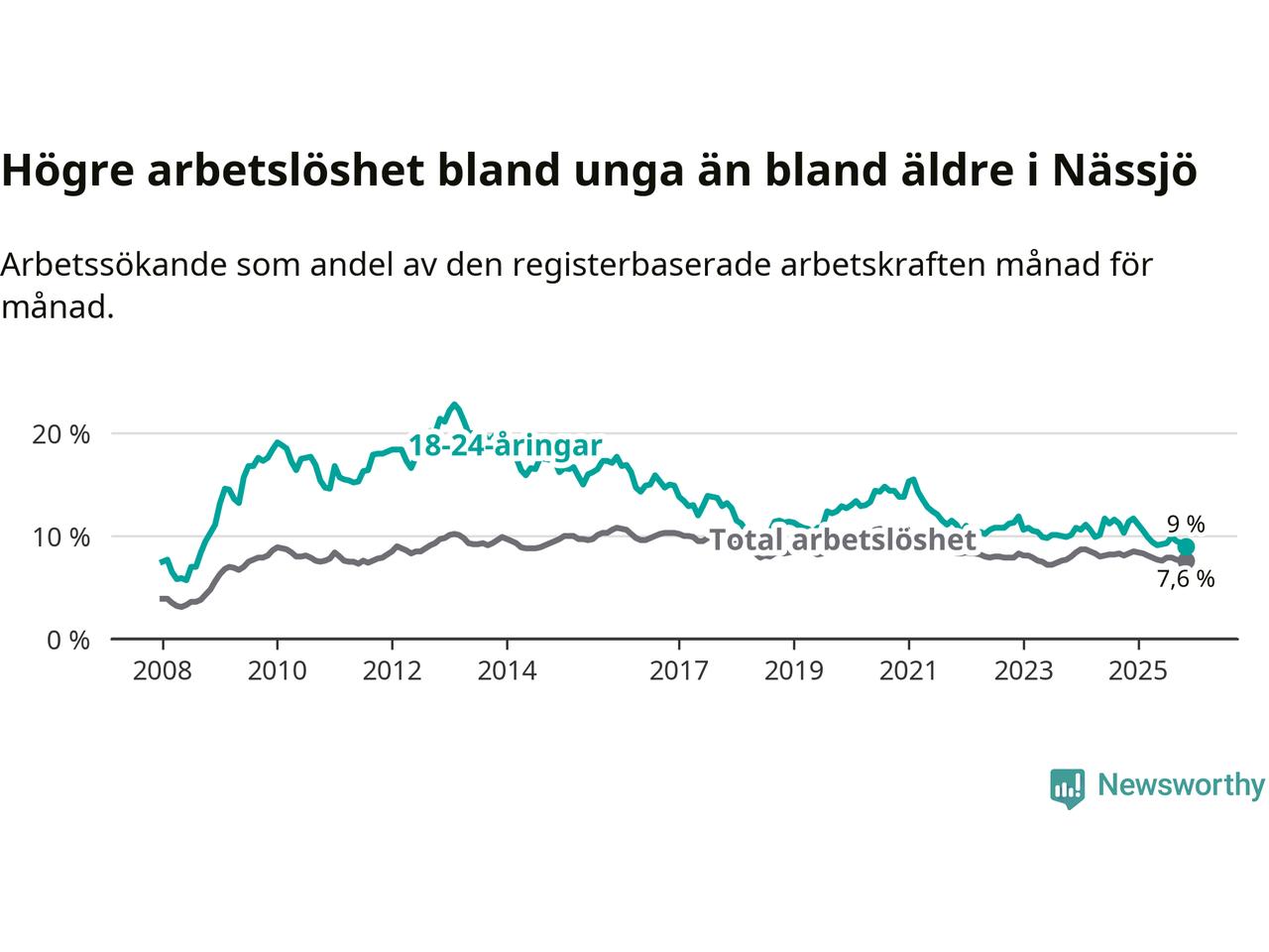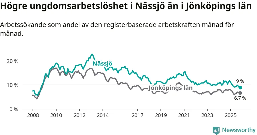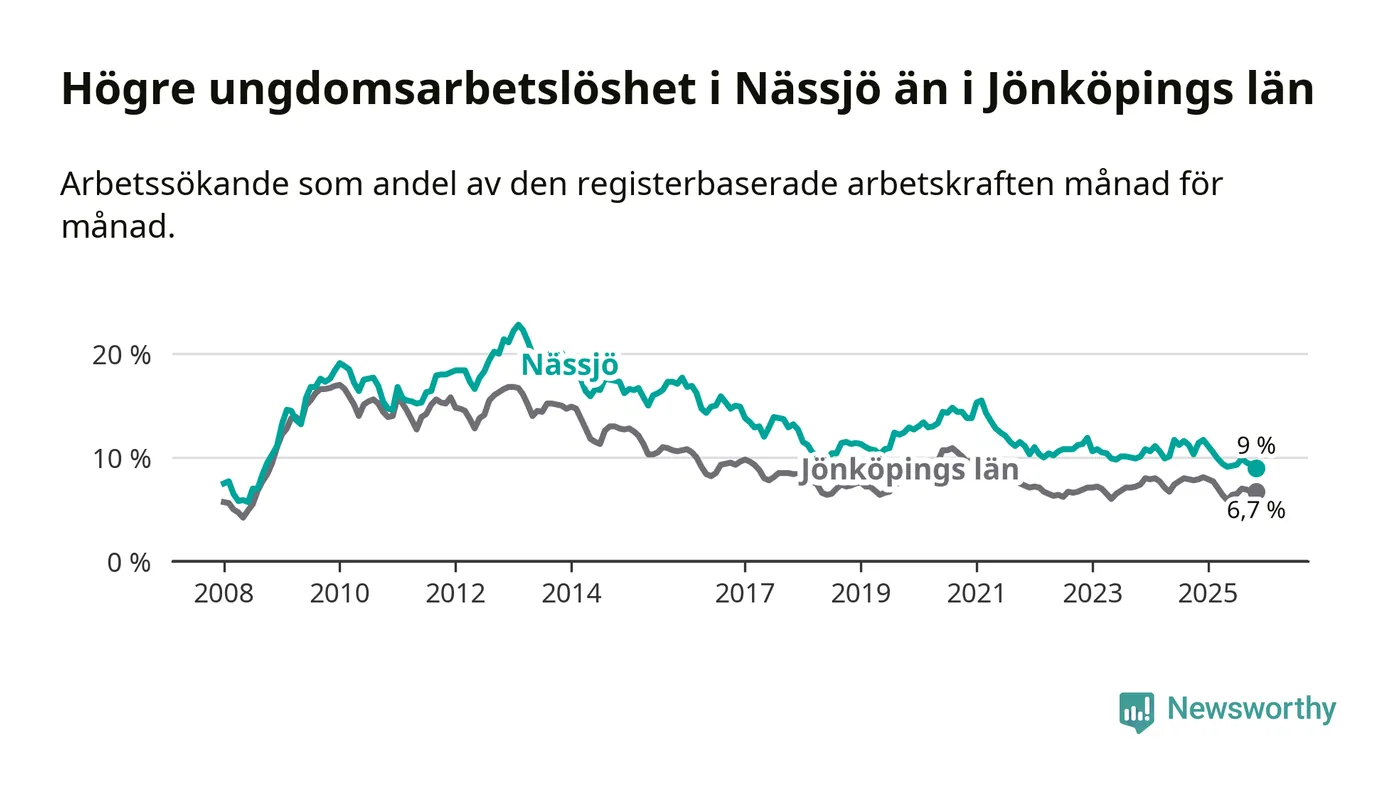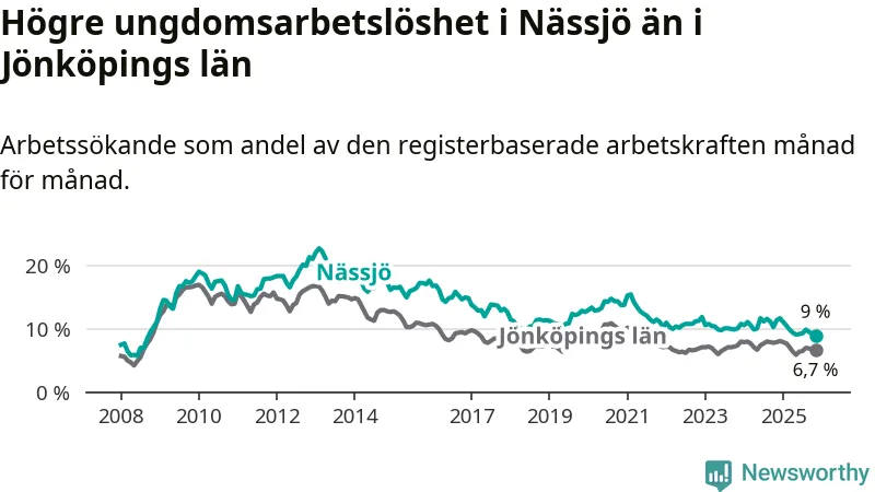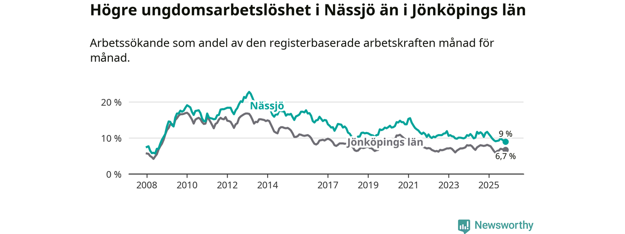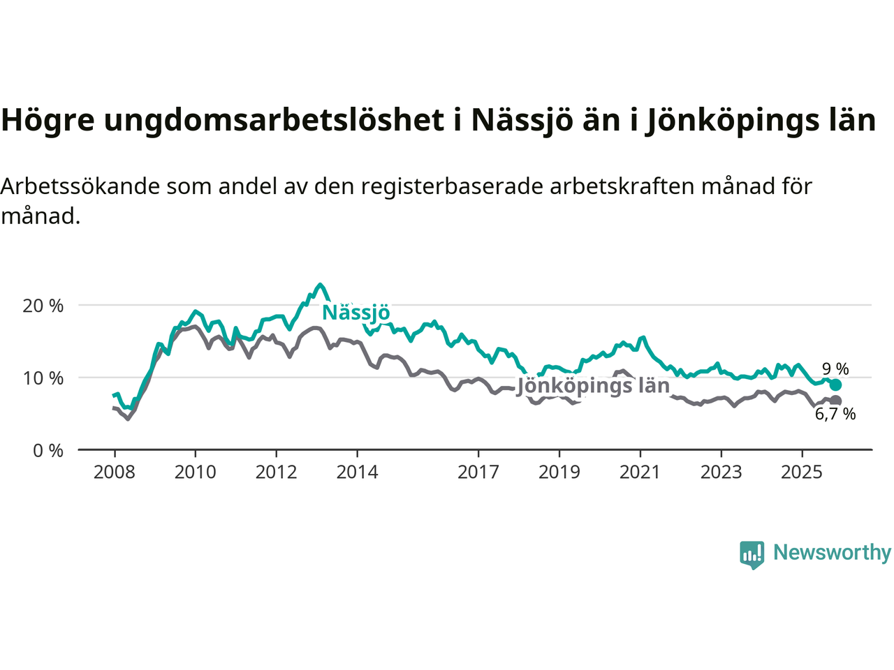 Precis som den totala arbetslösheten ligger ungdomsarbetslösheten i Nässjö högre än i Jönköpings län som helhet. Skillnaden mellan kommunen och länet är 2,3 procentenheter.