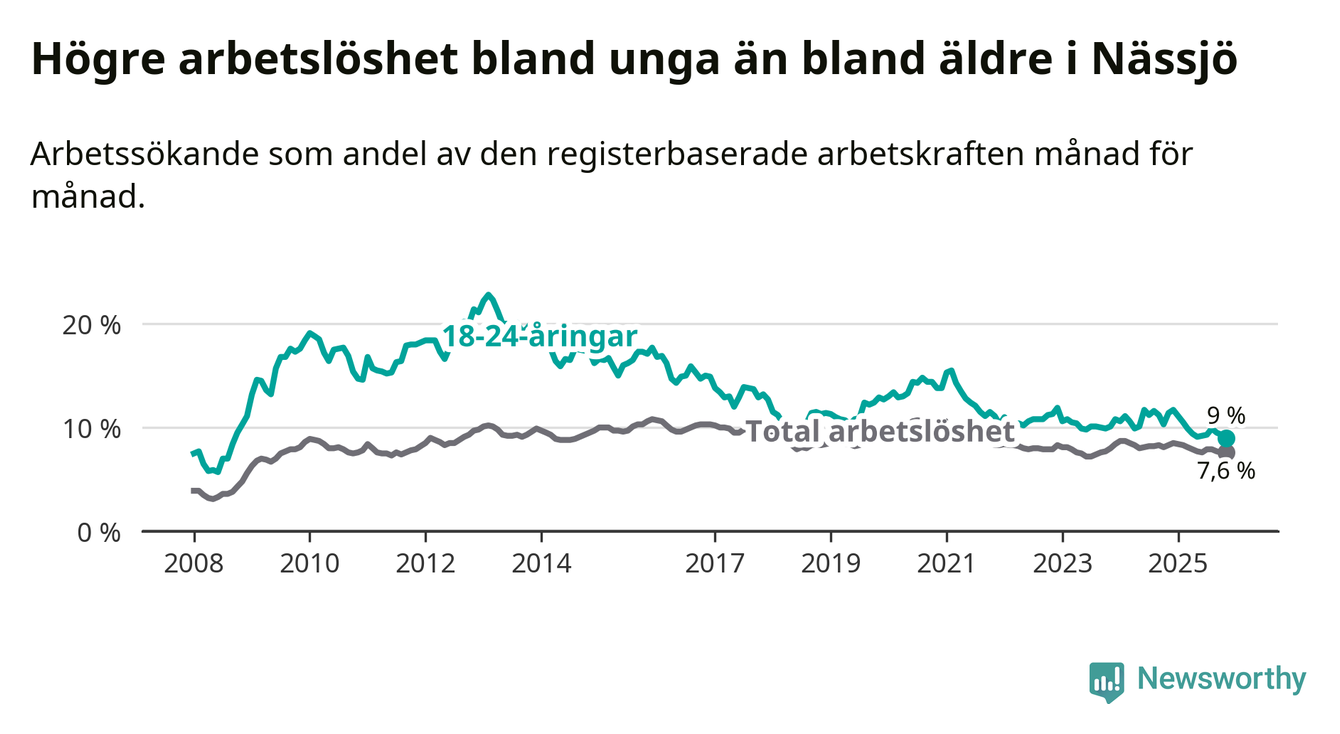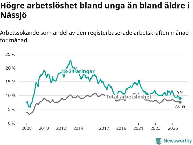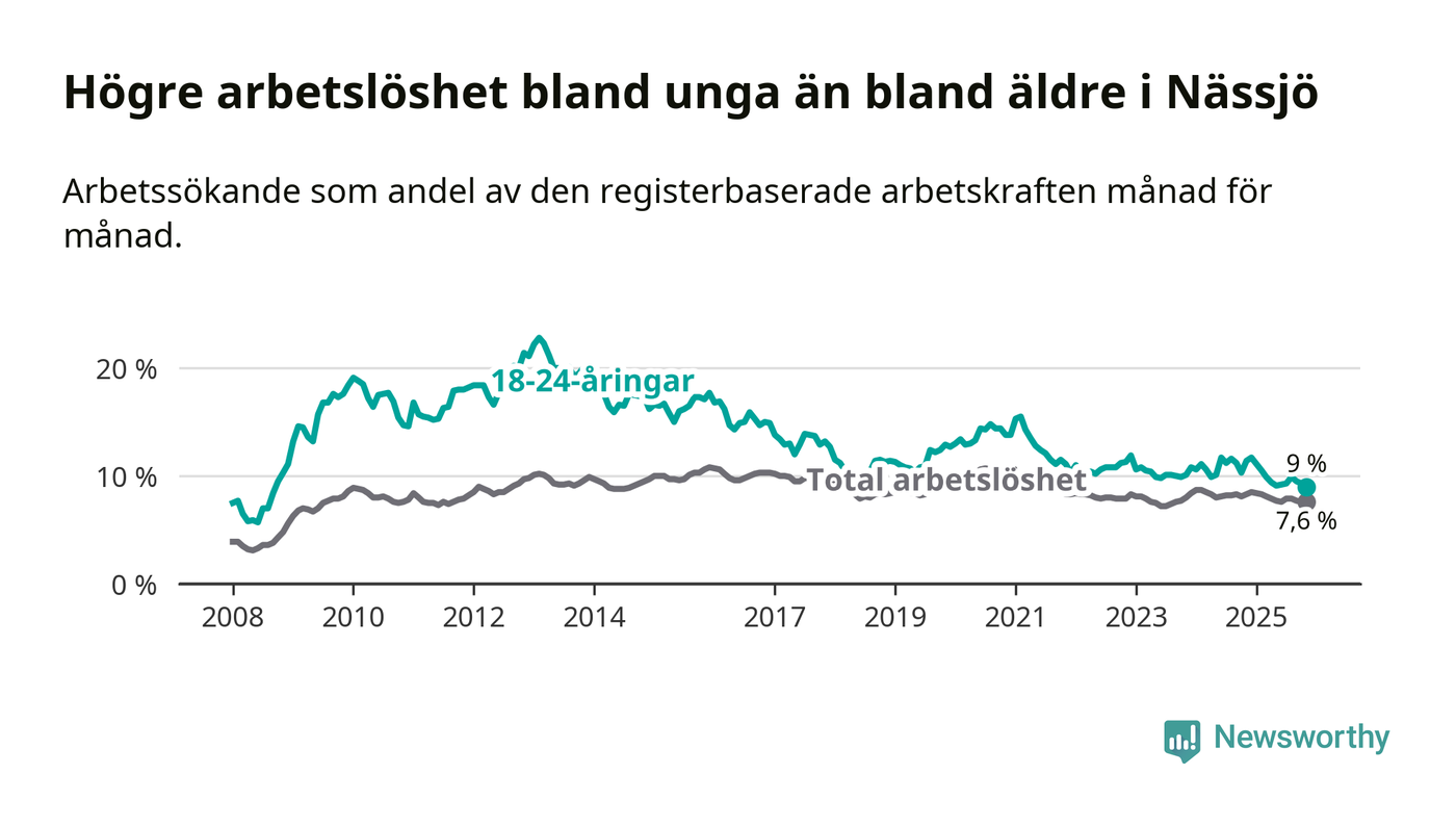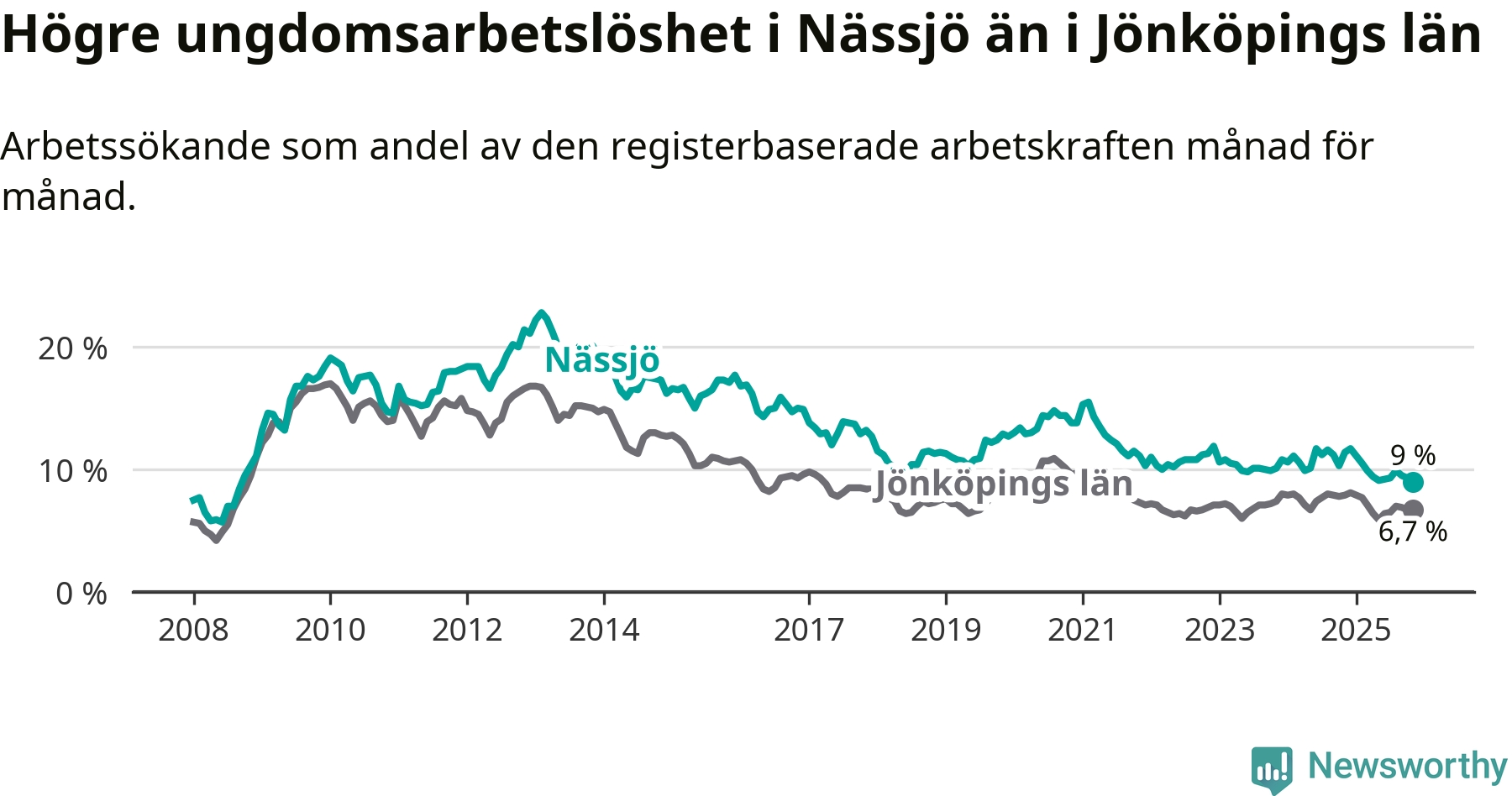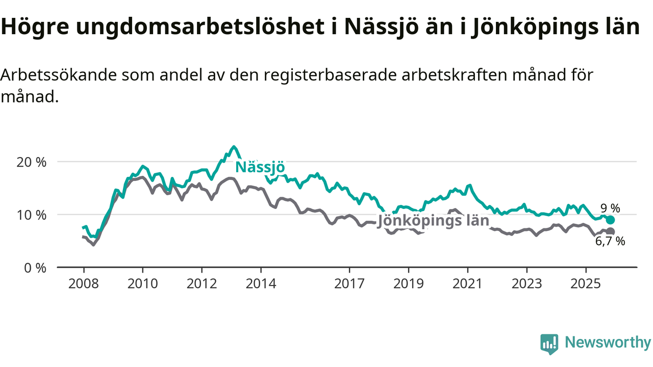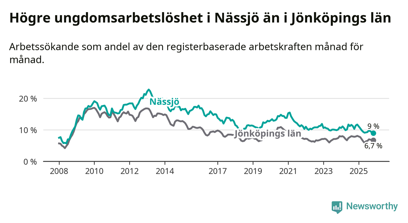 Precis som den totala arbetslösheten ligger ungdomsarbetslösheten i Nässjö högre än i Jönköpings län som helhet. Skillnaden mellan kommunen och länet är 2,3 procentenheter.