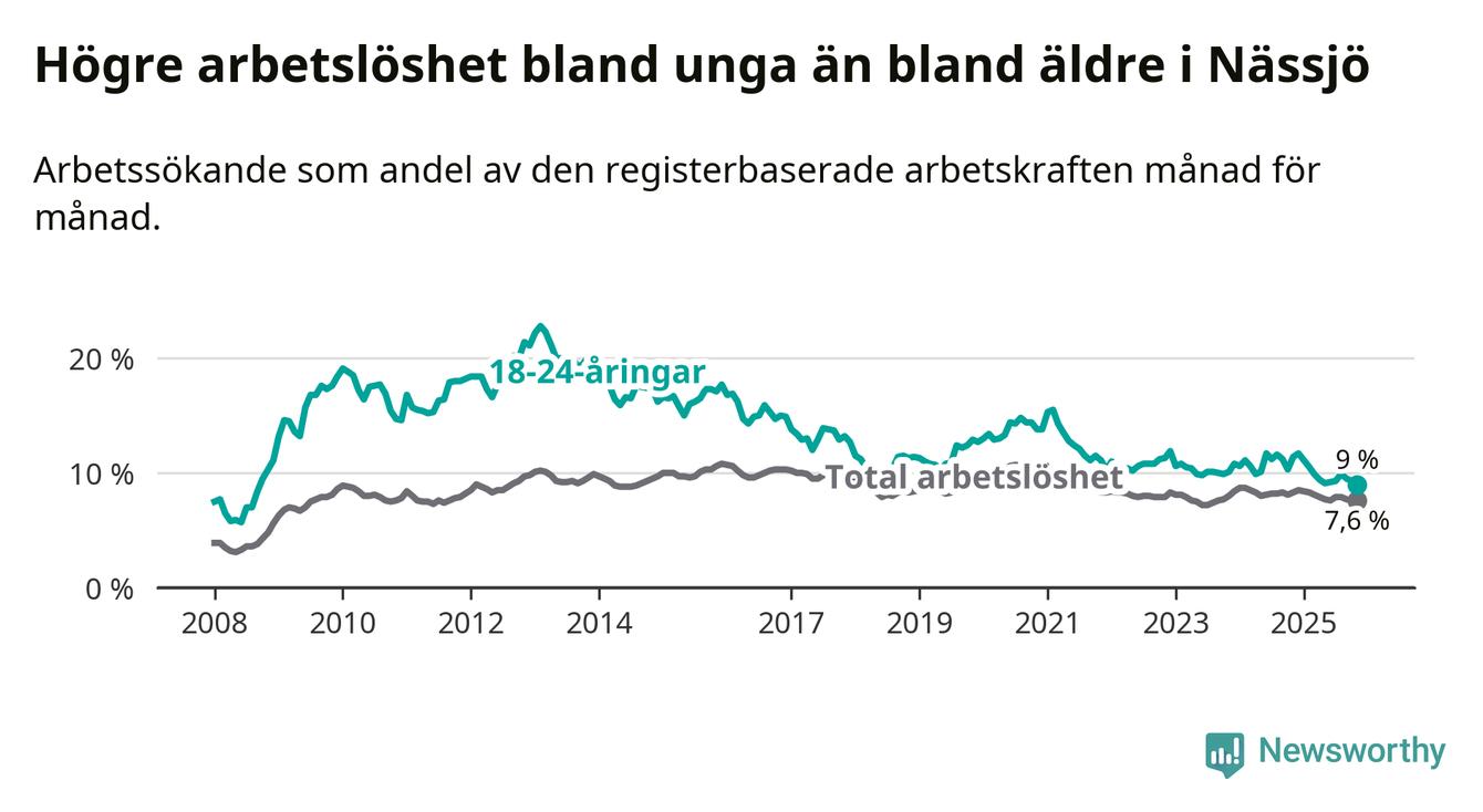 Den senaste månadsstatistiken från Arbetsförmedlingen visar på en nedgång i ungdoms­arbetslöshet i Nässjö kommun med 2,4 procentenheter. Arbetslösheten bland personer i åldern 18–24 år låg i november på 9,0 procent.