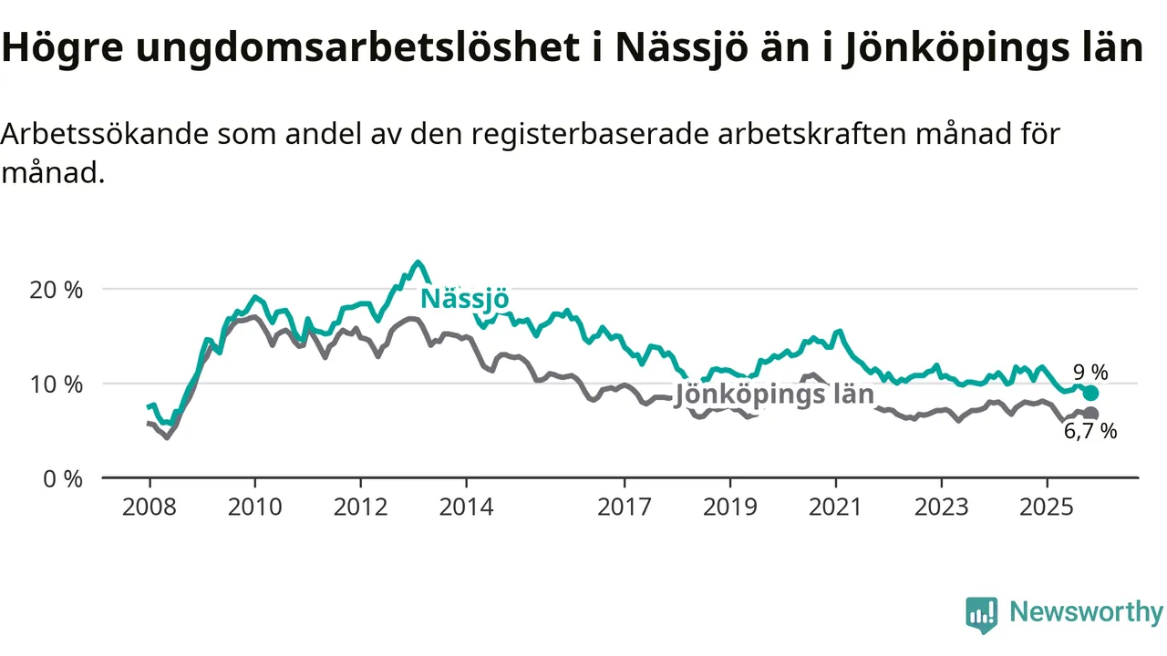 Graf: Arbetslöshet bland unga i Nässjö kommun och Jönköpings län
